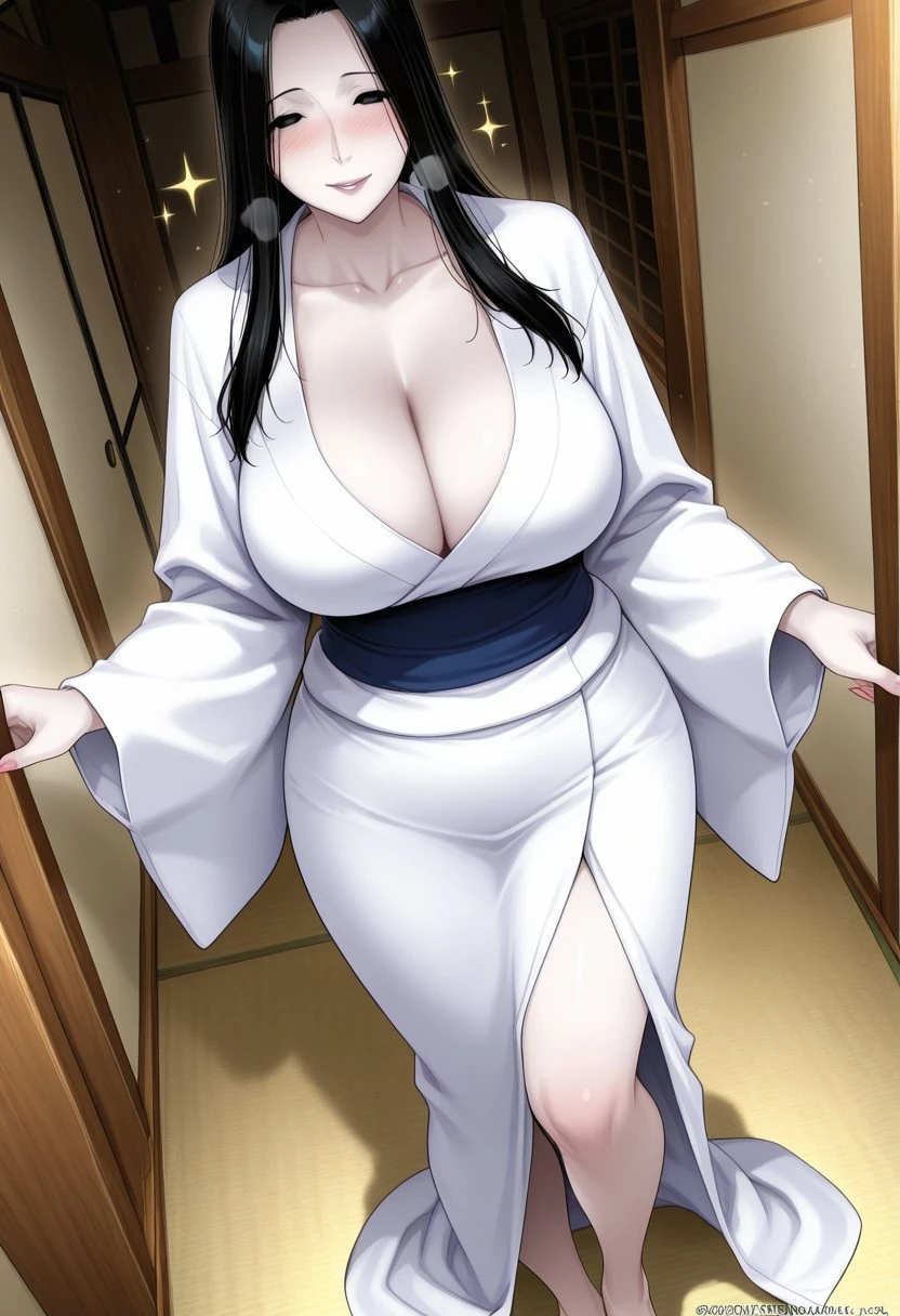 1girl, solo, mature woman, ghost woman, silk hair, very long hair, black hair, cleavage, kimono, huge breasts, pale skin, japanese_clothes, tall woman, barefoot, long_hair, black eyes, normal eyes, shiny skin,