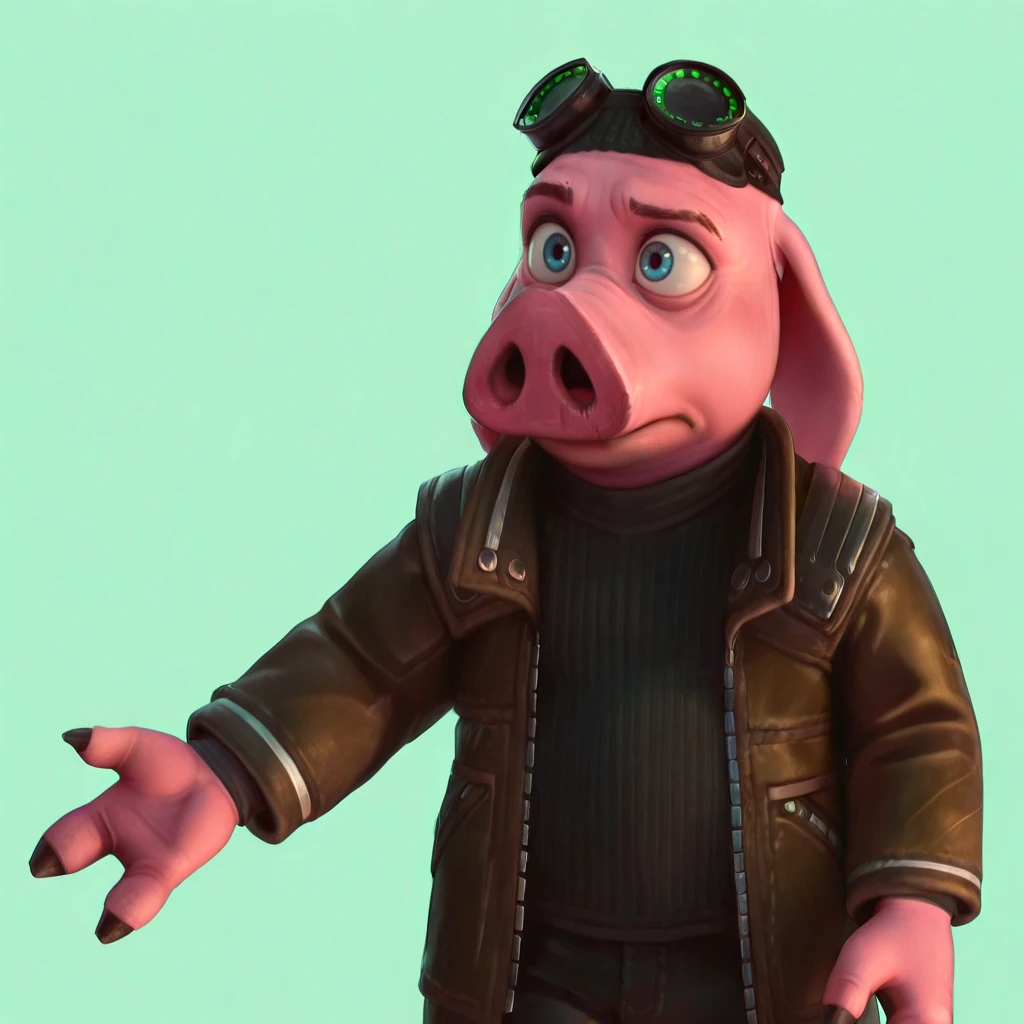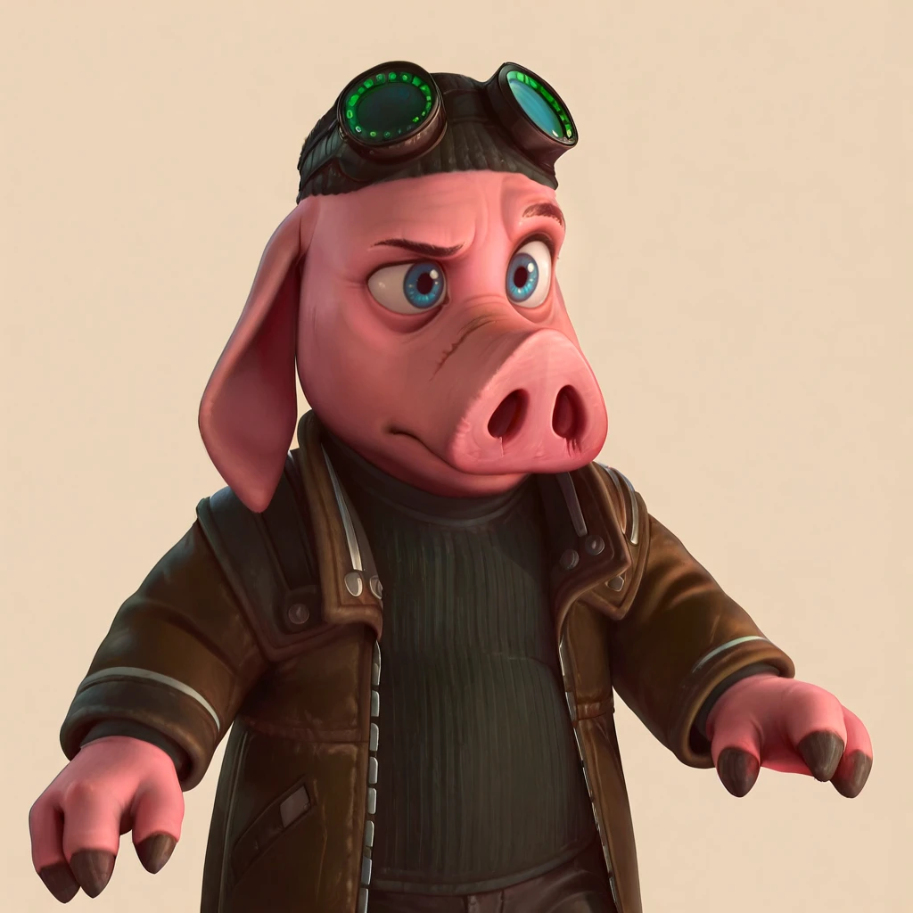 pig, male, mature, pink skin, blue eyes, snout, scar, nostrils, wrinkle, notched eyebrow