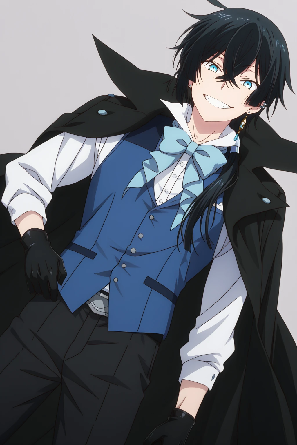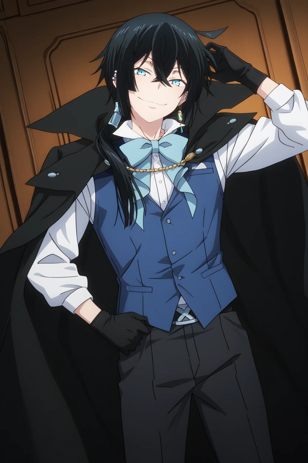 official alternate costume, cyan bowtie, black pants, blue waistcoat, black gloves, elbow gloves, white collared shirt, black cape, white boots, black shoesPost on TensorArt: https://tensor.art/models/859006268134670467?source_id=njuwoVDrnUe0rfcra3f88BUh