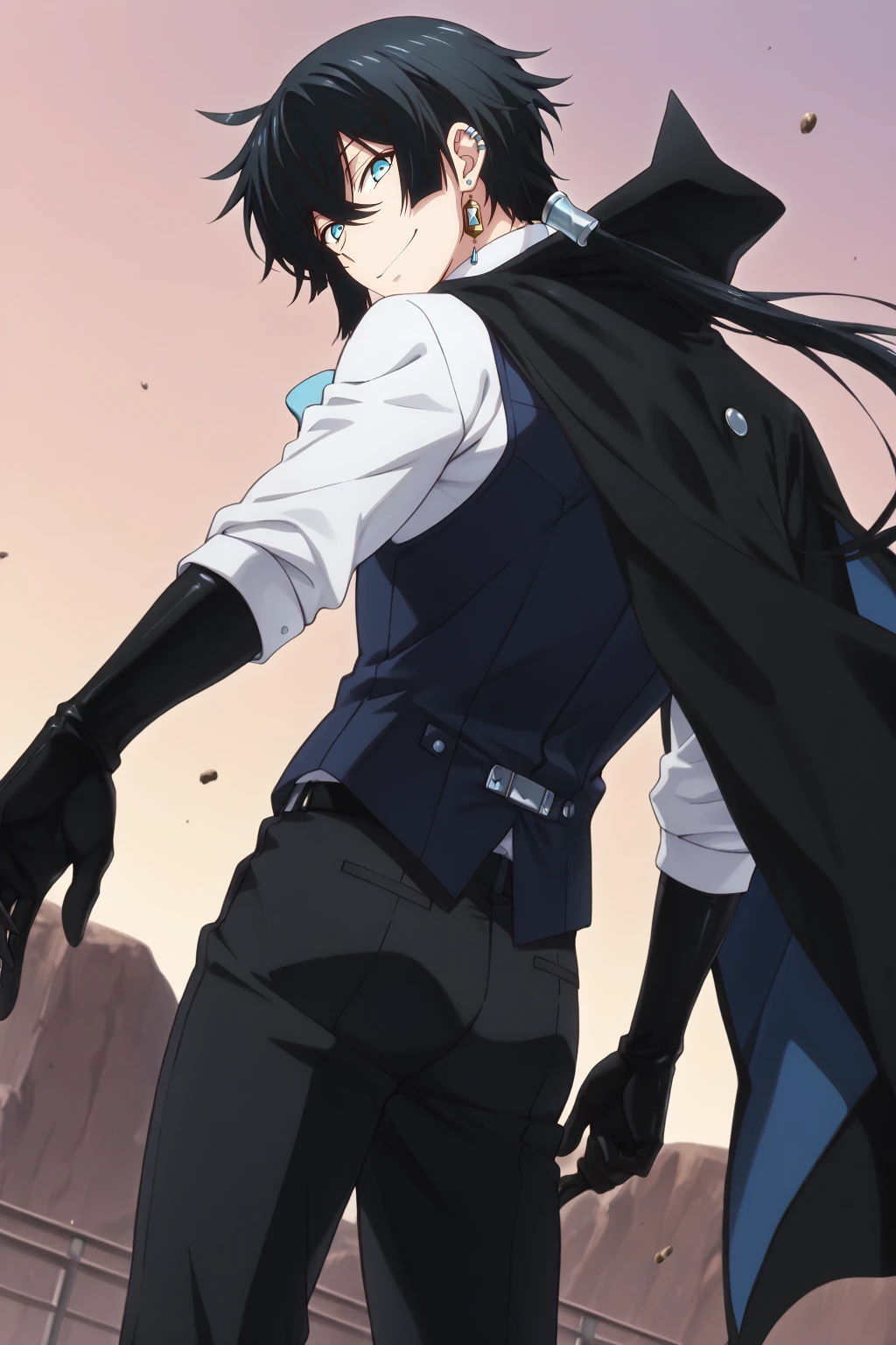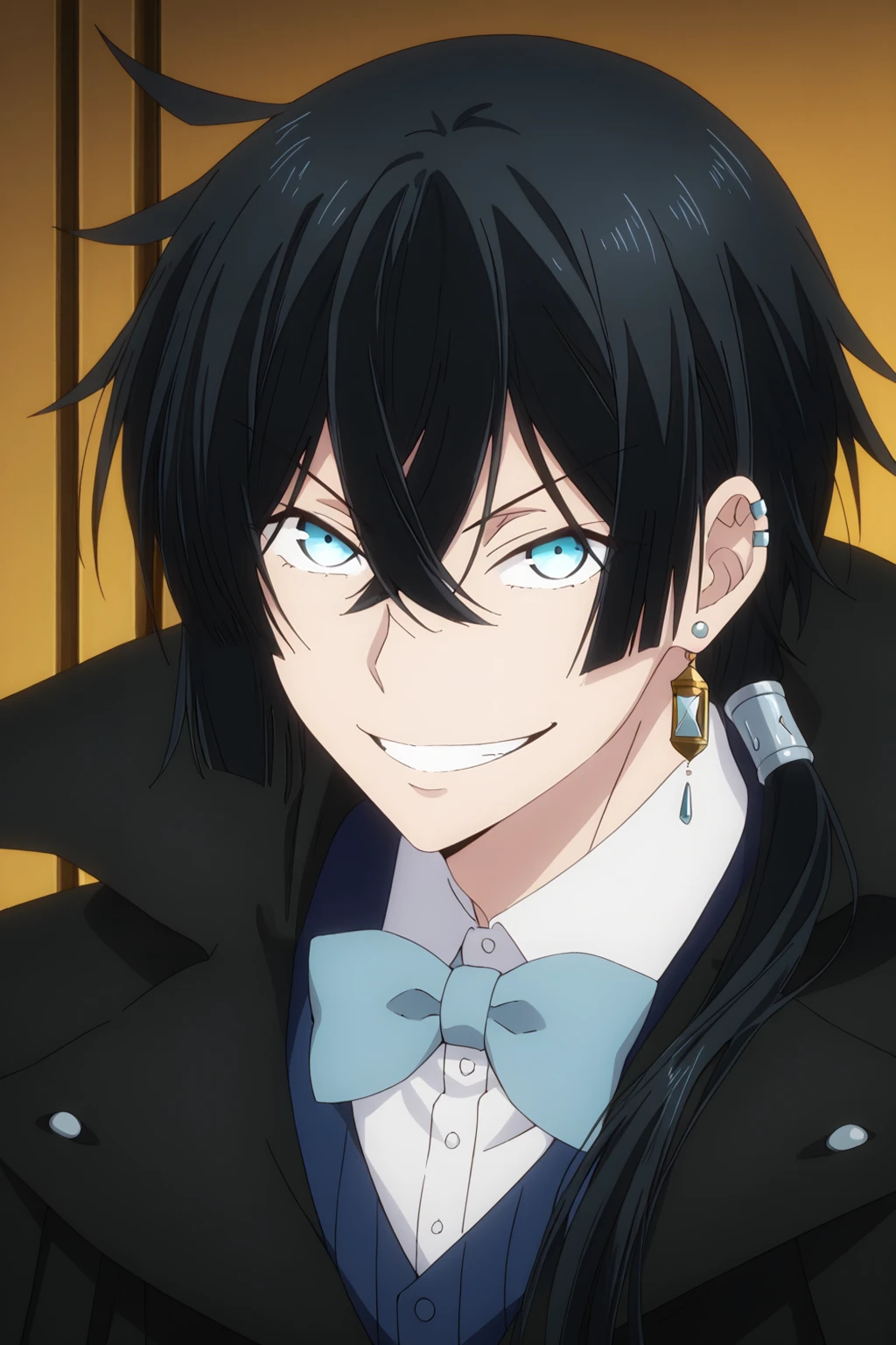 vanitas, vanitas_vnc, black hair, blue eyes, hair between eyes, low ponytail, single earring, ear piercingClothes: