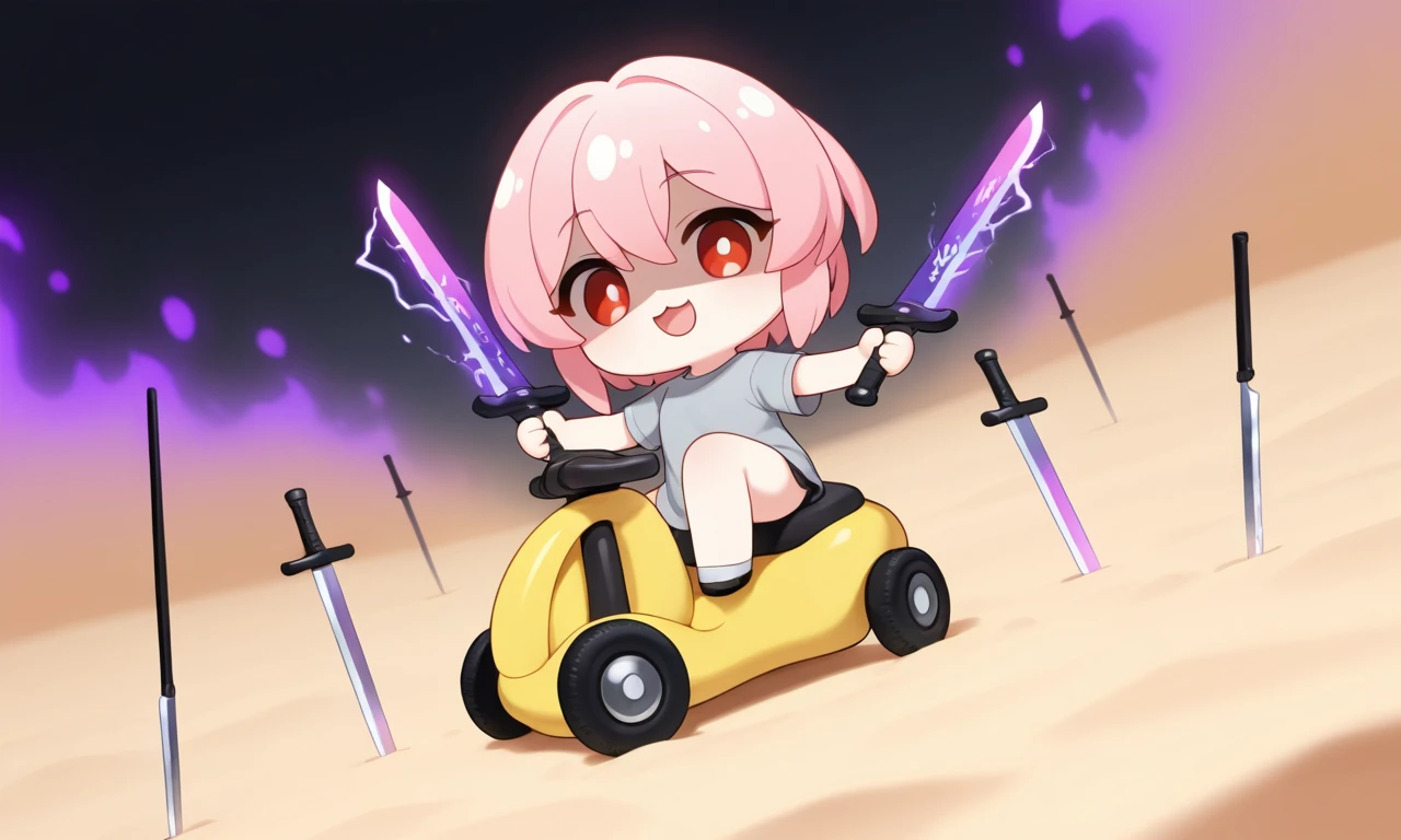 fritia-scooter, 1girl, solo, scooter, red eyes, sitting, hair tie, pink hair, short sleeves, :d, chibi, :3, grey shirt, scooter, on scooter