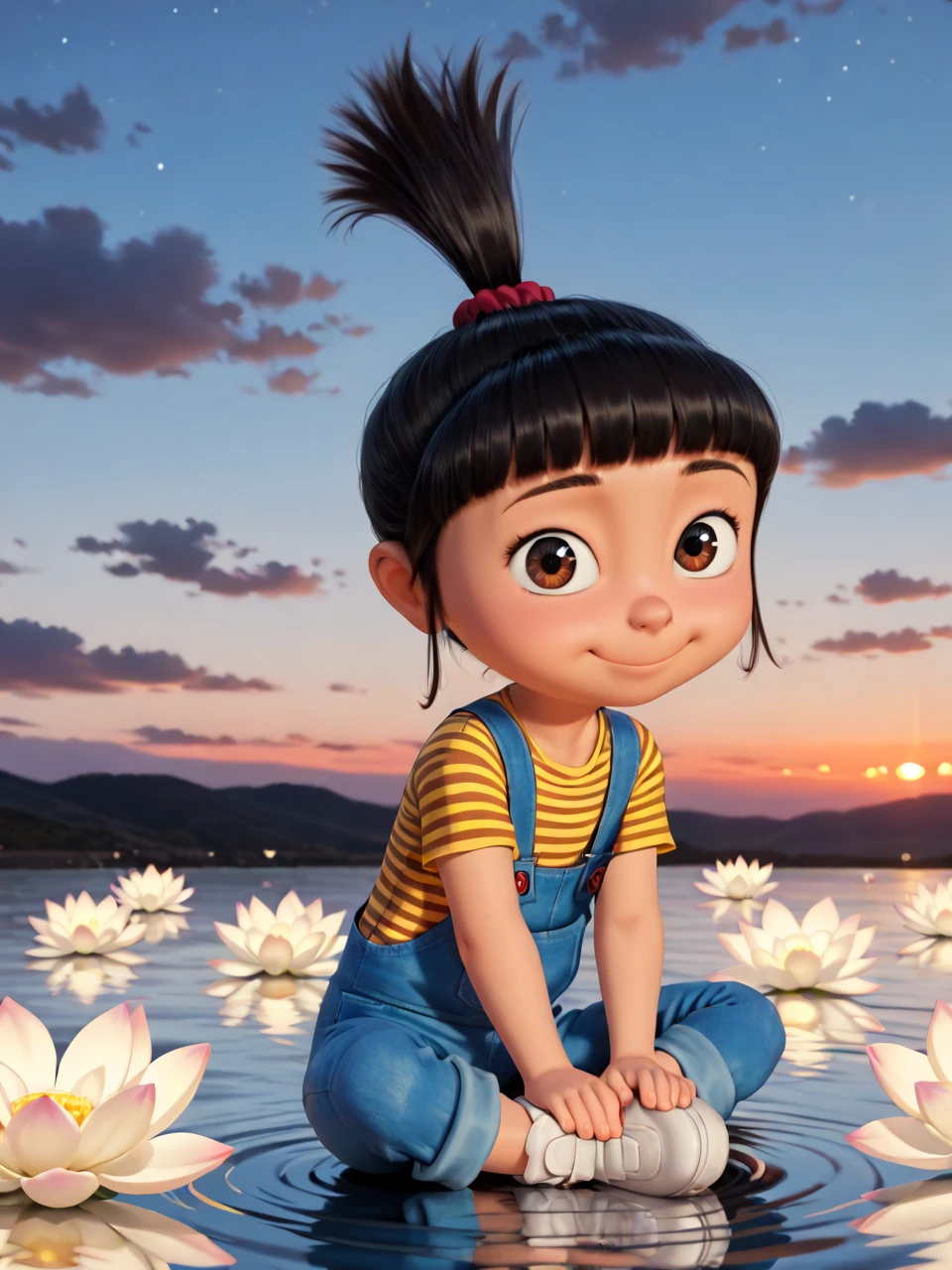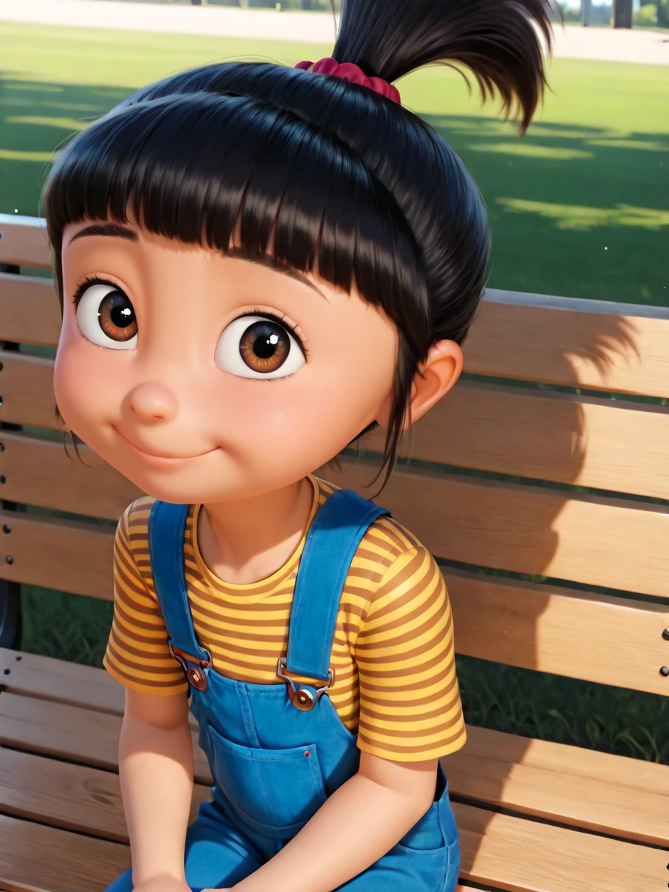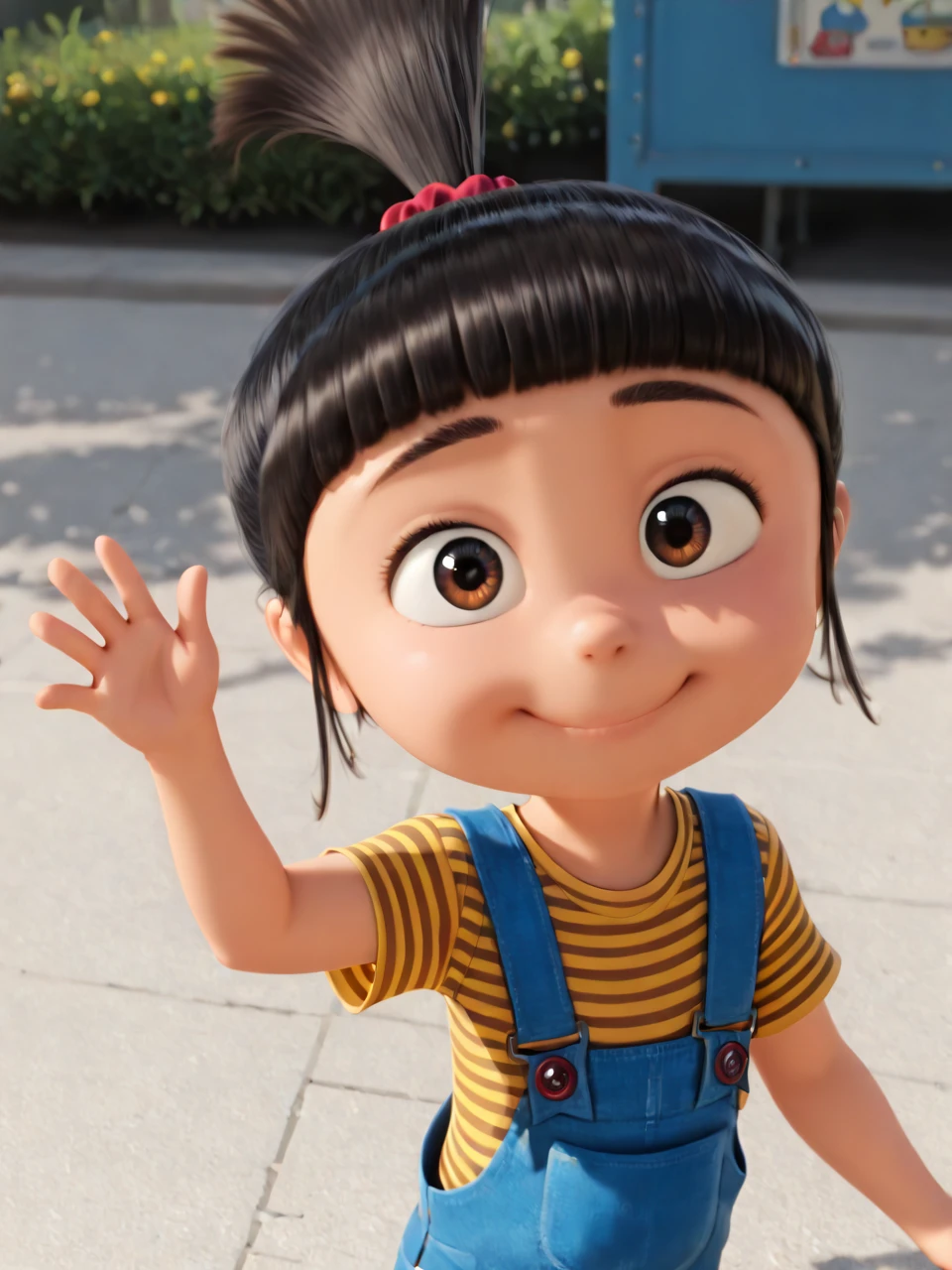 4gn3sG2u, 1girl, solo, smile, black hair, brown eyes, hair ornament, ponytail,