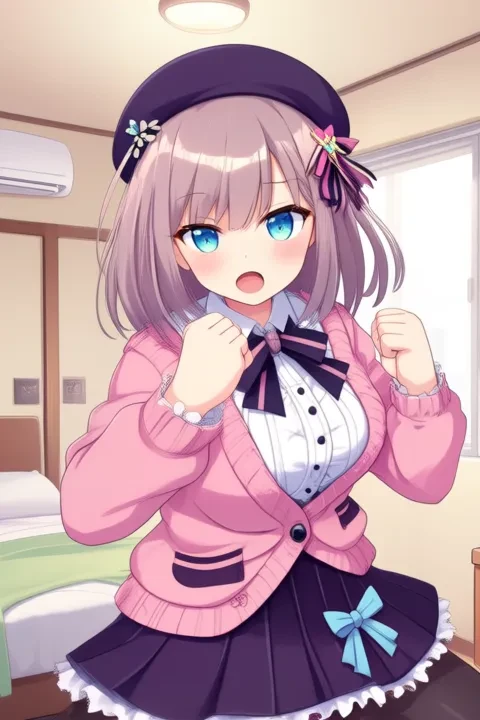 sample prompt:Suzuhara Ruru, anime-style girl. The image features an anime-style character with light purple hair styled in a bob cut. The character has blue eyes and is wearing a pink cardigan over a white blouse with black buttons. The blouse has a large bow tie around the neck and a small black bow on the chest. The character is also wearing a dark purple skirt with a light blue ribbon tied at the waist and a white frilly hem. She is wearing a beret with a small decorative bow on the front. (she is dancing:2.5), (chibi Nendoroid:3.5) in bedroom.