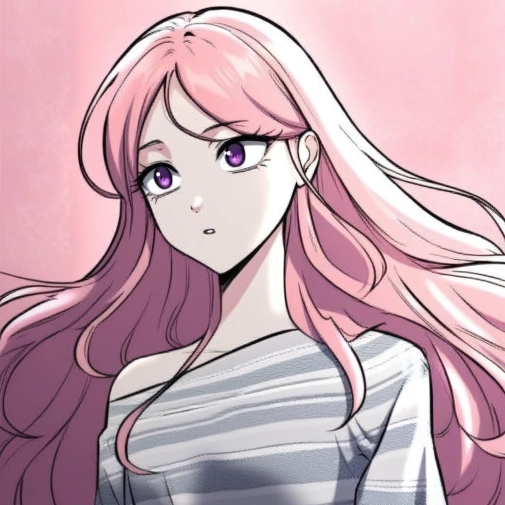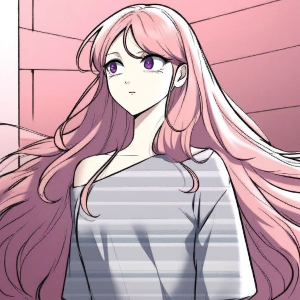 long hair, purple eyes, pink hair, long shirt, bare shoulders