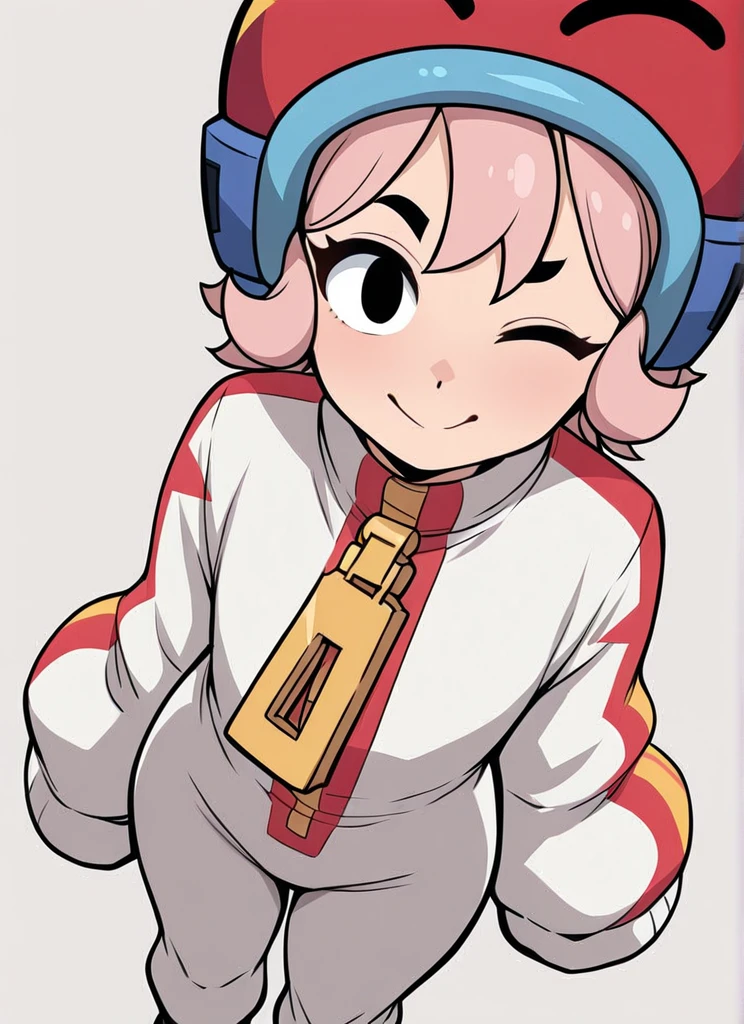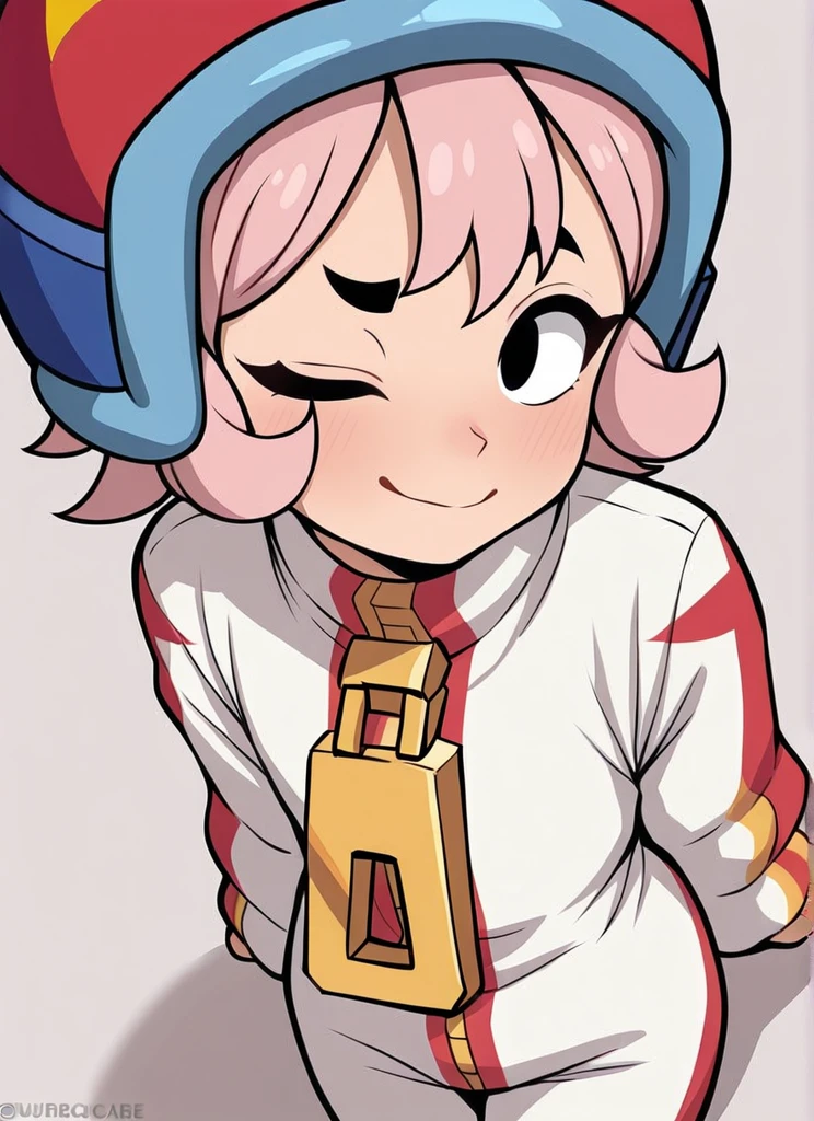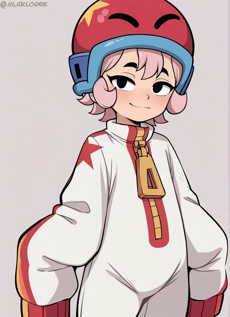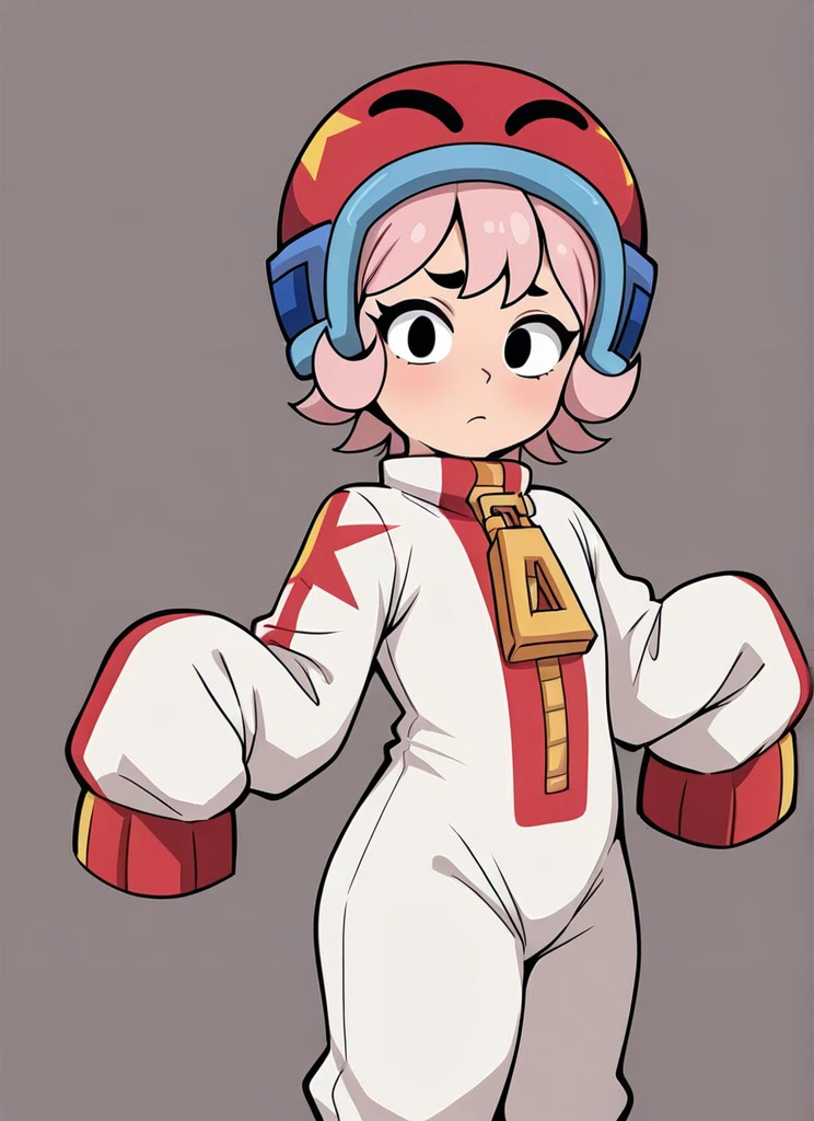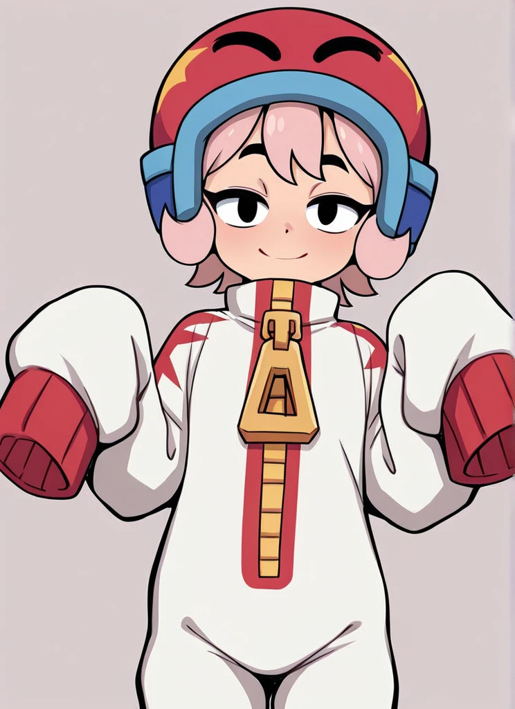 bonniebd , 1girl, pink hair, short hair, black eyes,white bodysuit, mulricolored helmet , white sleeves ,mulricolore sleeves, red helmet, loose clothes,zipper
