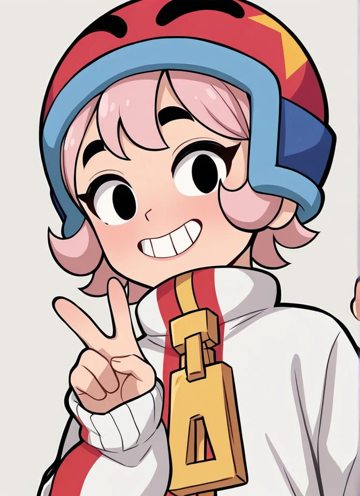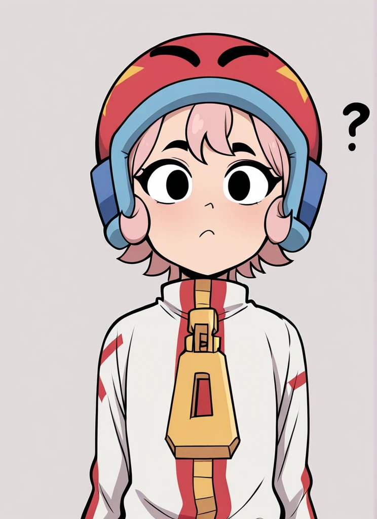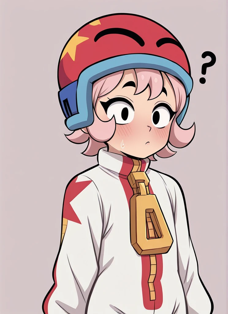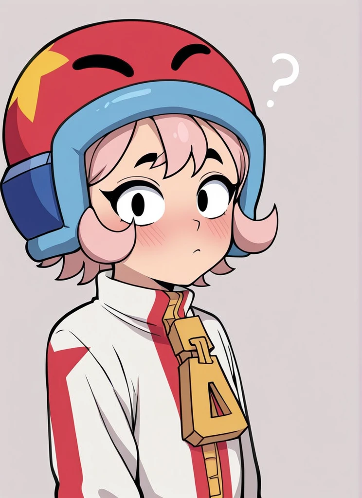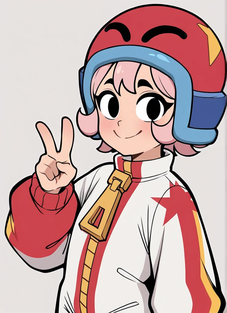 bonniebd , 1girl, pink hair, short hair, black eyes,white bodysuit, mulricolored helmet , white sleeves ,mulricolore sleeves, red helmet, loose clothes,zipper
