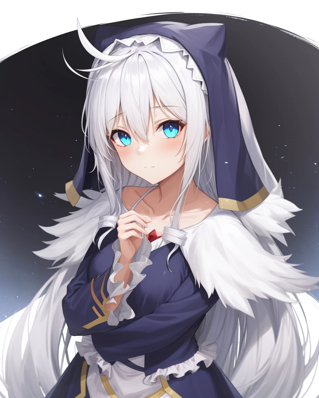 1girl,solo,blue eyes,white hair,hair between eyes, very long hair,Ahoge, collarbone, frills, nun,long sleeves,dress,