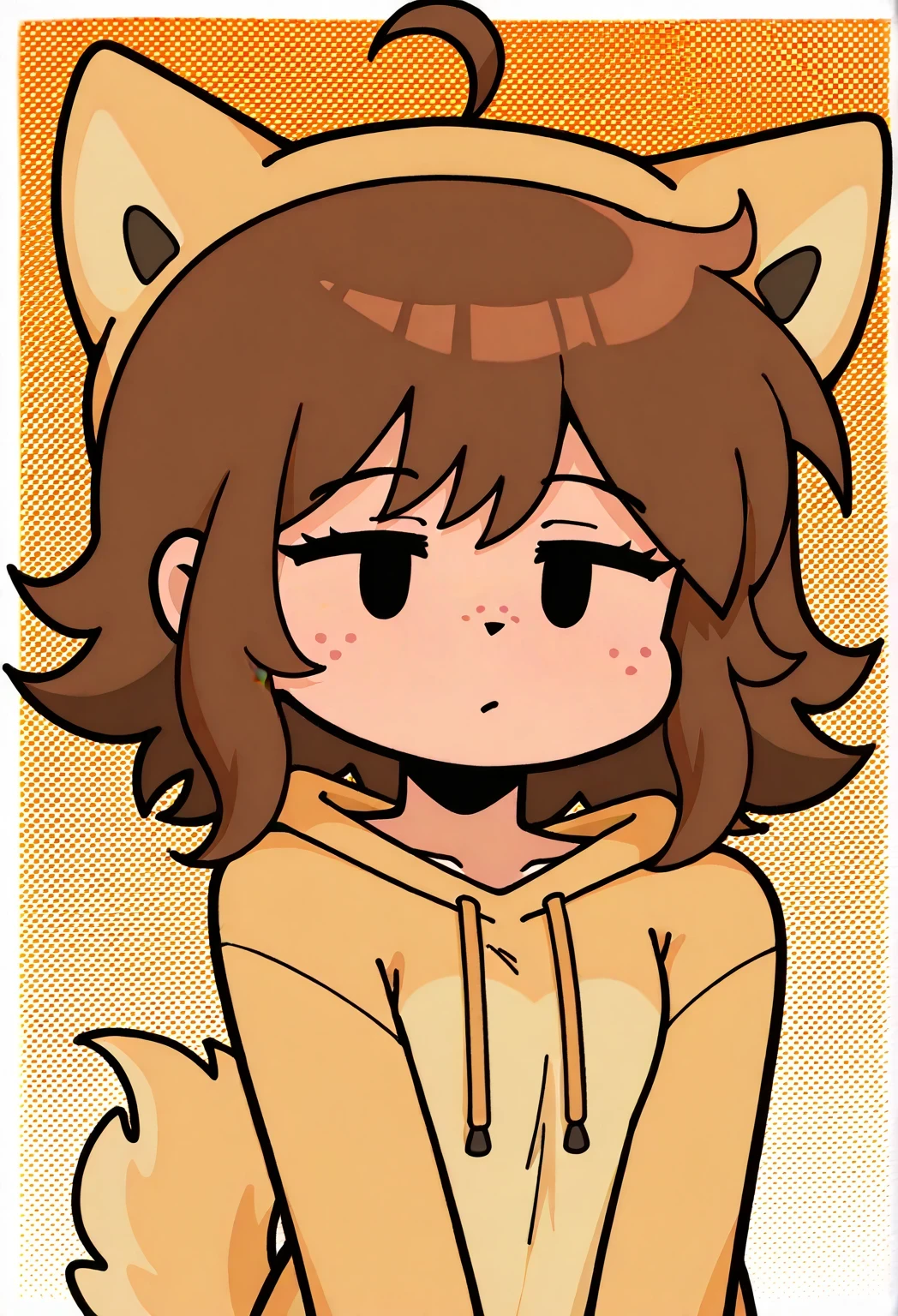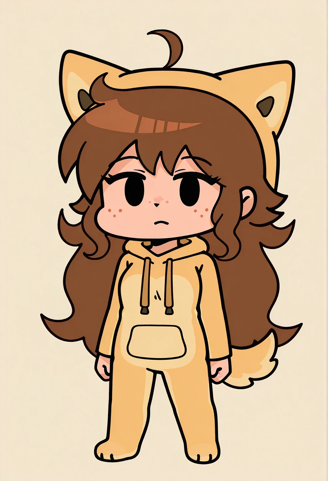 AutumnFNF, 1girl, black eyes, no sclera, tan skin, freckles, brown hair, beige dog pajamas, short, chibi,
