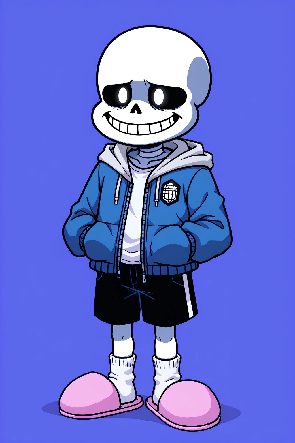 SansFHFHF, 1boy, cartoon skeleton, white eyes, black sclera, blue zip-up jacket, white shirt, black shorts, white socks, oversized pink slippers, short, chibi, inaccurate skeleton, skeleton, white skin,