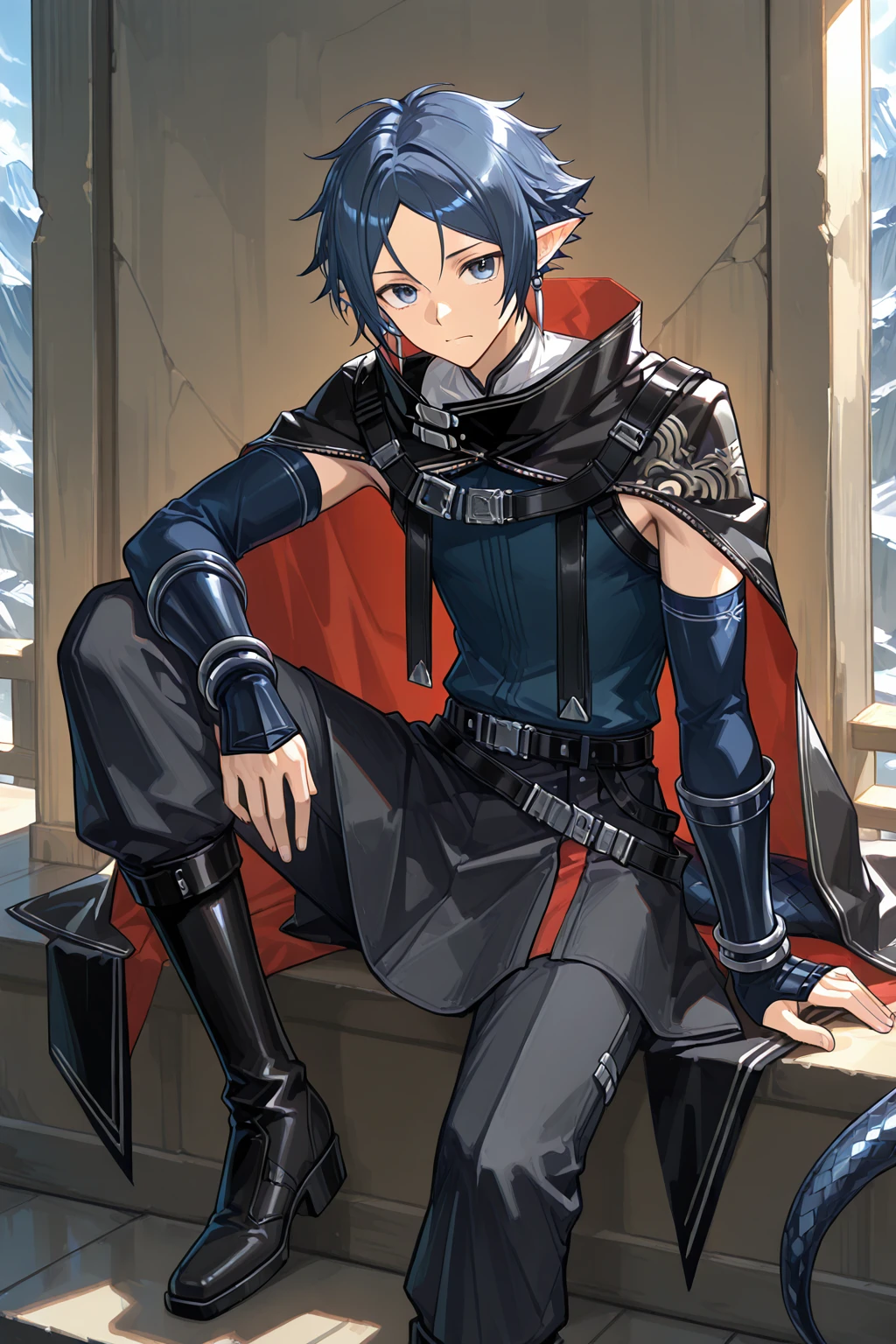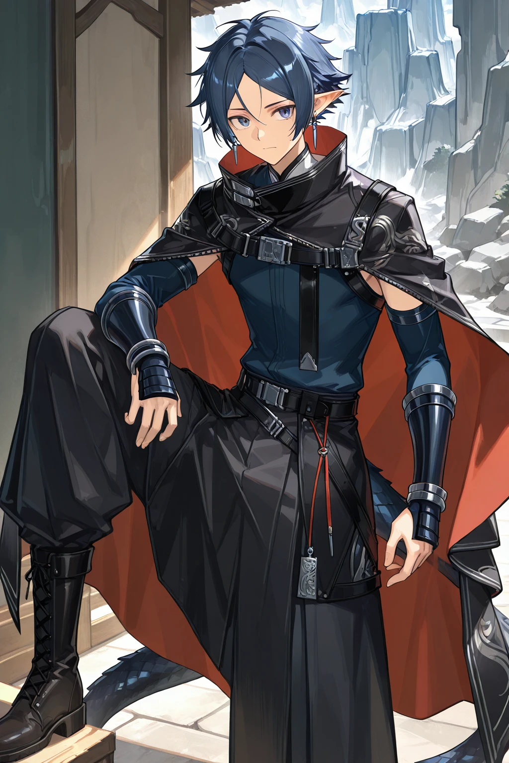 default, jewelry, blue shirt, sleeveless shirt, black cloak, earrings, belt,snake tail, cape, boots, skirt