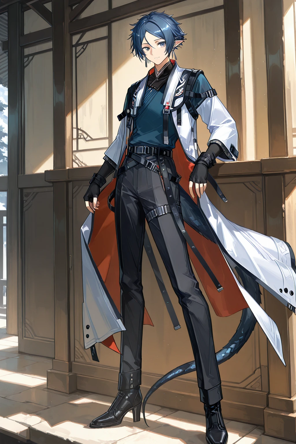 zuole, blue_hair, blue_eyes, pointy_ears, skin1, pants, black footwear, black gloves, black pants, white coat, jewelry, high heels, fingerless gloves, snake tail, black belt, earrings,