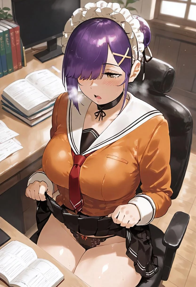 choker, white sailor collar,orange jacket,red necktie,long sleeves, black skirt,pleated skirt,short skirt, black panties, mature panties