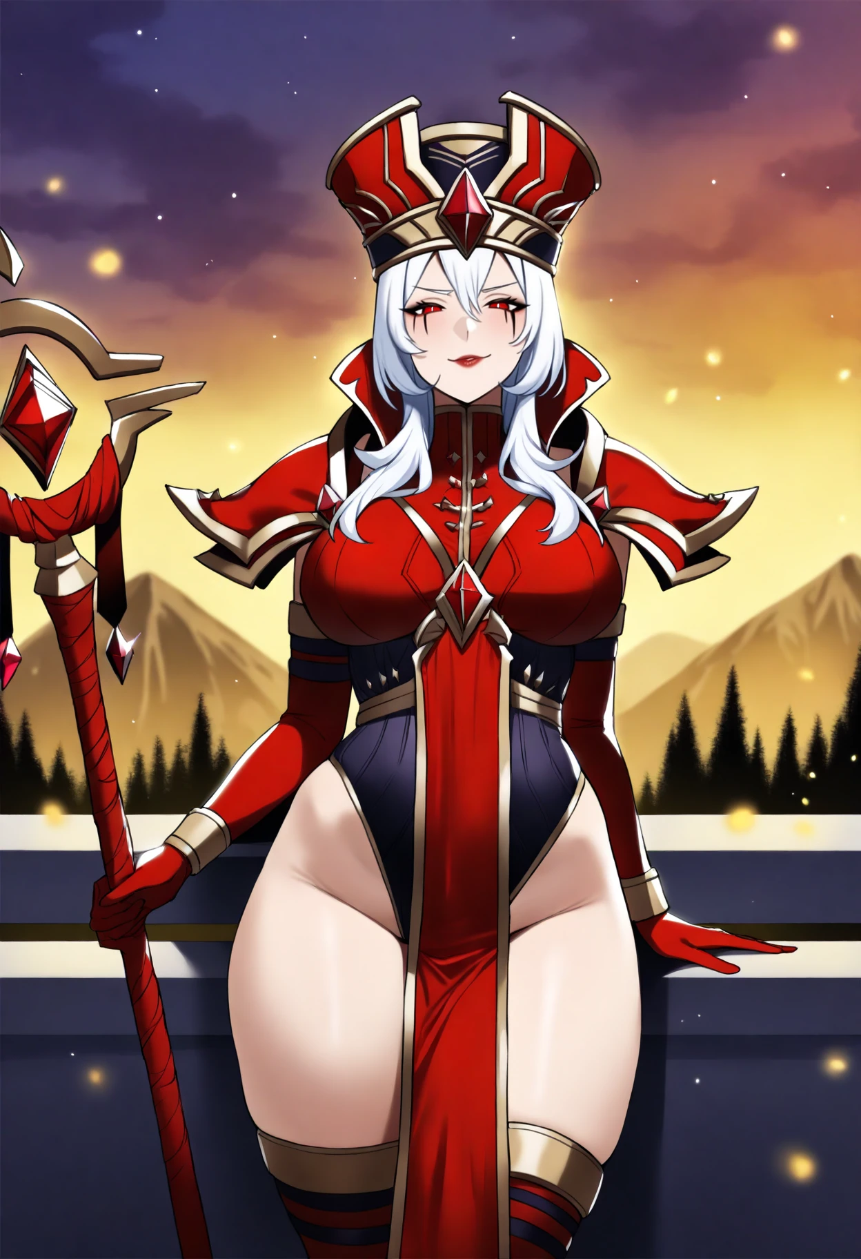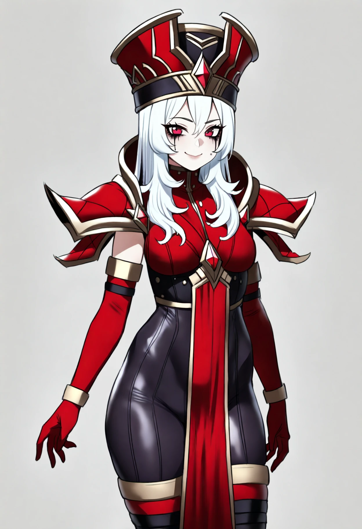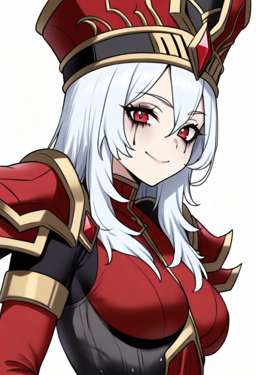 1girl, sallywhitemane, white hair, long hair, red eyes, makeup, hat