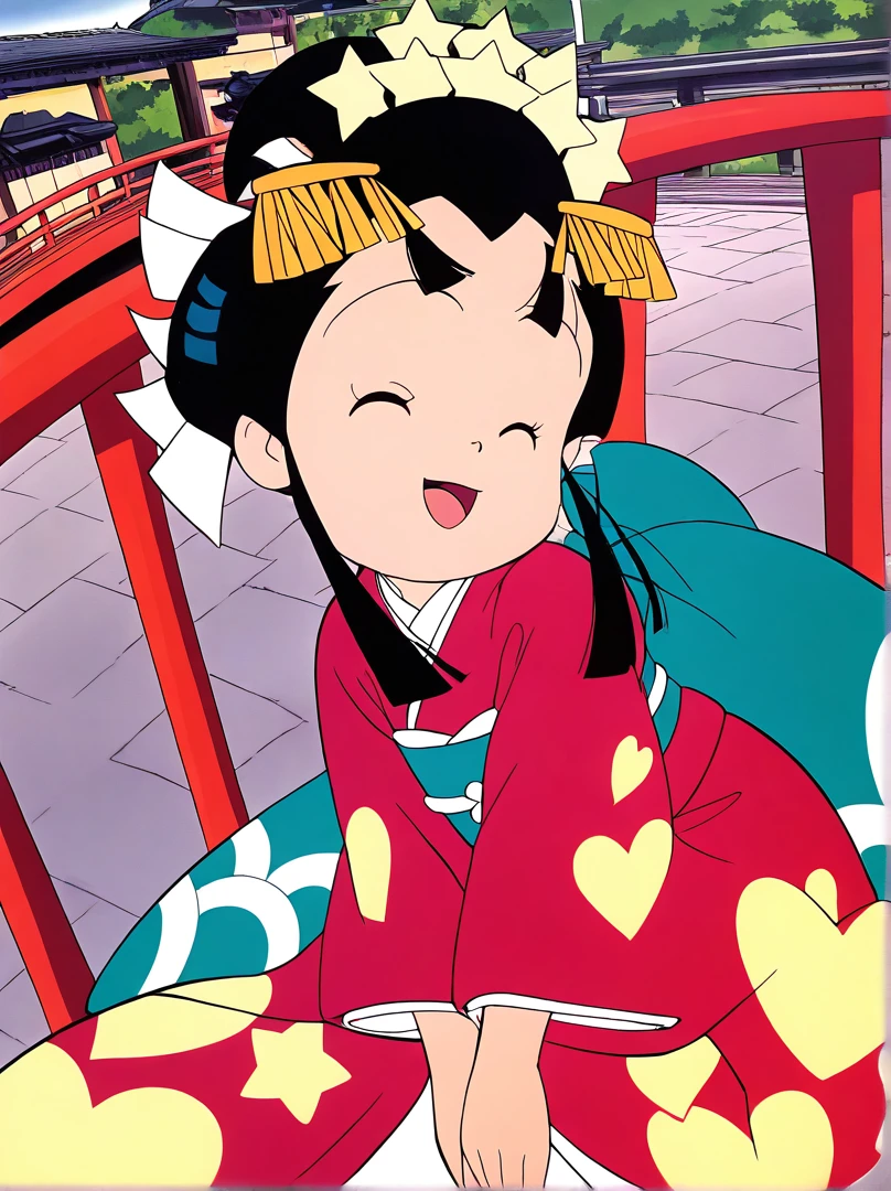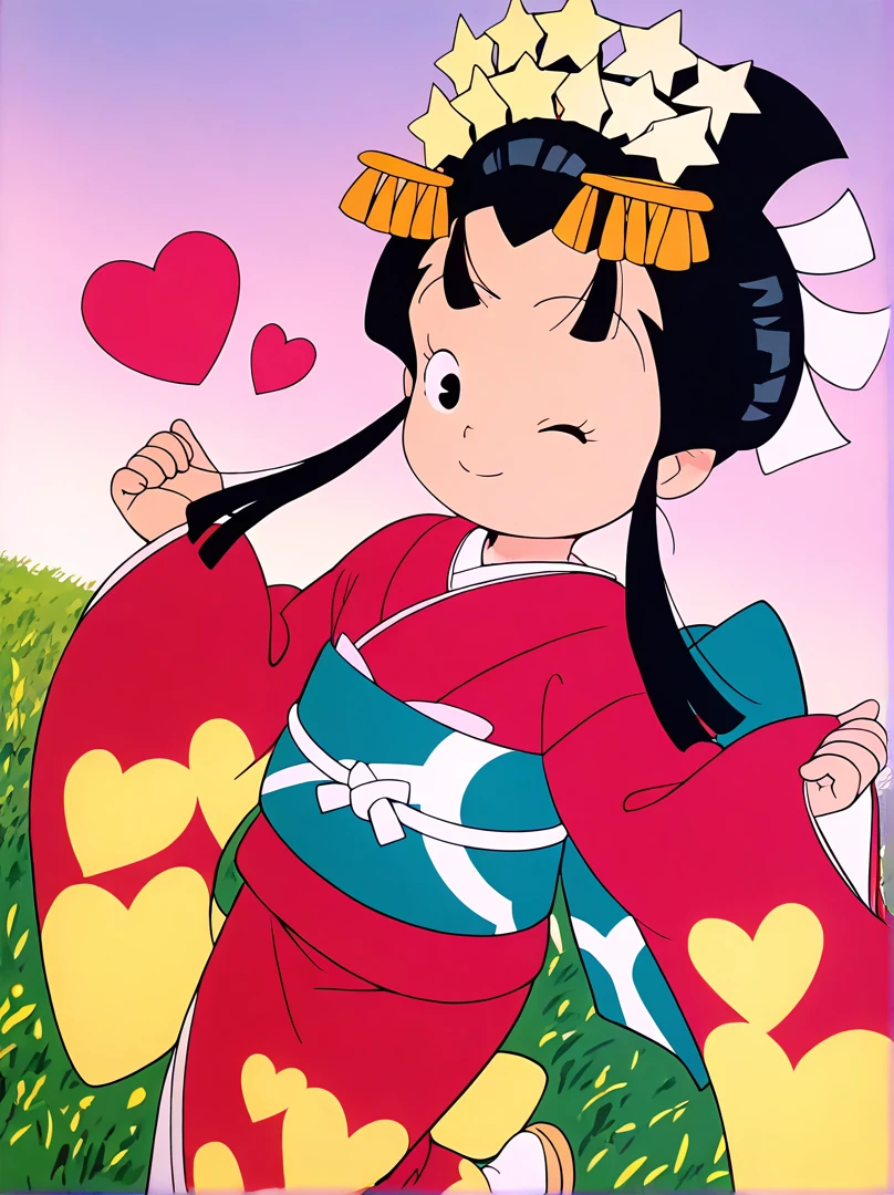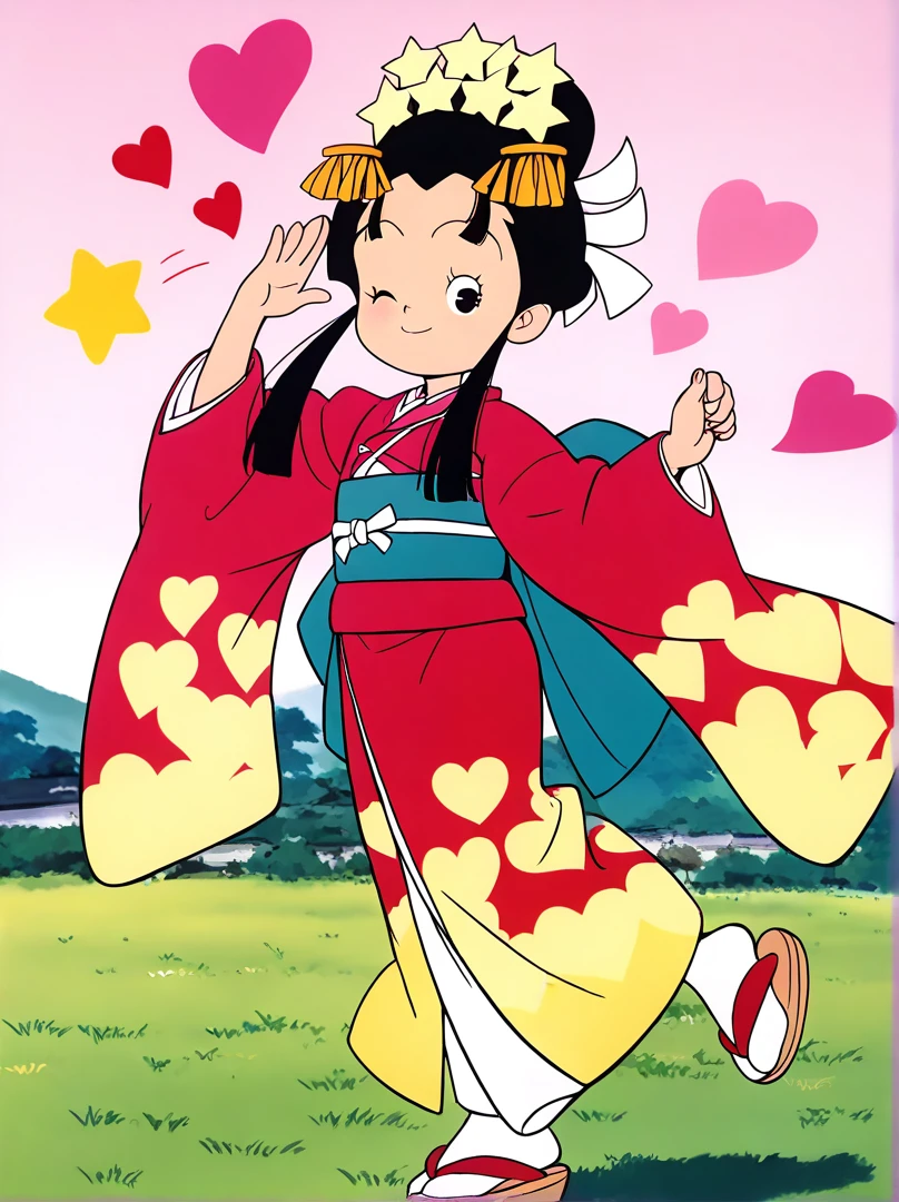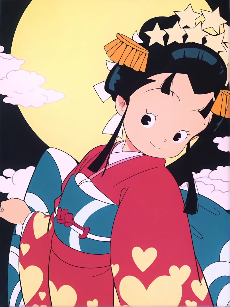 Anmitsu_hime, 1girl, solo, black hair, hair ornament, kanzashi, hair white ribbon, bangs black eyes, heart, star (symbol), sidelocks,