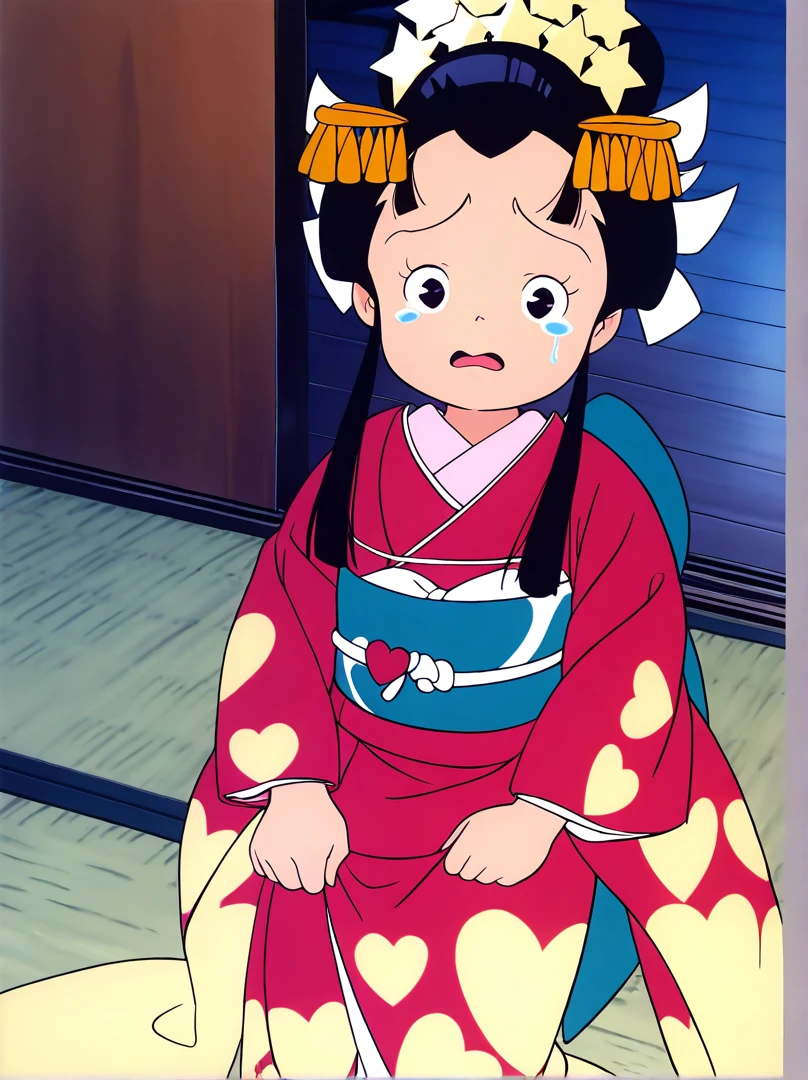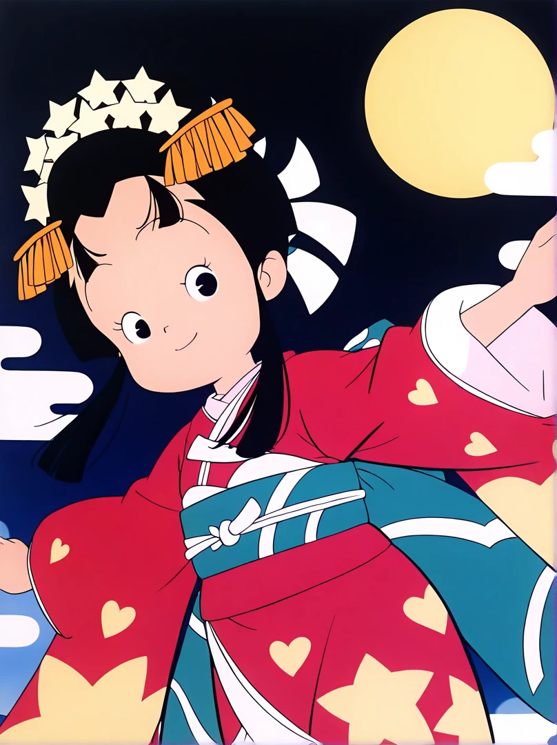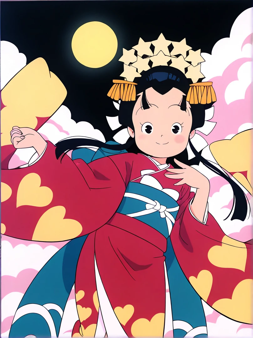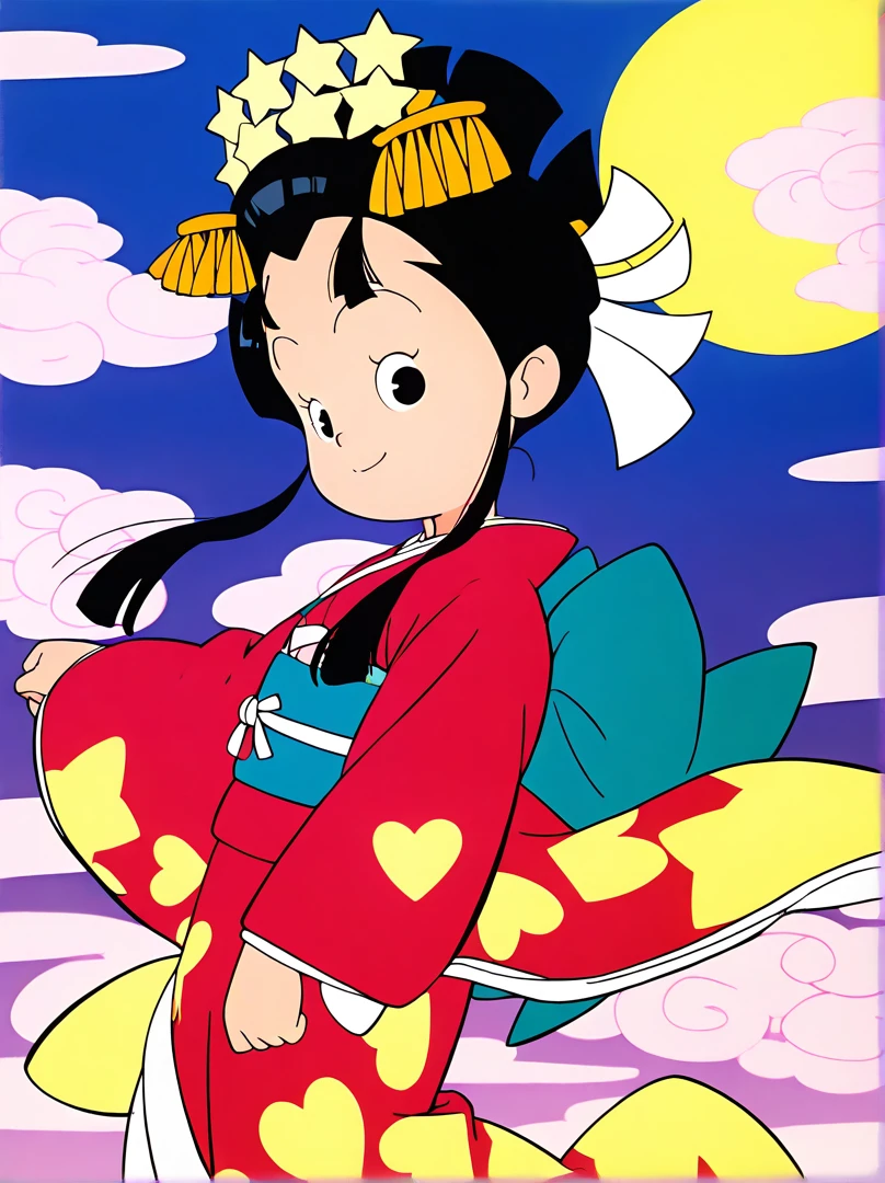 Anmitsu_hime, 1girl, solo, black hair, hair ornament, kanzashi, hair white ribbon, bangs black eyes, heart, star (symbol), sidelocks,