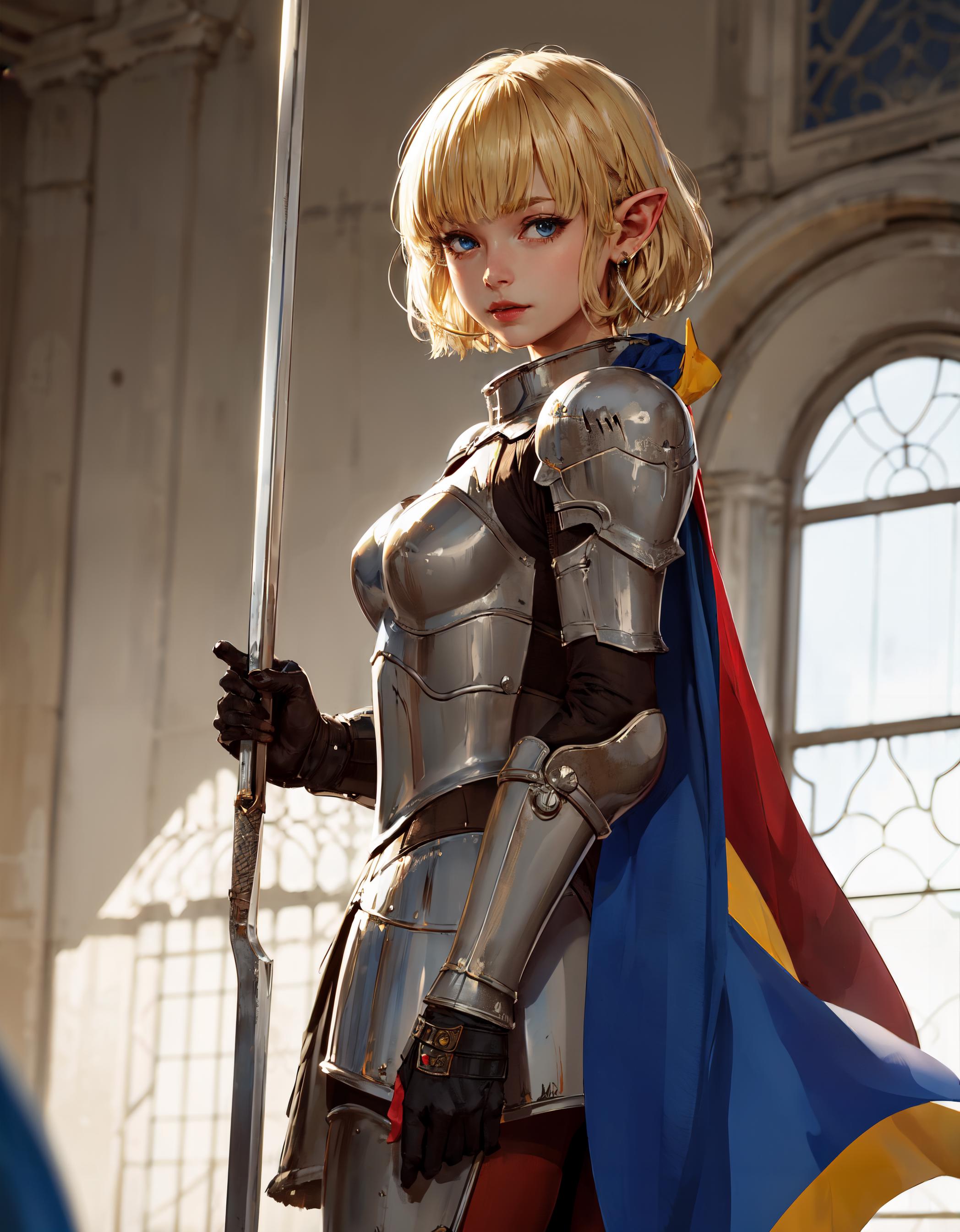 Tags: jeannesmt, armor, blonde hair, blue eyes, short hair, cape, knight, greaves