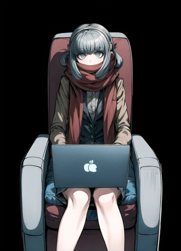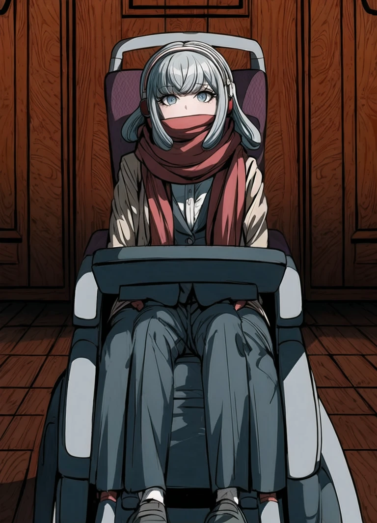 Standard outfit in wheelchair: Miaya Gekkogahara, 1girl, white dress shirt, long red scarf, blue eyes, pale brown jacket, blue-gray hair, headphones, wheelchair, black vest, silver laptop, Danganronpa
