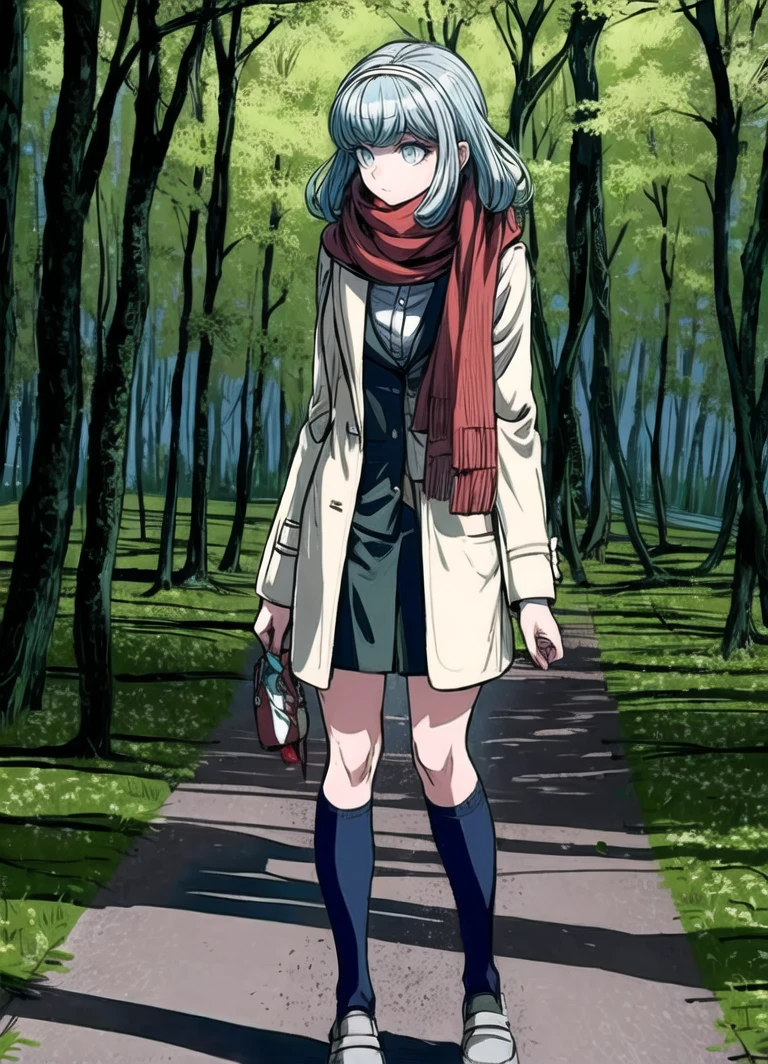 Standard outfit standing 1girl, Miaya Gekkogahara, standing, full body, blue-gray hair, light gray headband, blue eyes, long eyelashes, pale brown jacket, black vest, white dress shirt, black skirt, black socks, white slippers, dark red scarf