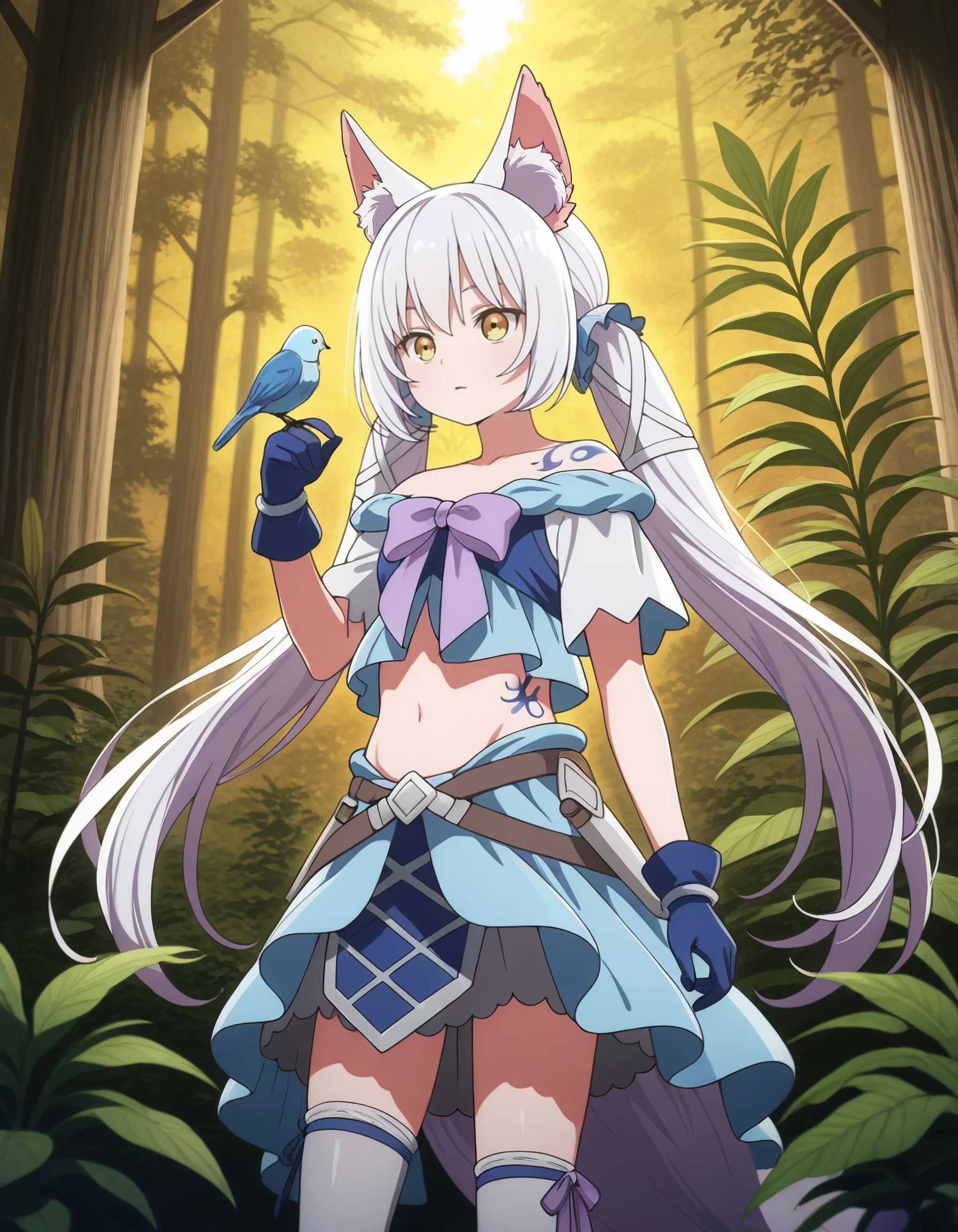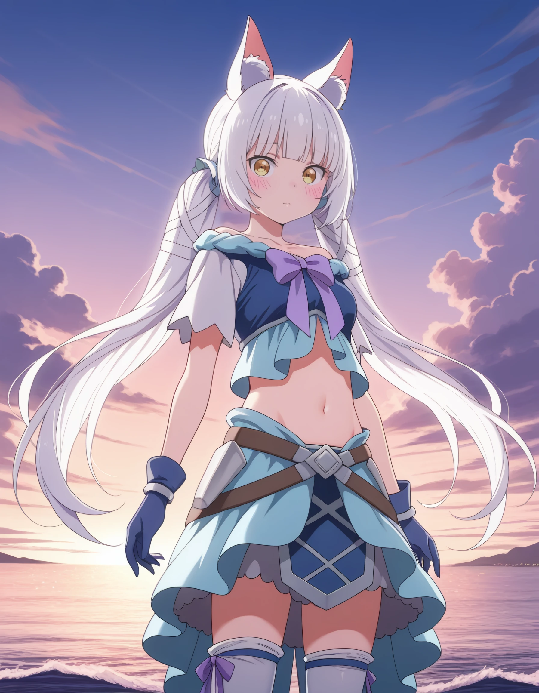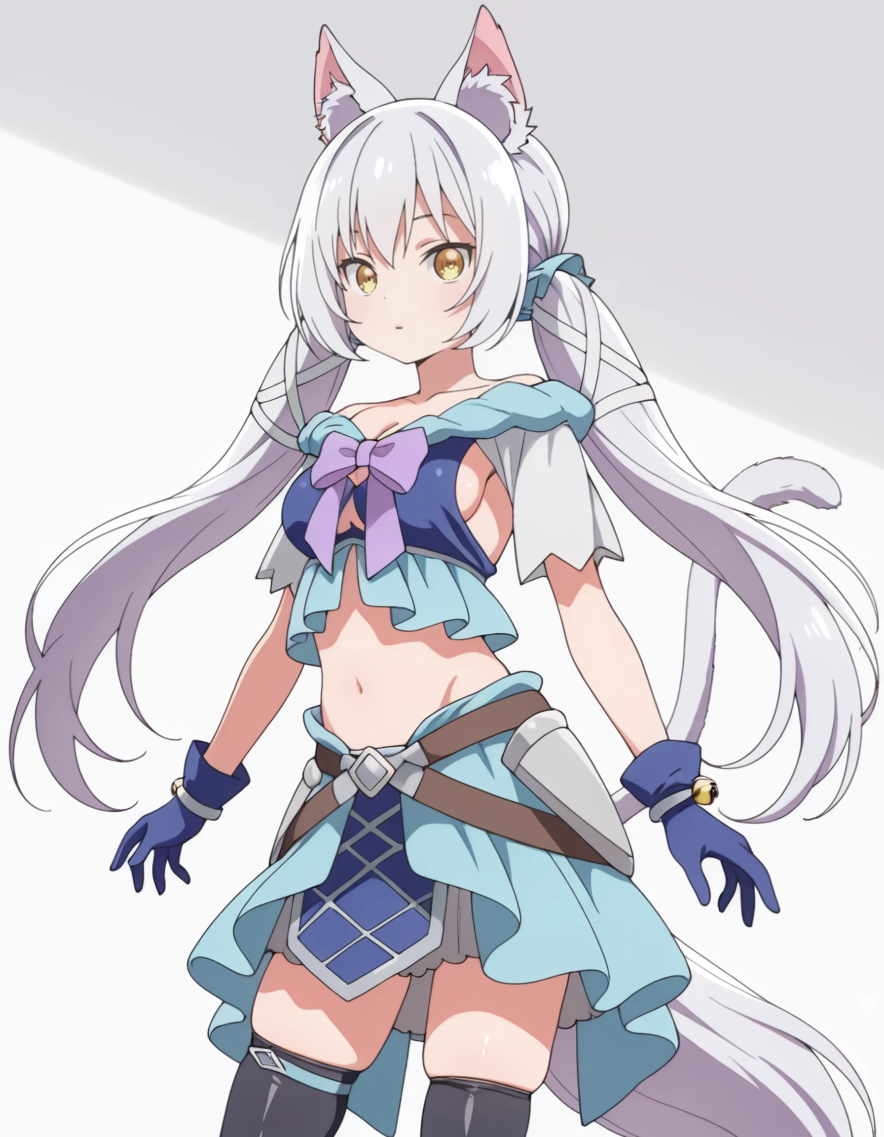 bow, ribbon, gloves, skirt, midriff, thighhighs