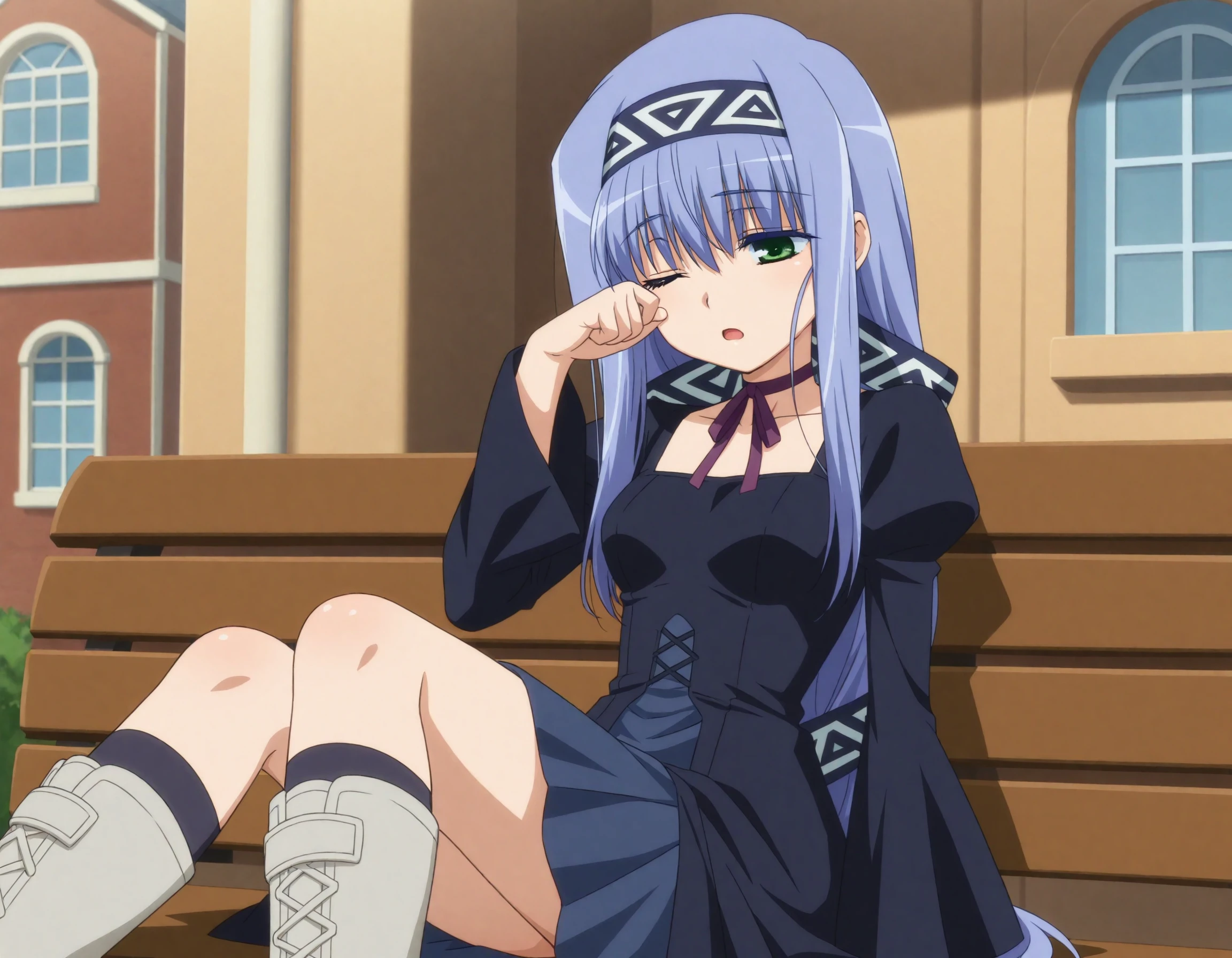 blue hair,very long hair,low-tied long hair,green eyes,sidelocks,bangs,hair ribbon,triangle print black ribbon, purple neck ribbon,black dress,juliet sleeves,long sleeves,wide sleeves, layered dress,short dress,black overskirt,dark blue pleated skirt, black socks,belt boots,light grey boots,knee boots,