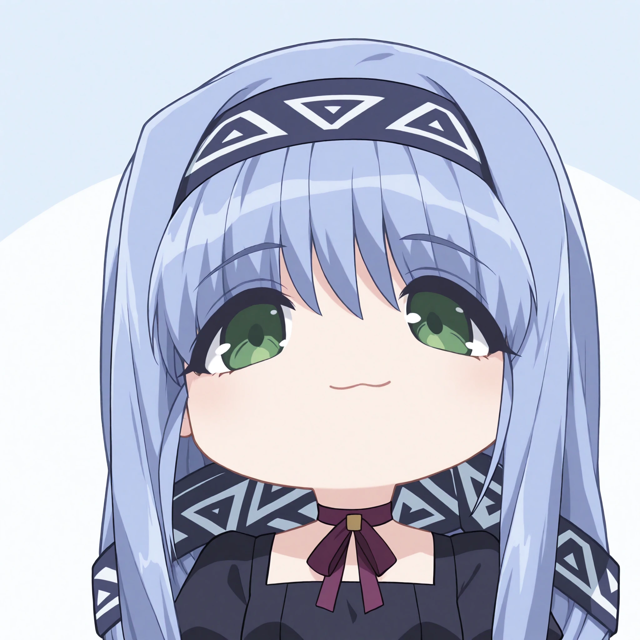 blue hair,very long hair,low-tied long hair,green eyes,sidelocks,bangs,hair ribbon,triangle print black ribbon,