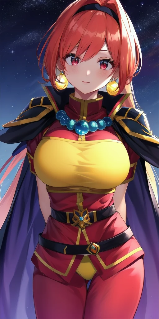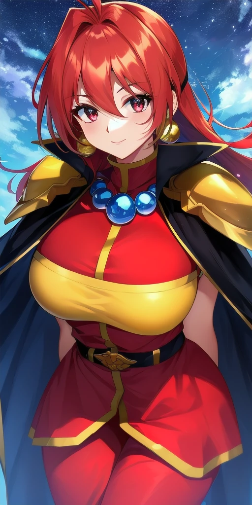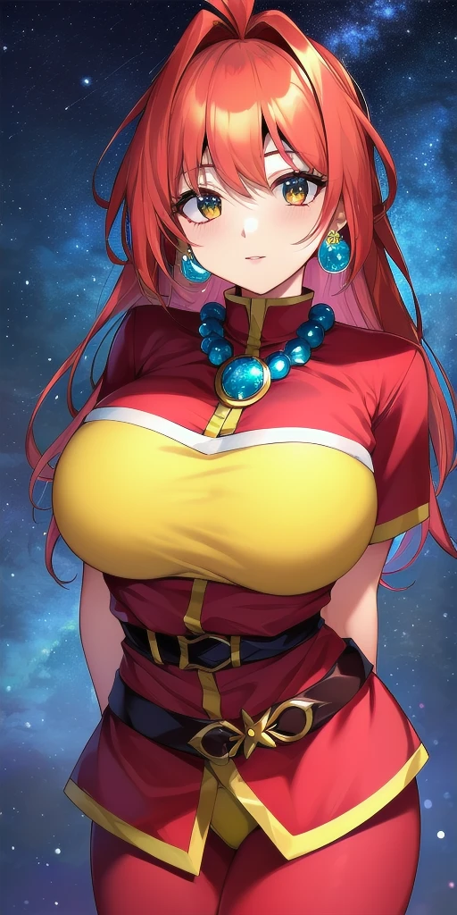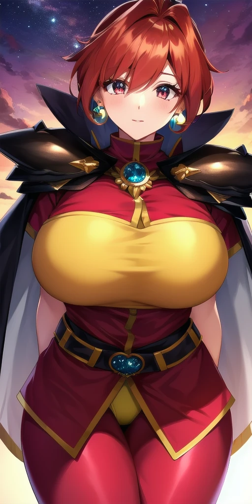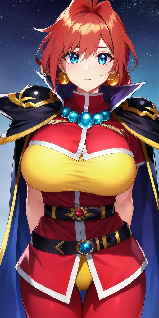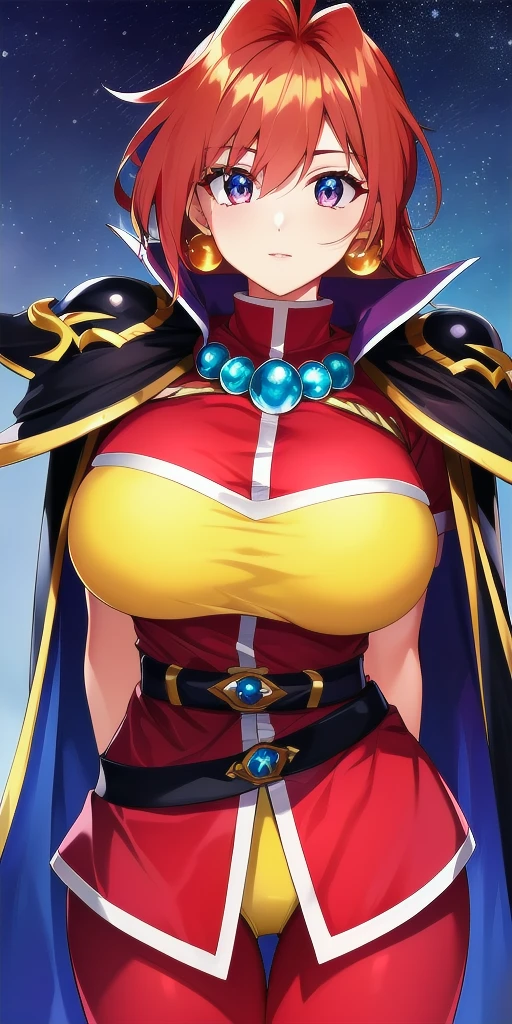 red_shirt_white_trim_turtleneck_yellow_bustier_framed_breasts_red_pantyhose_yellow_panties_over_pantyhose_belt_black_pauldrons_cape: Her OG slayers outfit if her boobs ar bigs it sometimes gives her cleavage.