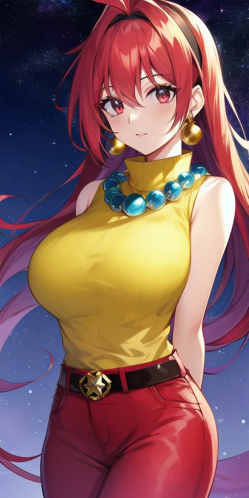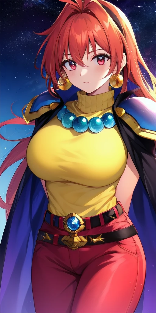 yellow_sweater_sleeveless_turtleneck_red_pants_belt_pauldrons_asymmetrical_armor_cape: Her pre-slayers outfit when she is with Naga.