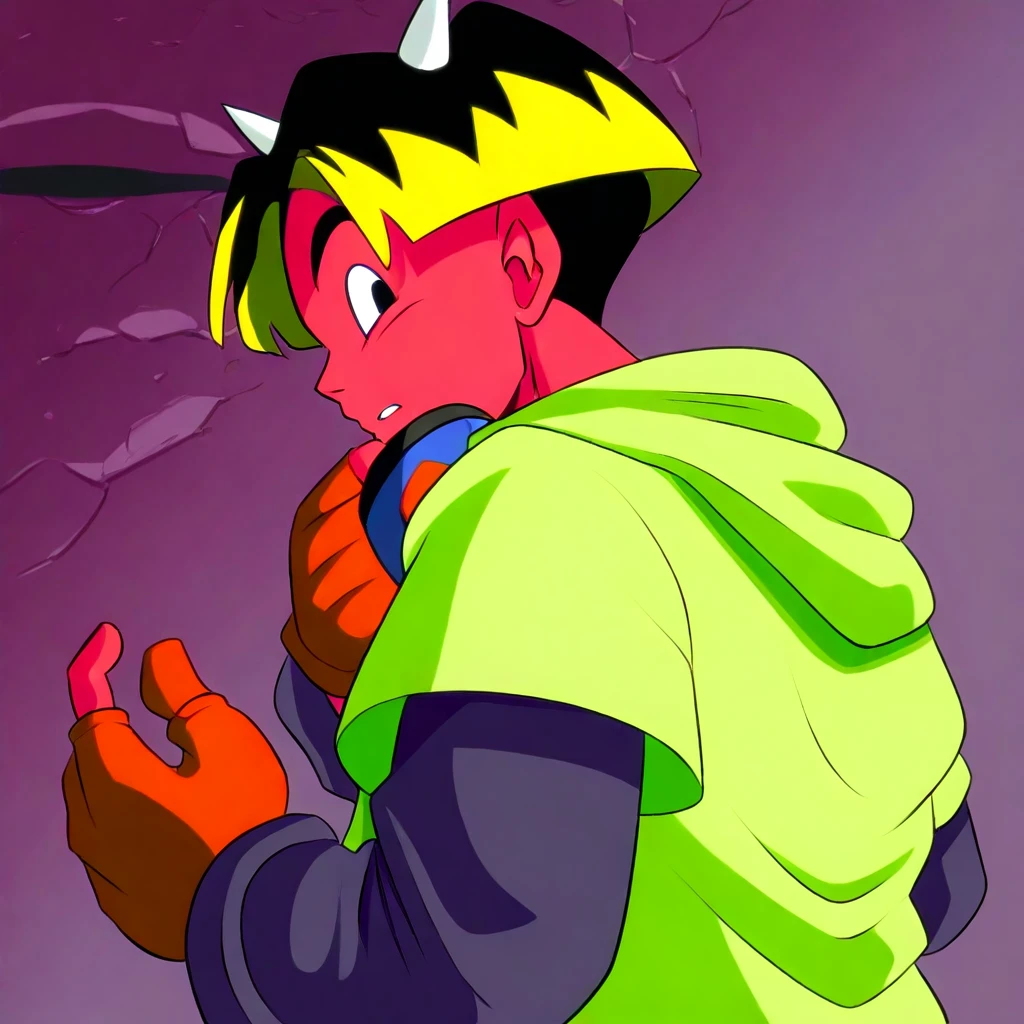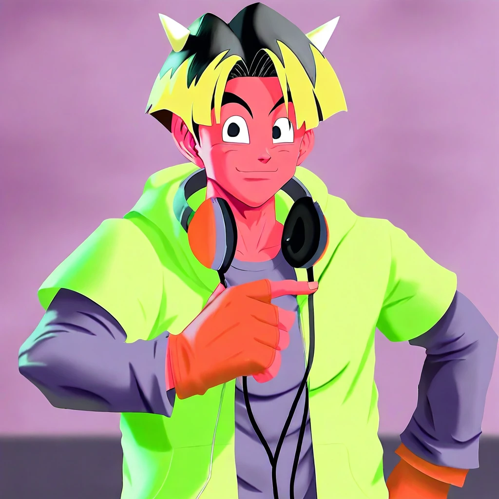 saikoni, male focus, 1boy, hood, solo, headphones, hoodie, horns, gloves, colored skin, red skin, shirt, two-tone hair, blonde hair, black hair