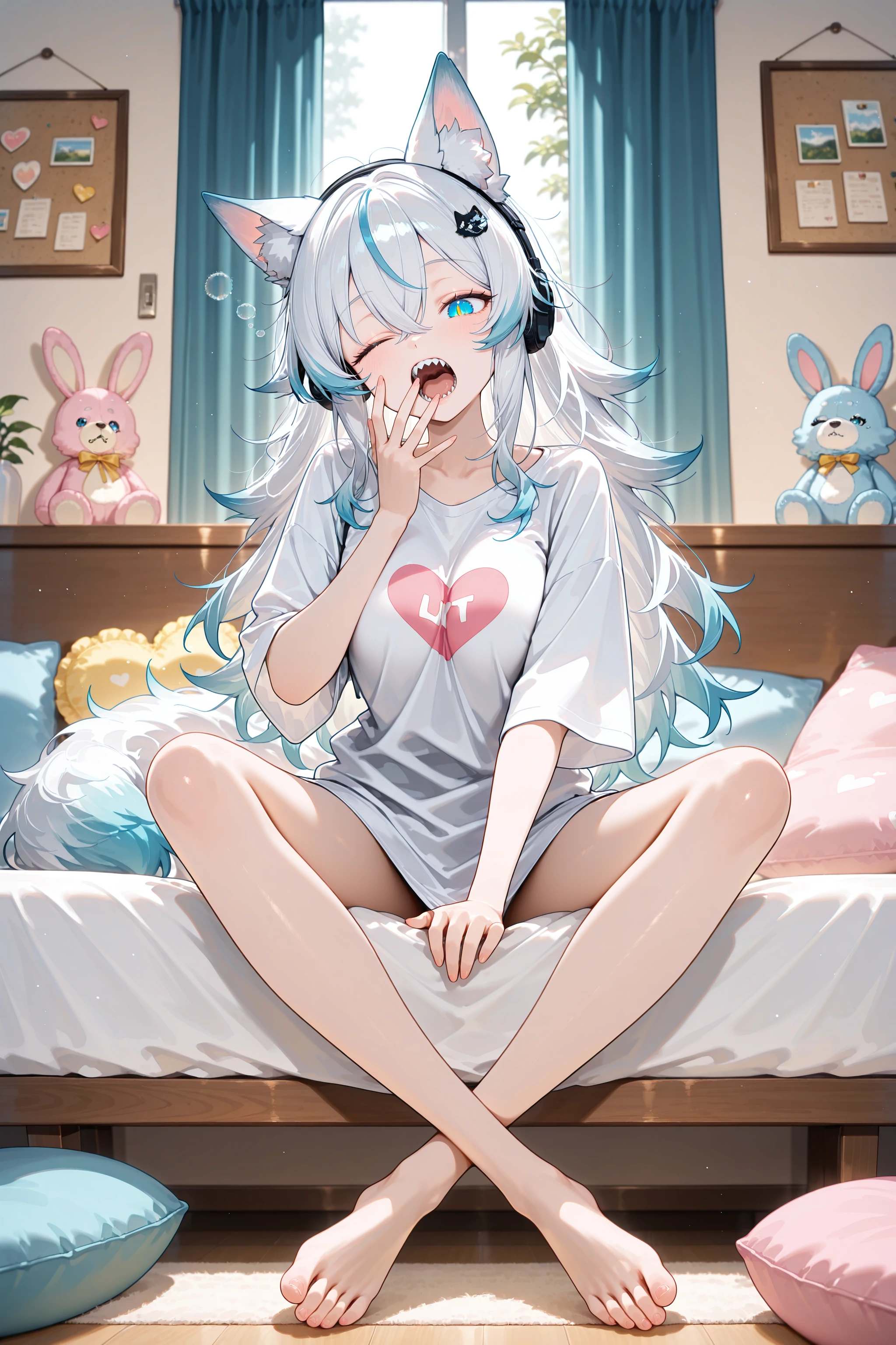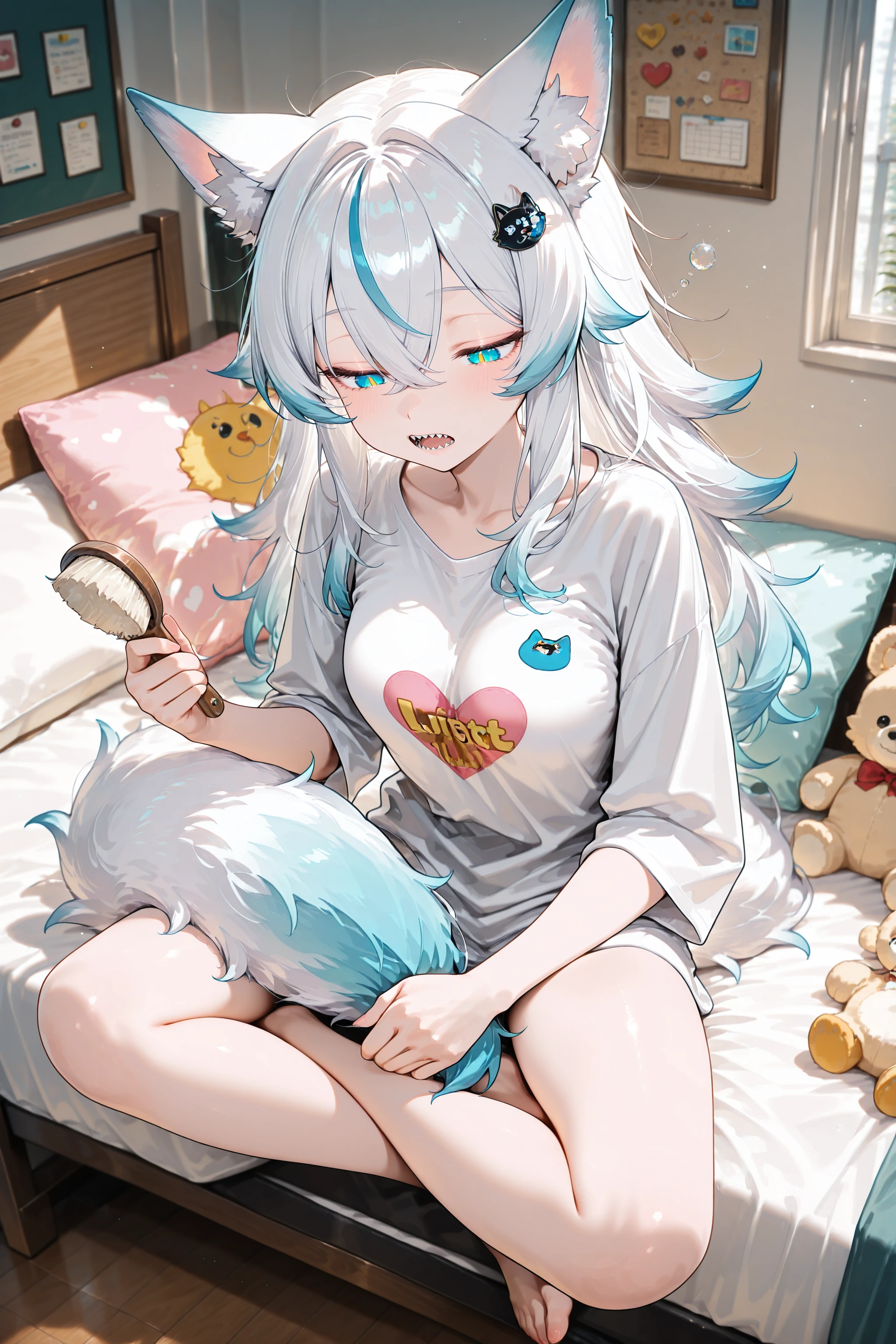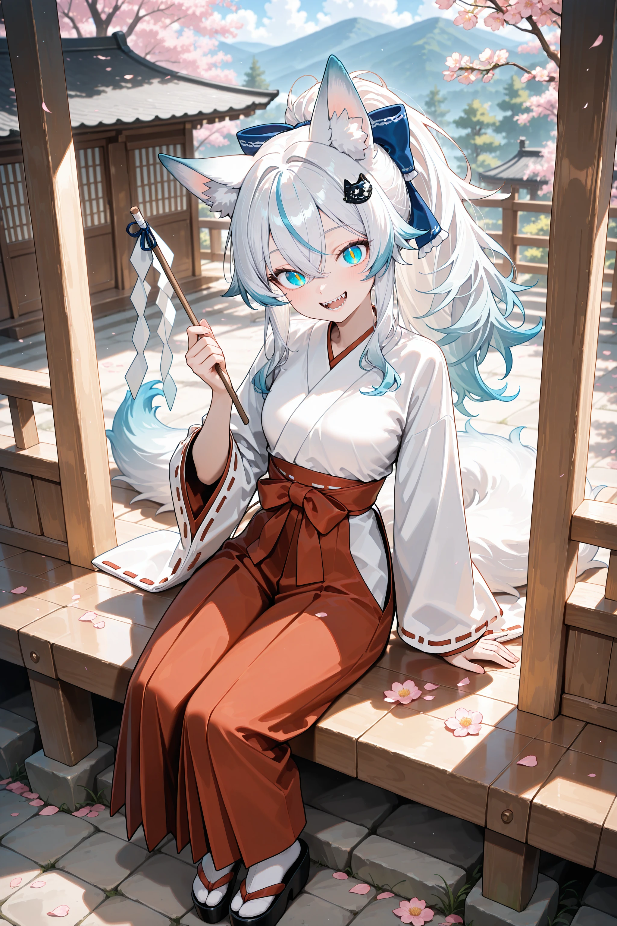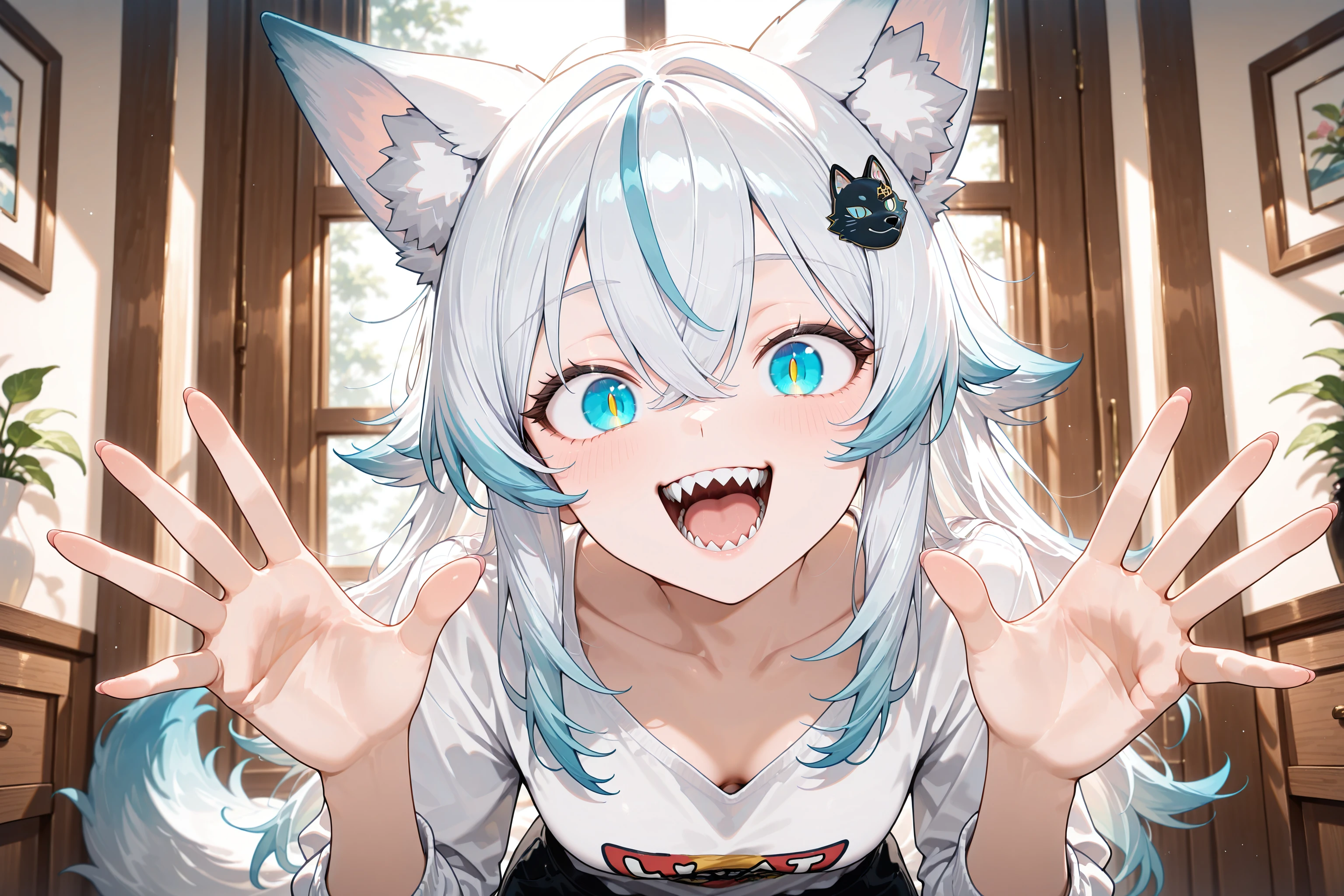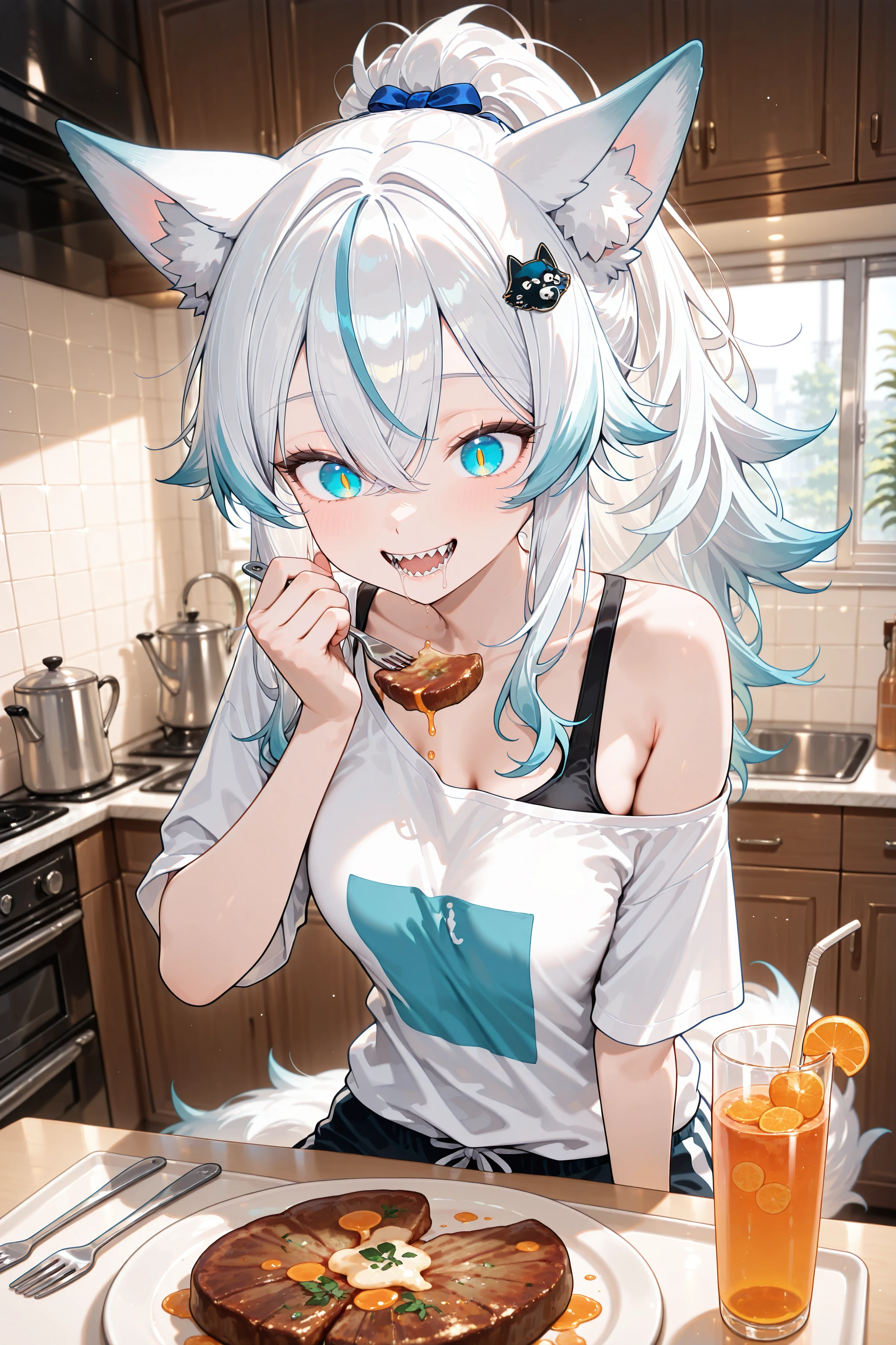 Her trademarks are her wolf-shaped hair ornament and her sharp teeth.