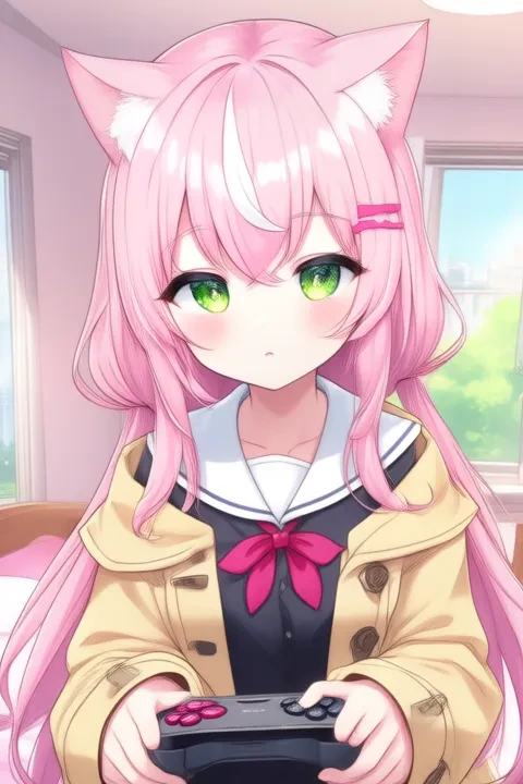 sample prompt:Yang Nari, anime-style girl. The image features a character with long pink hair styled in two pigtails that has white streaks, and a small bow. The character has cat ears on their head, which are pink with white inner parts. They have green eyes and are wearing a white shirt with a red bow tie. The character is dressed in a yellow coat with black trim and a black skirt. (she is dancing:2.5), (chibi Nendoroid:3.5) in bedroom.