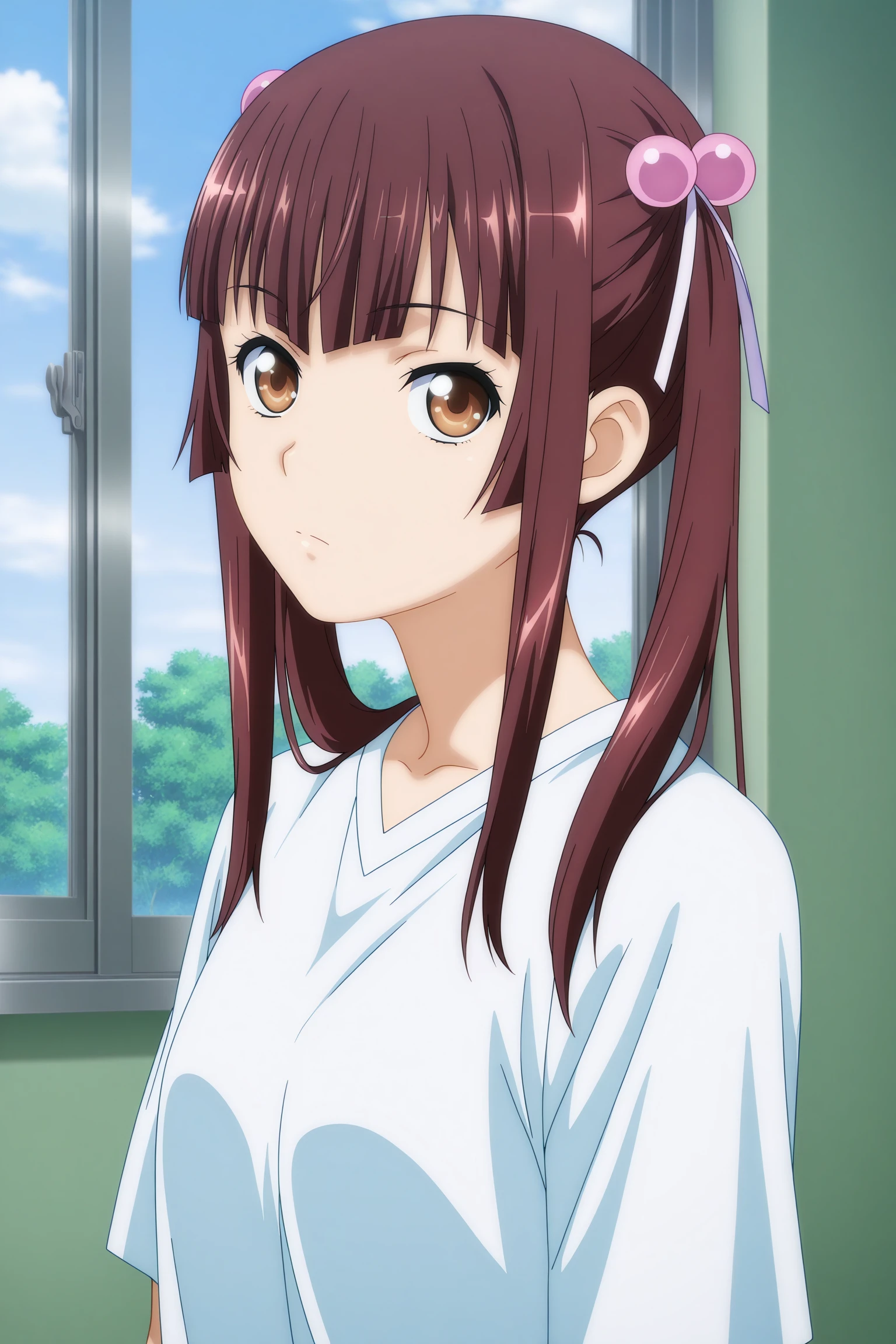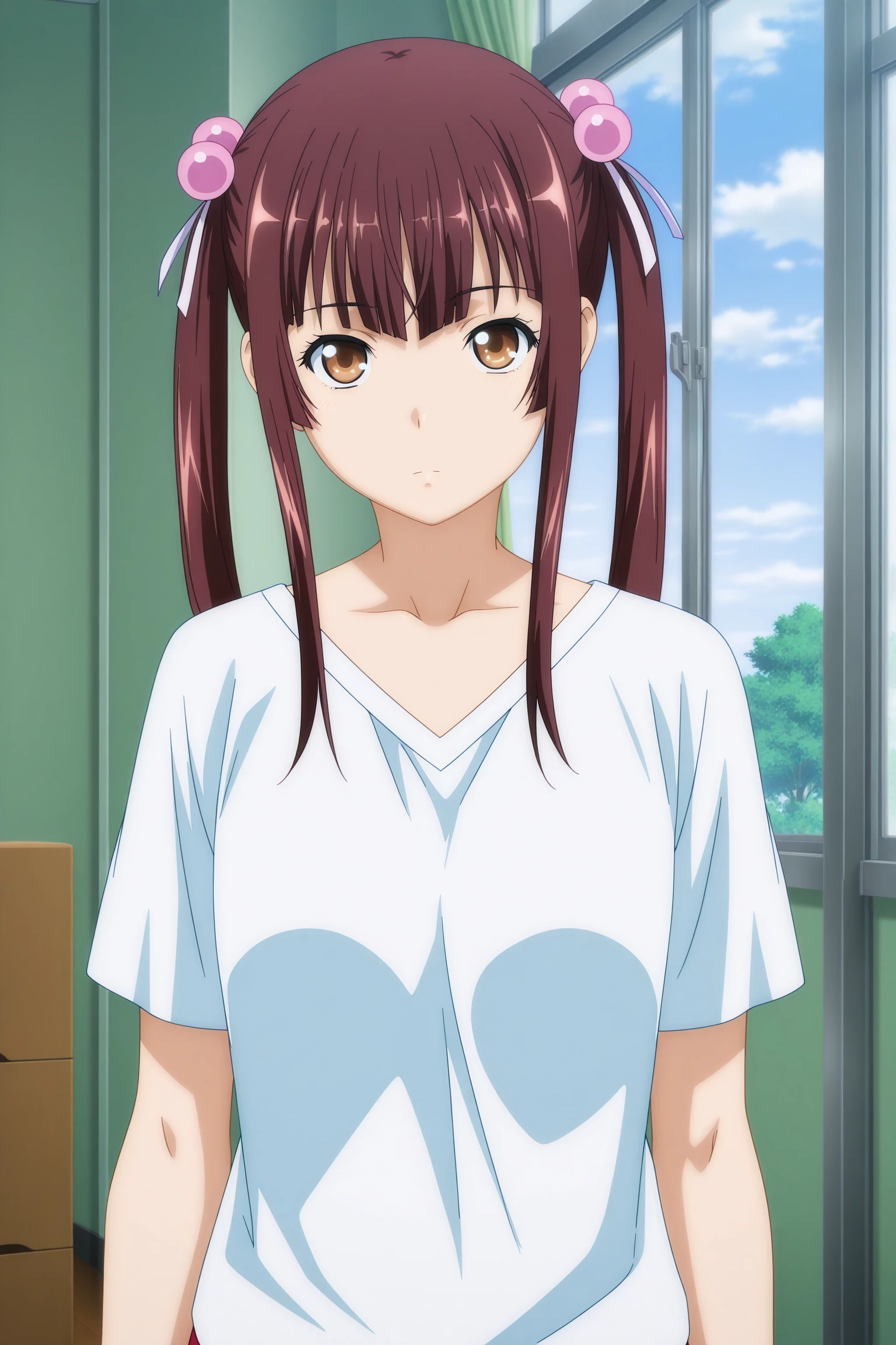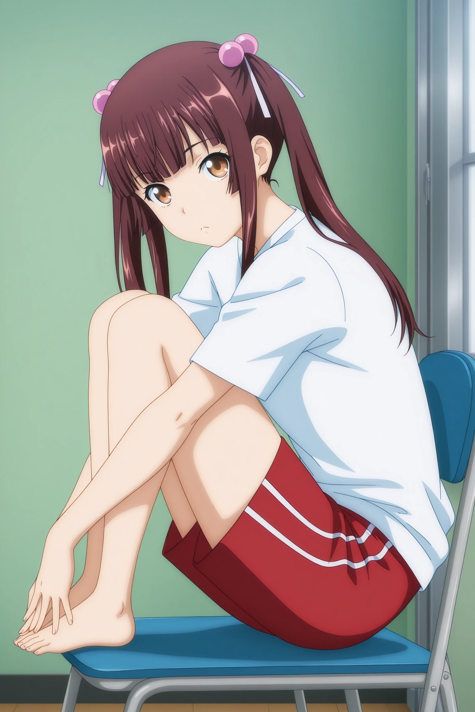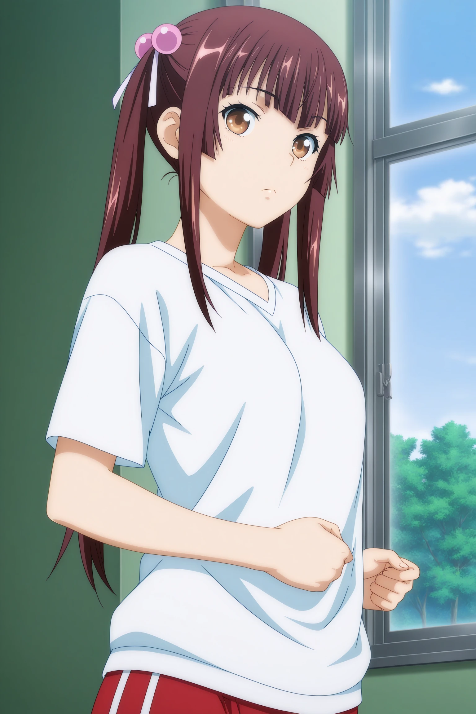 chuubou sonken, long hair, brown hair, twintails, hair bobbles, hair ribbon, sidelocks, blunt sidelocks, blunt bangs, brown eyes, short sleeves, white shirt, red shorts, gym shortsDescription