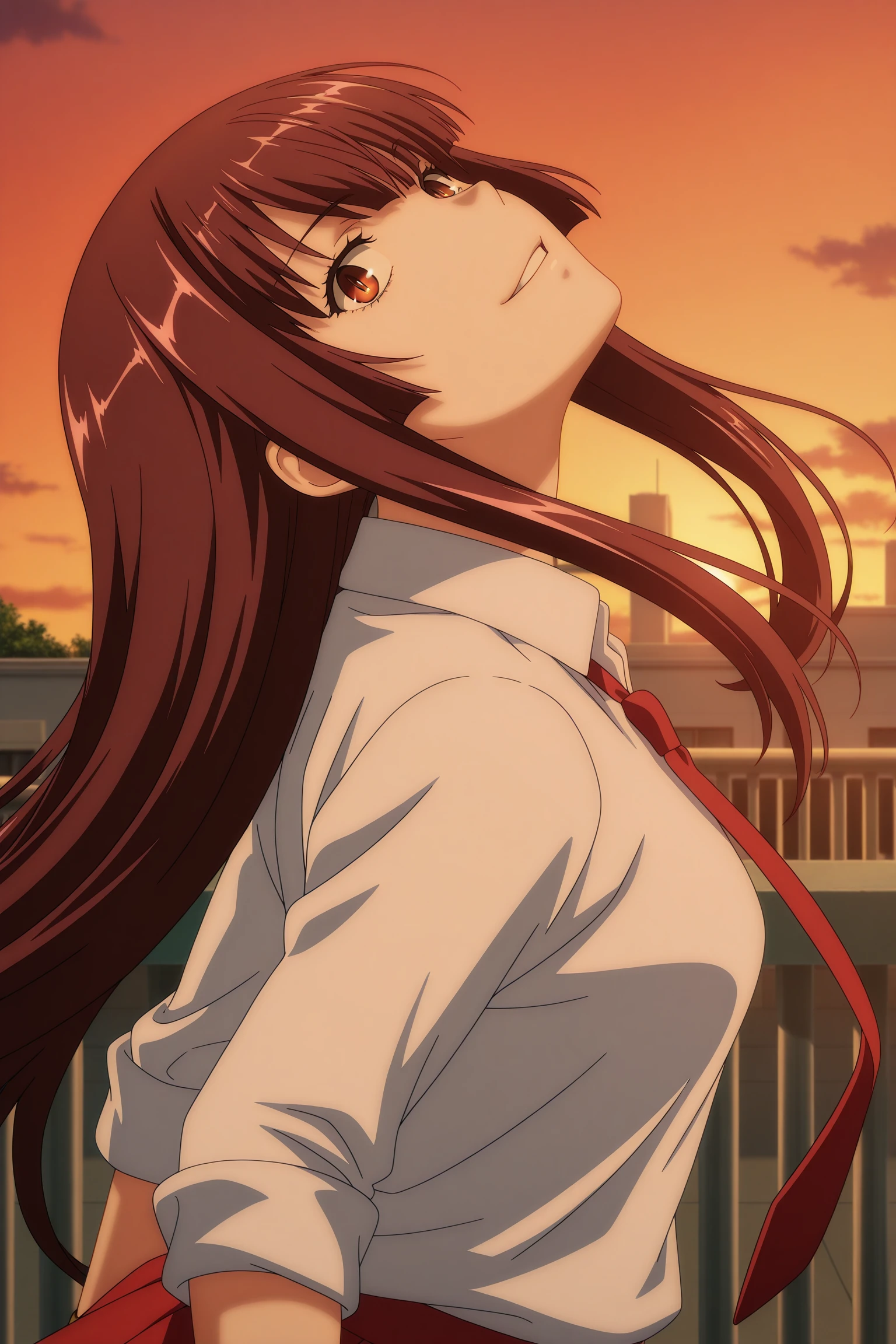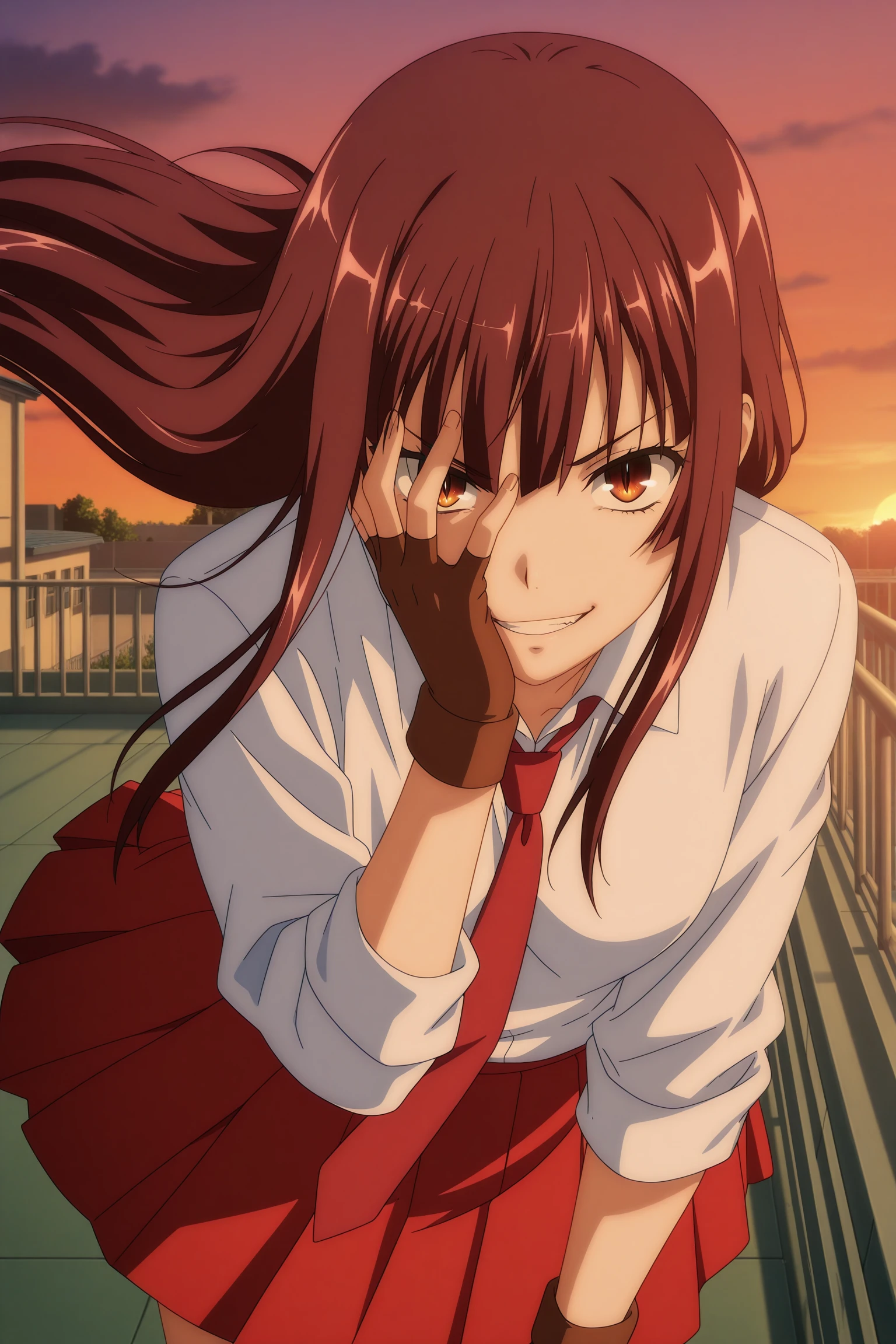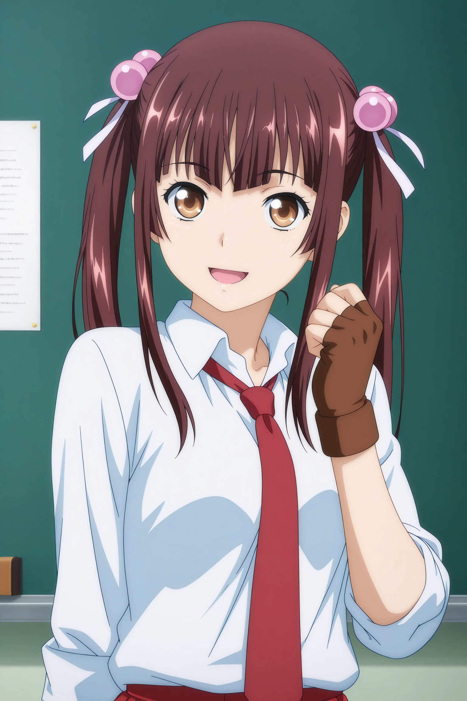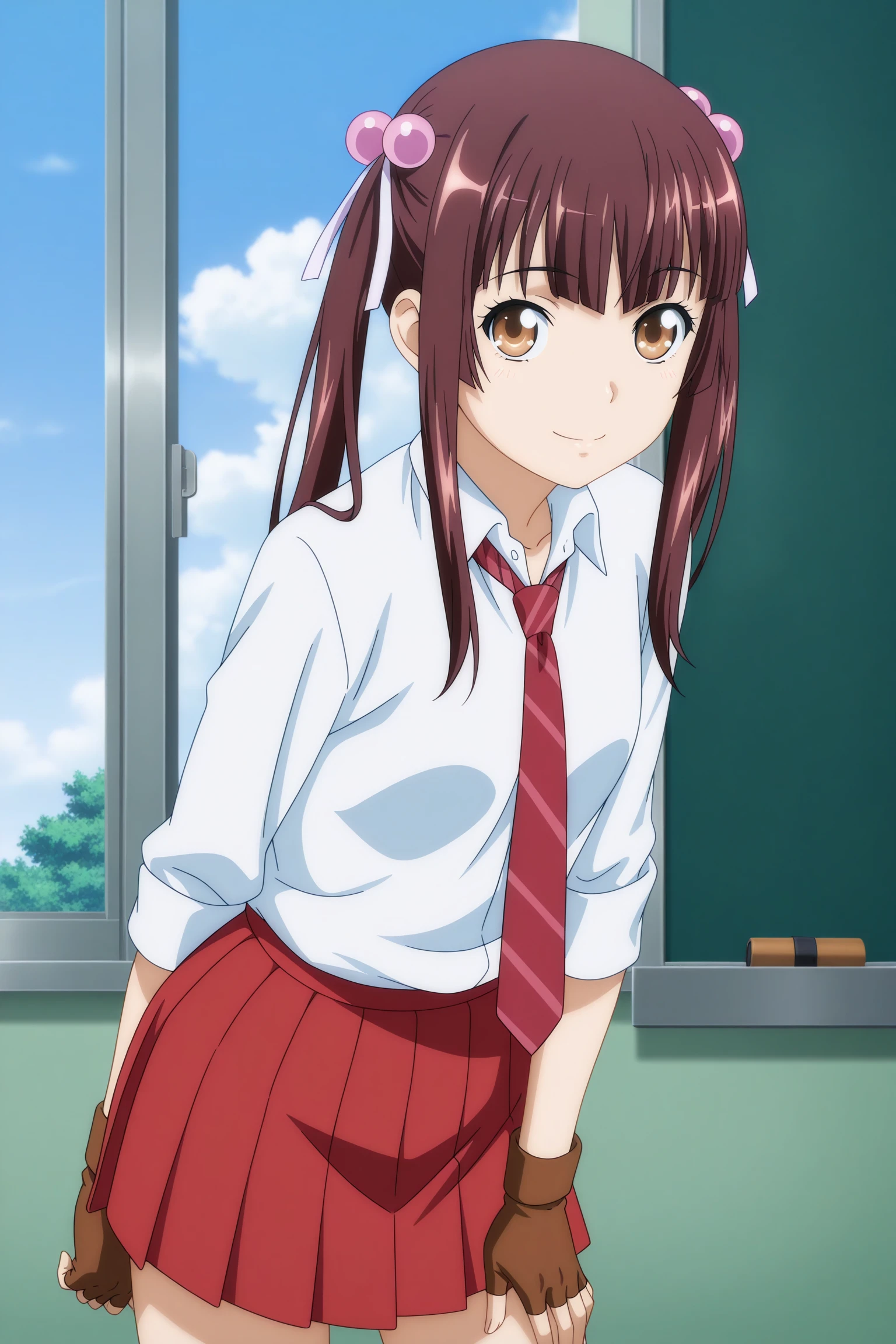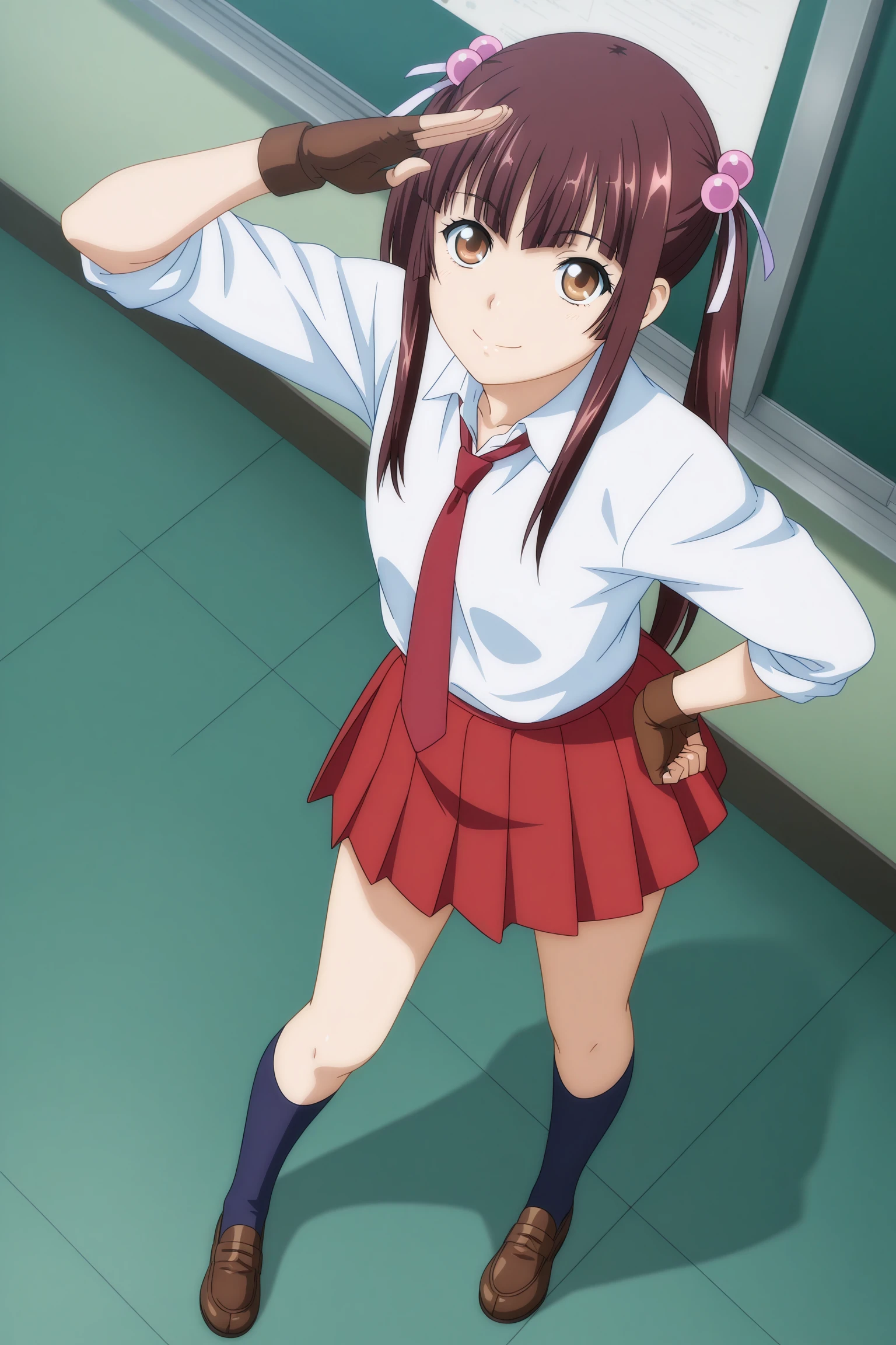 chuubou sonken, long hair, brown hair, twintails, hair bobbles, hair ribbon, sidelocks, blunt sidelocks, blunt bangs, brown eyes, three-quarter sleeves, white shirt, collared shirt, red necktie, brown gloves, fingerless gloves, red skirt, pleated skirt, blue socks, kneehighs, brown footwear, loafers