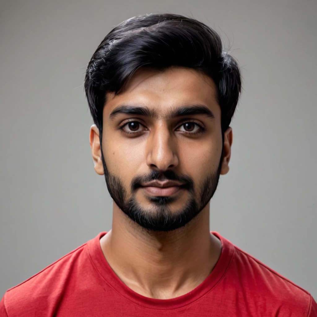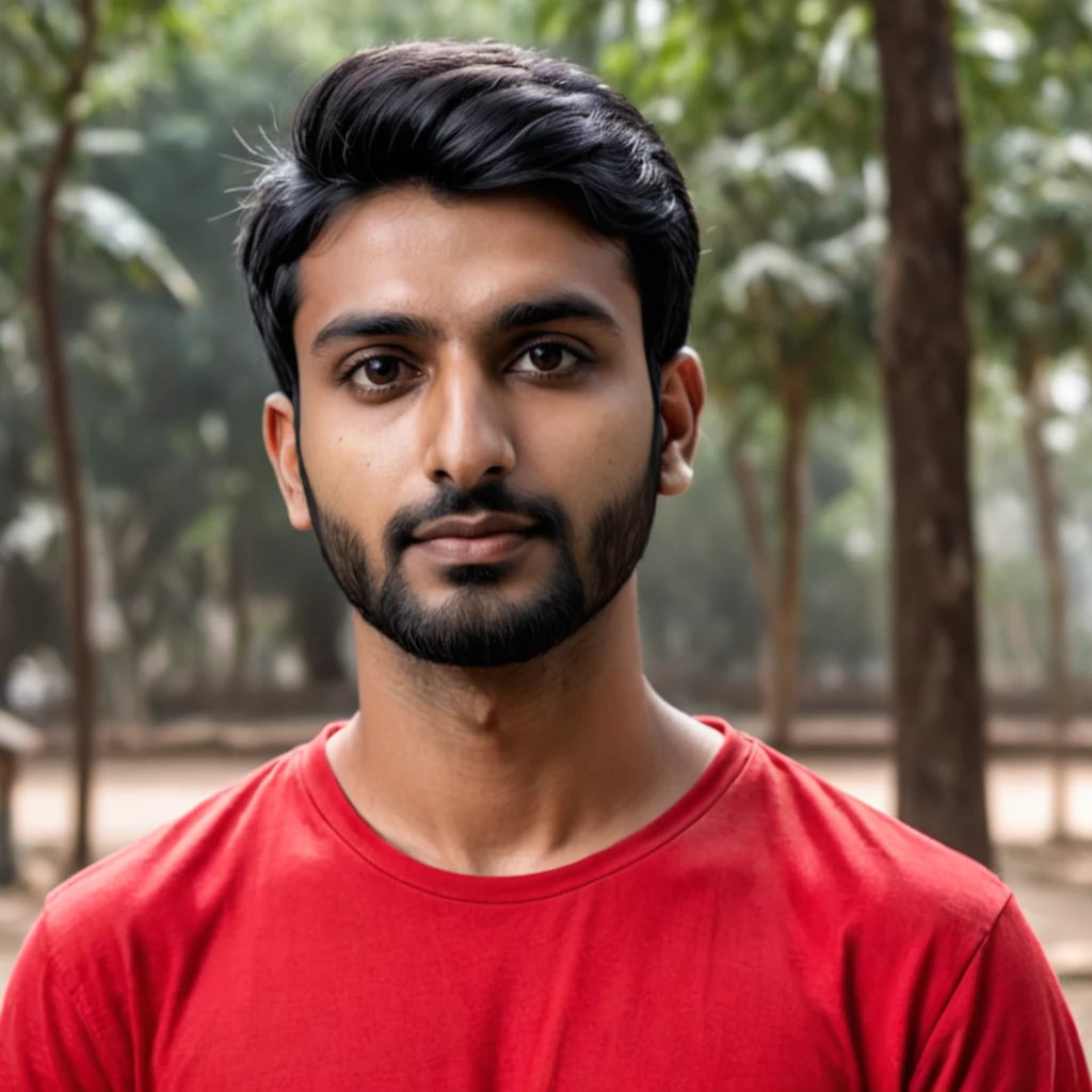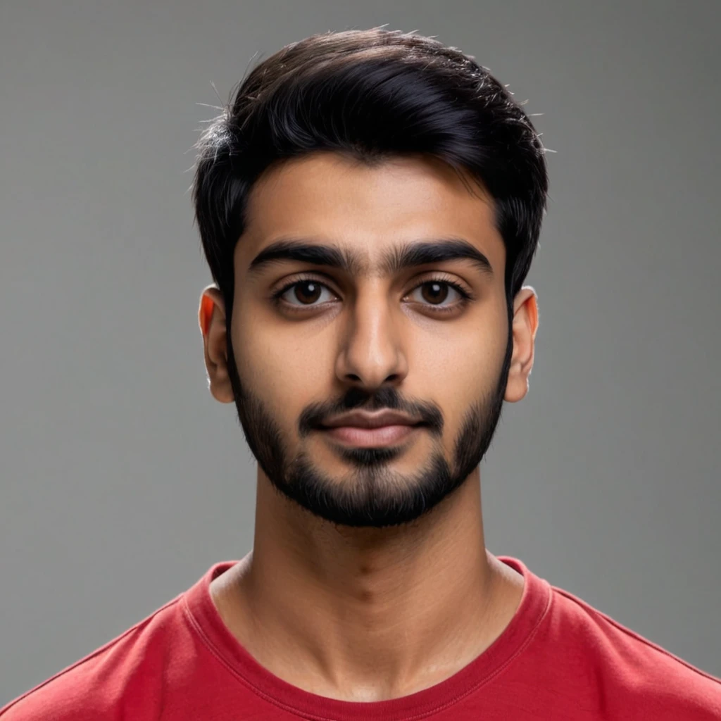 Prompt: A young 24-year-old Indian man with short black hair and a small black beard is wearing a red shirt.