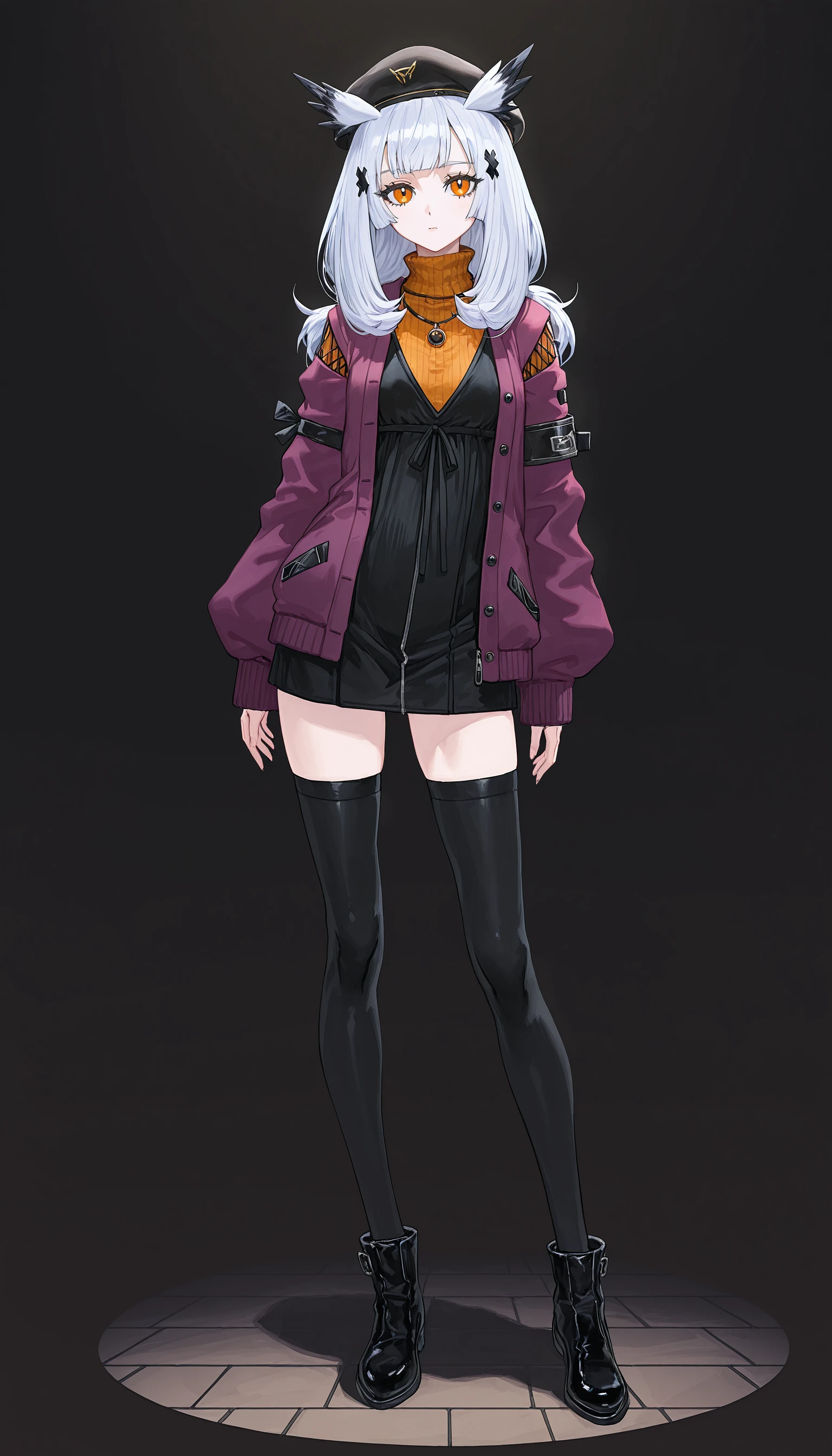 black armband, black thighhighs , necklace ,beret ,orange turtleneck sweater , purple jacket , open jacket, black dress,