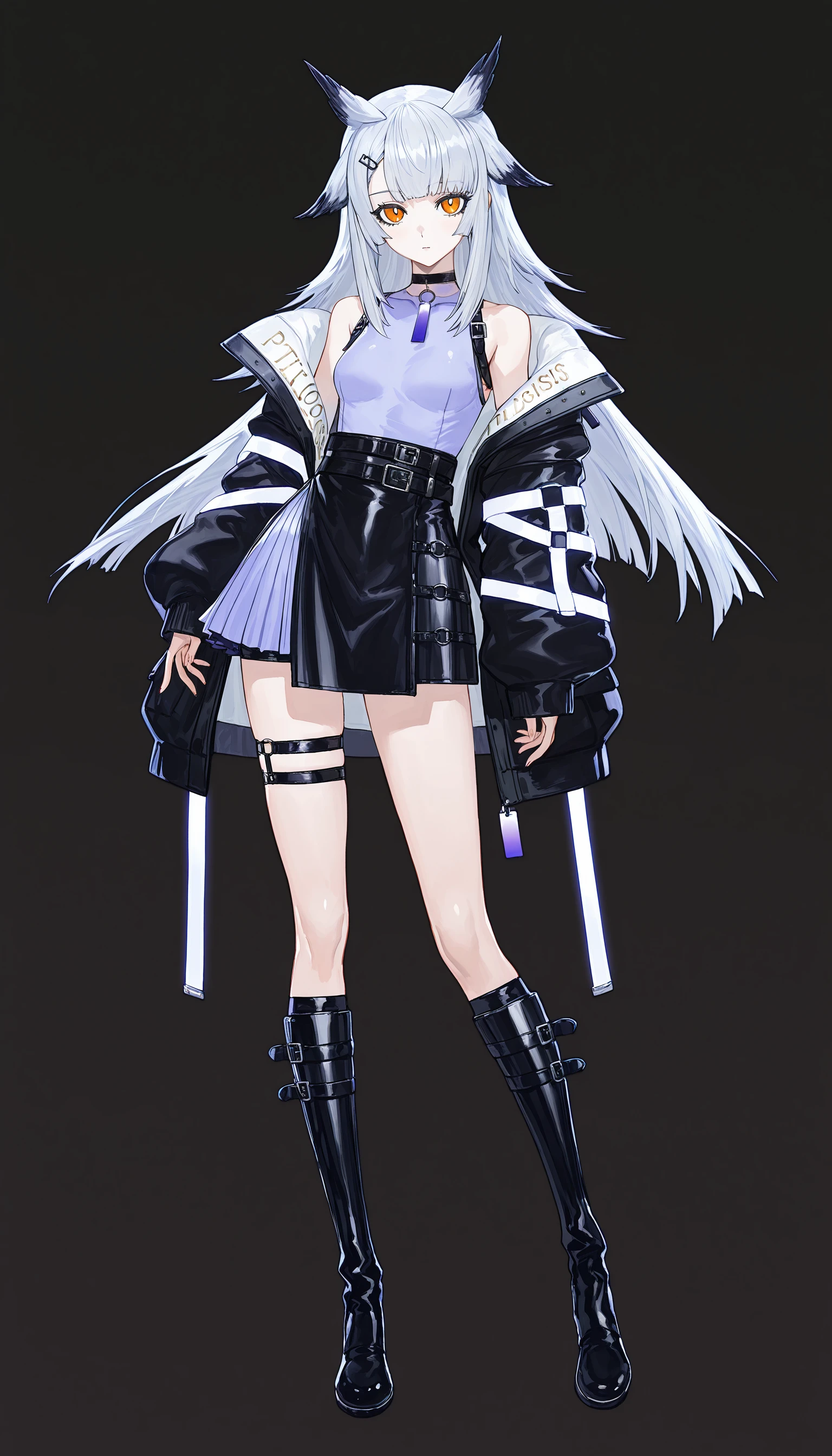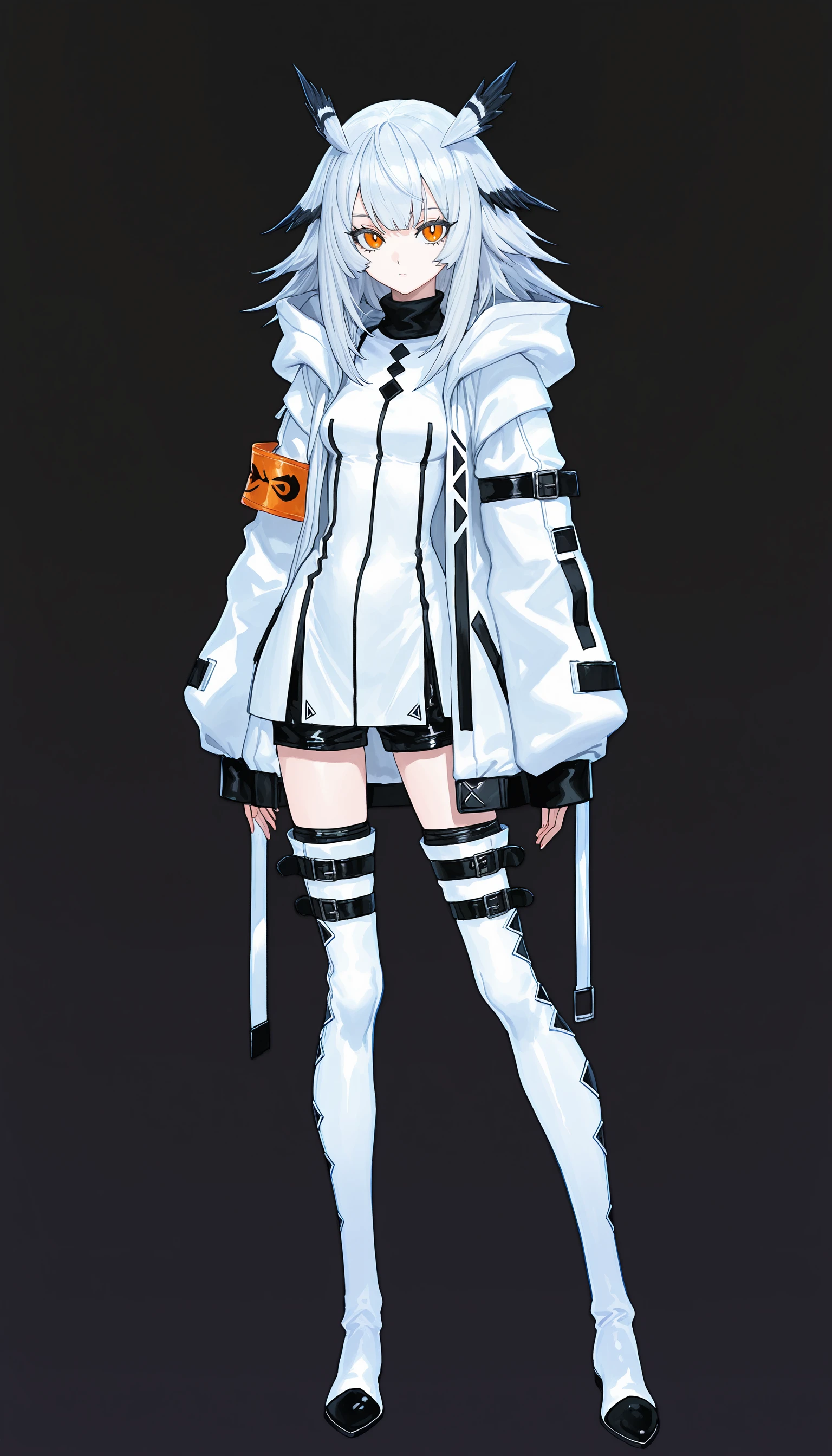 armband , thigh strap , white_turtleneck_dress , white_hooded_jacket, black_shorts ,