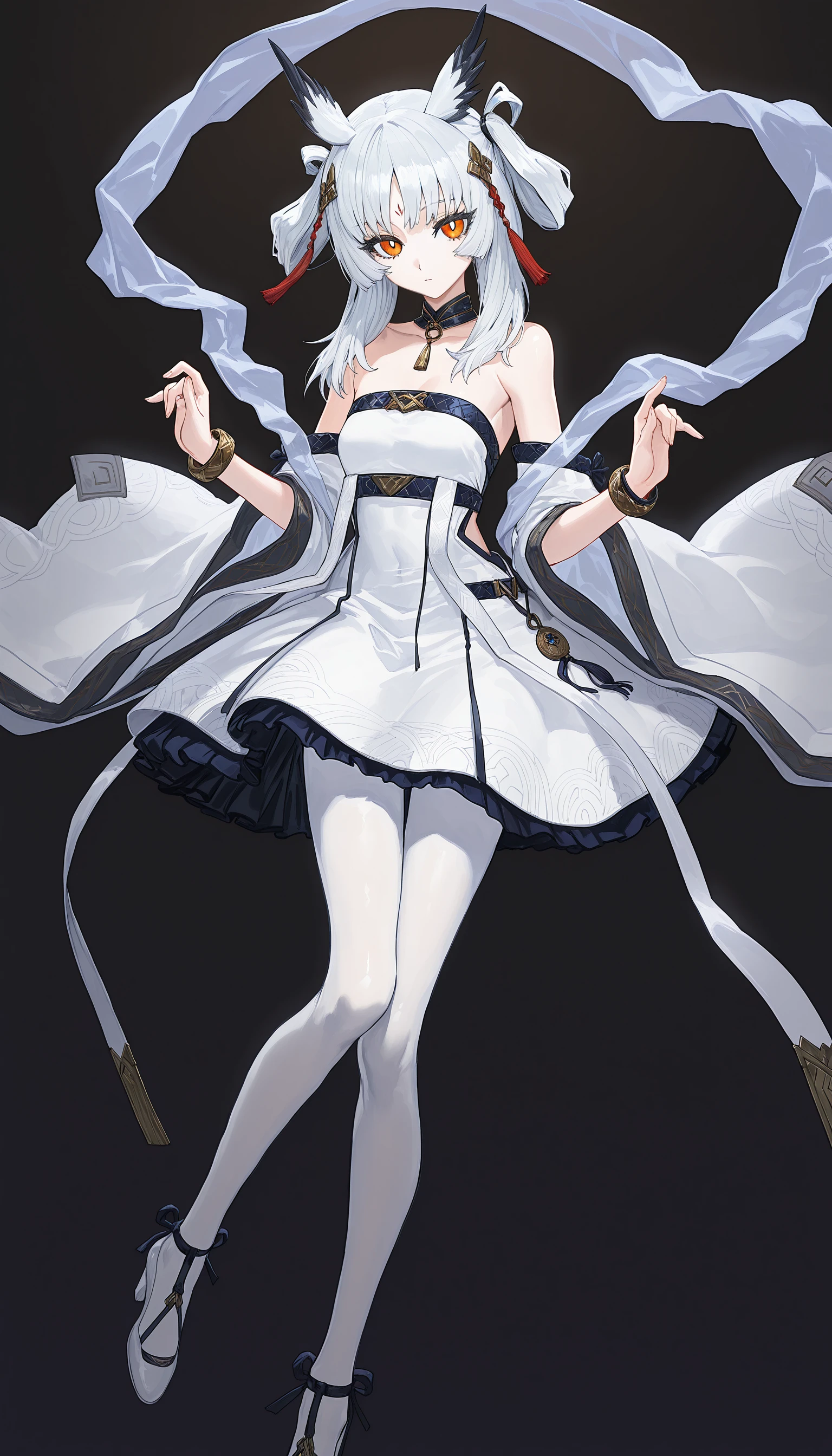 orange eyes, white pupils , white hair, feather hair , owl ears , long hair, cross hair ornament,