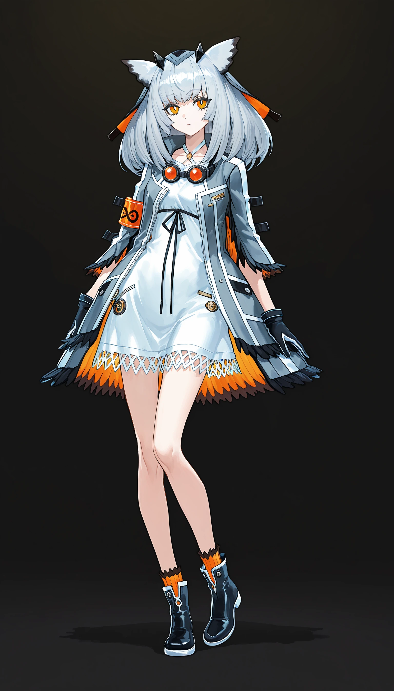 orange eyes, white pupils , white hair, feather hair , owl ears , medium hair,