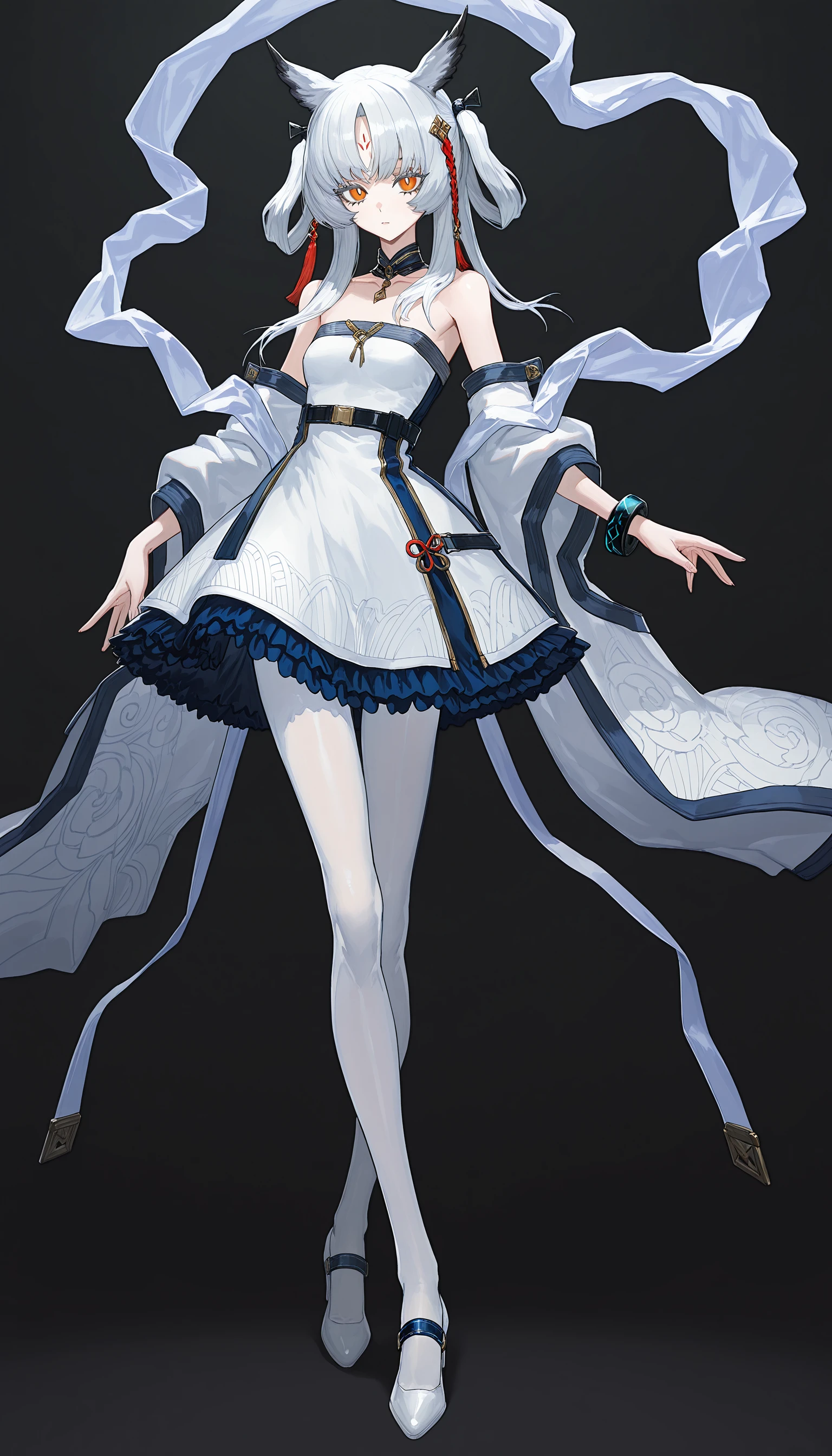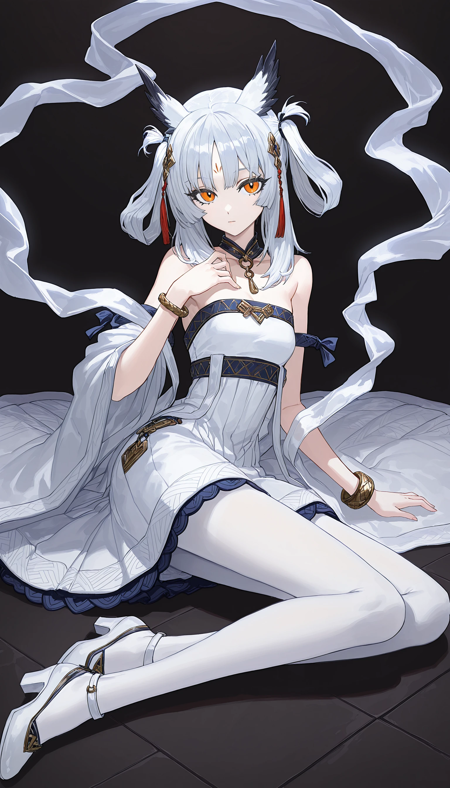 orange eyes, white pupils , white hair, feather hair , owl ears , hair rings, forehead mark, long hair, tassel hair ornament ,