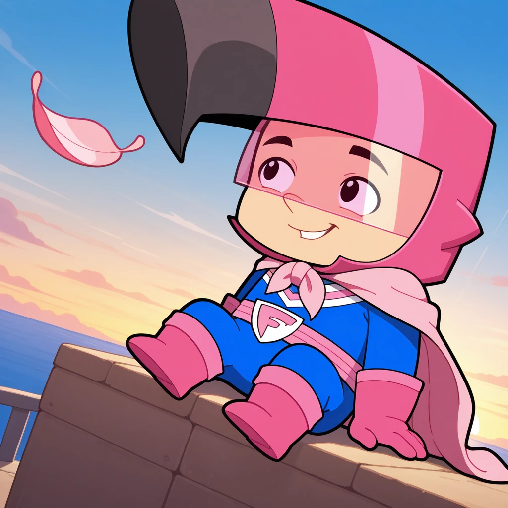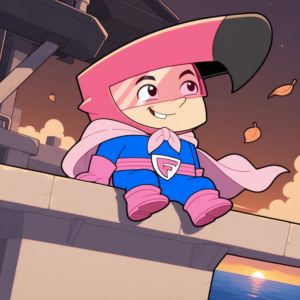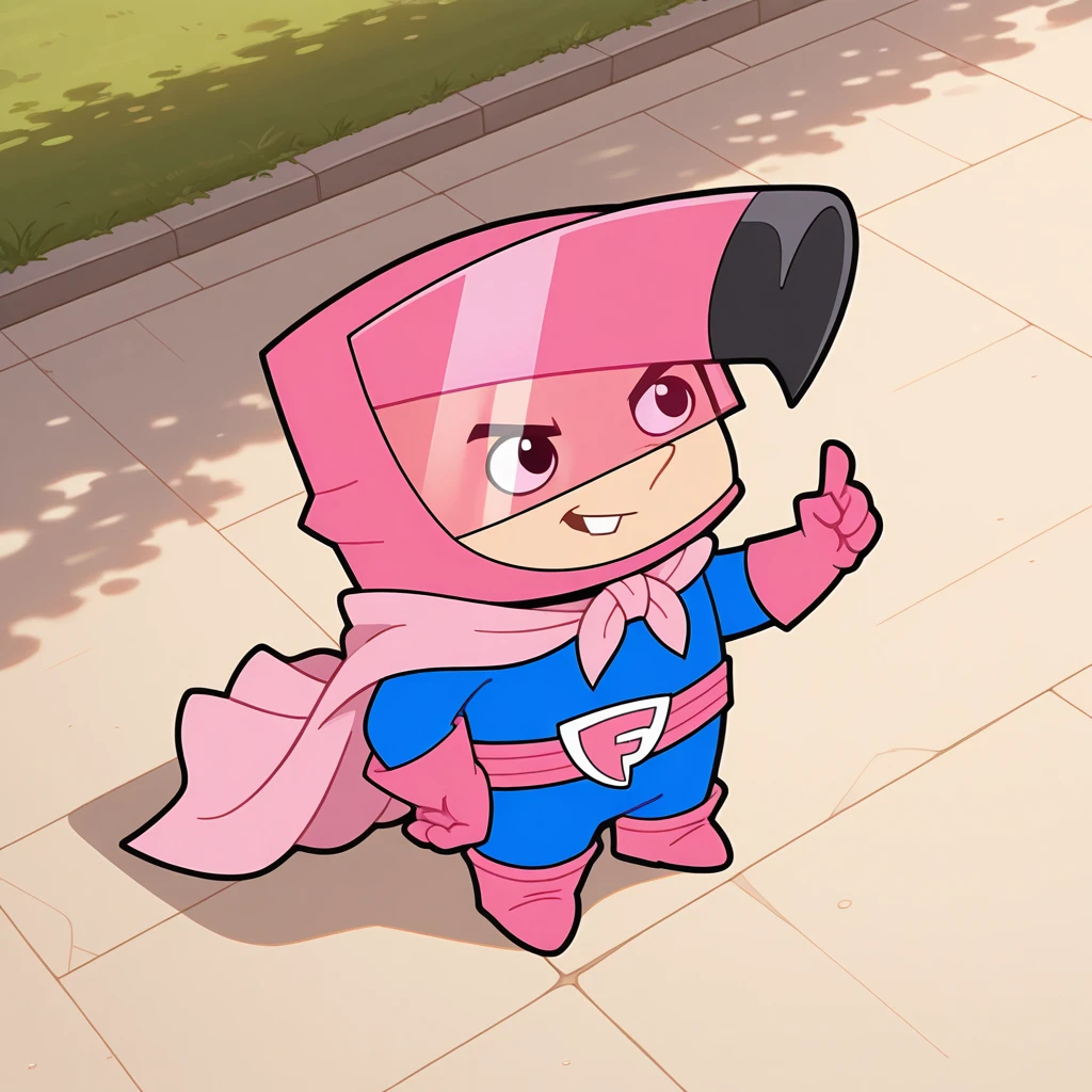 p: official_alternate_costume, big bird hat, pink headwear, pink visor, pink cloak, blue bodysuit, pink gloves, big belt, pink boots,