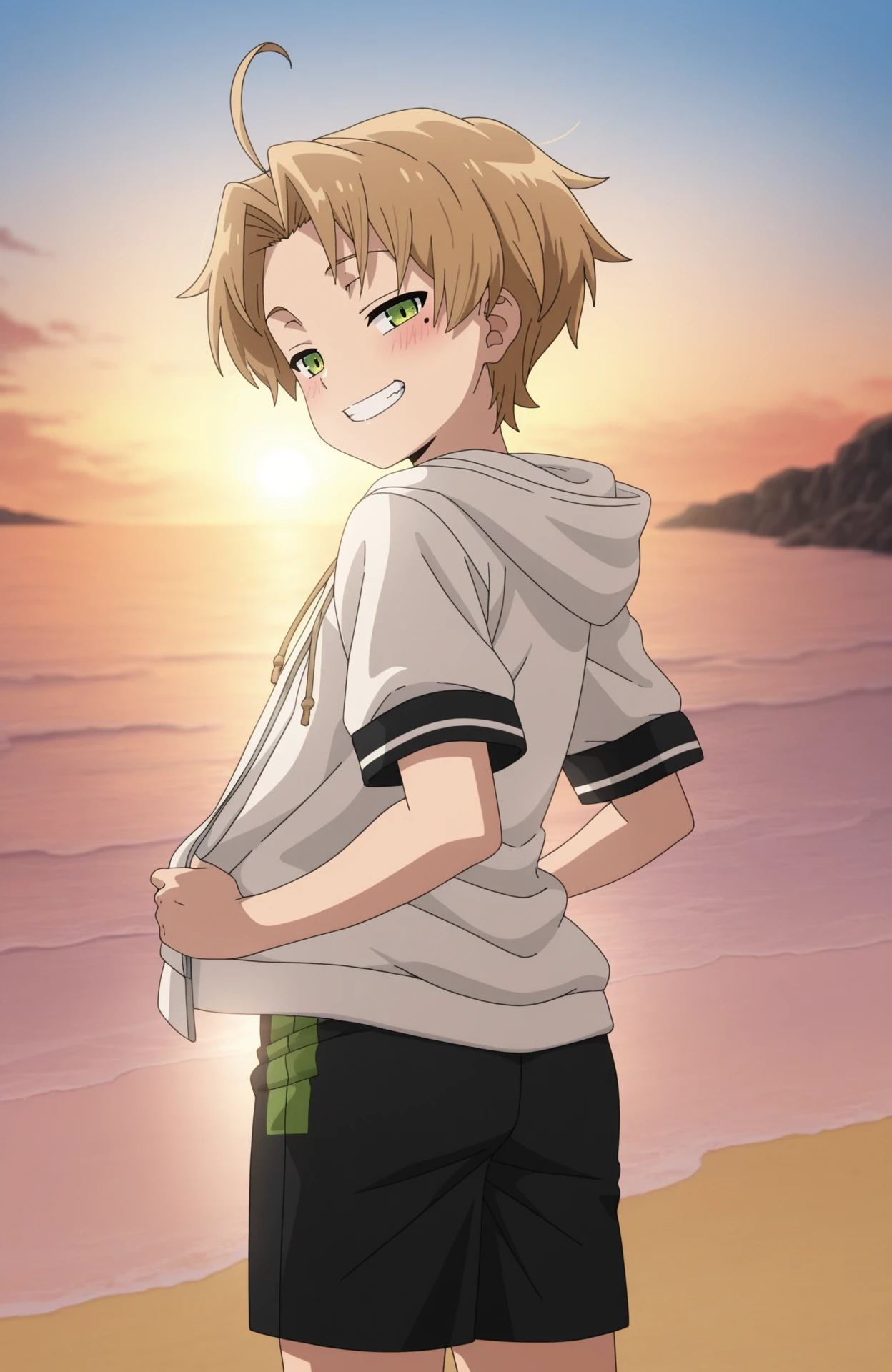 rudeus, 1boy, green eyes, mole under eye, blonde hair, ahoge, white shirt, short sleeves, black vest, red shorts,