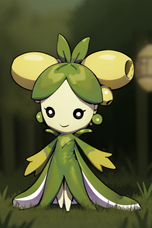 dolliv, solo, pokemon \(creature\), colored skin, black eyes, green hair, hair ornament, green dress