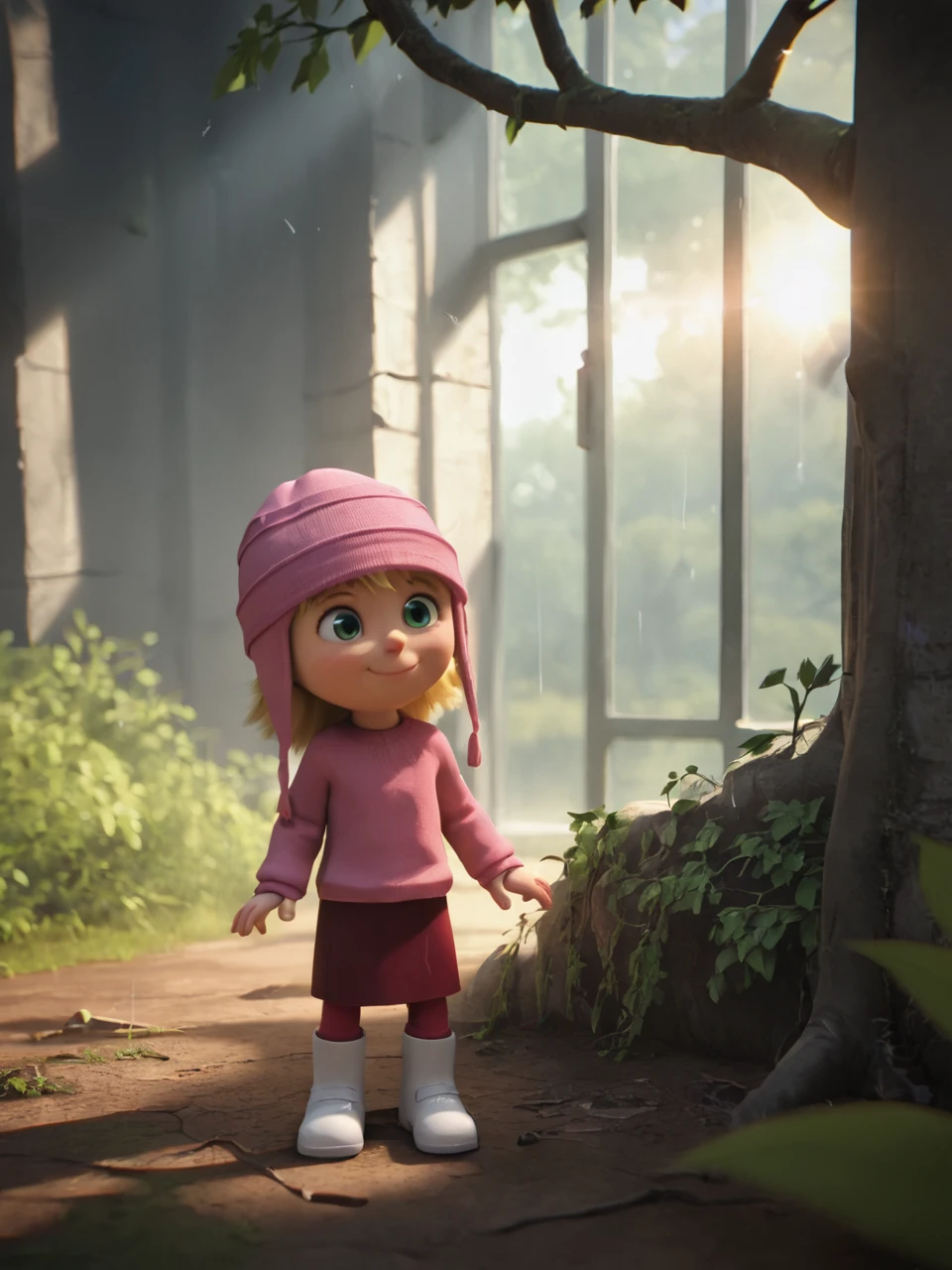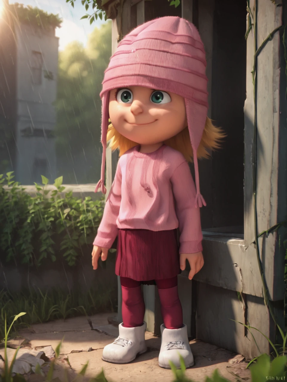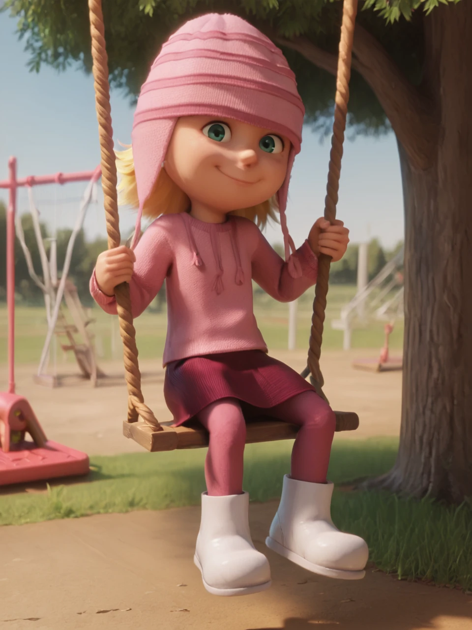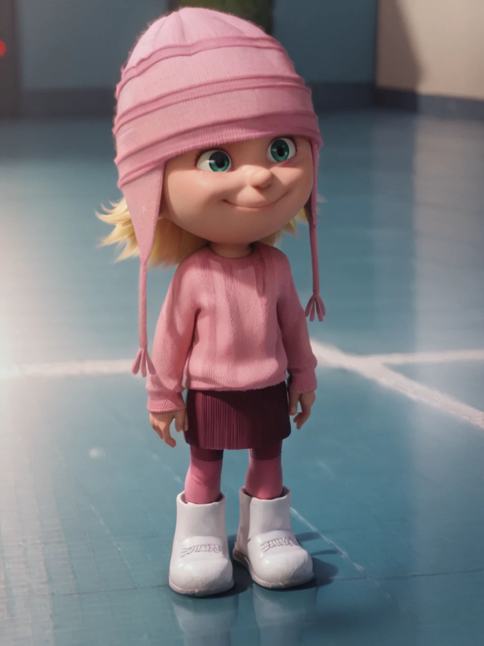pink beanie, red_legwear, pink sweater, red skirt, white footwear,