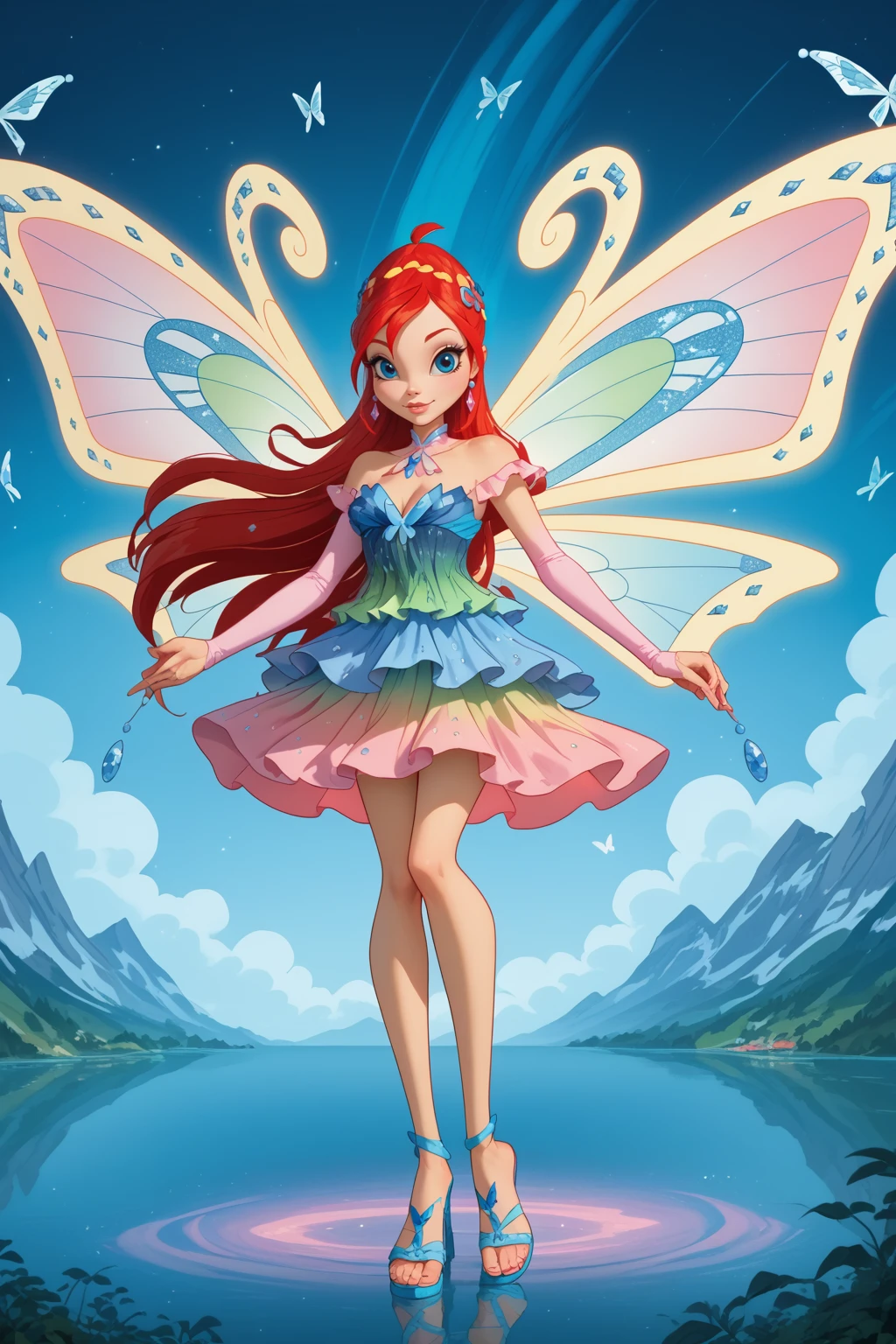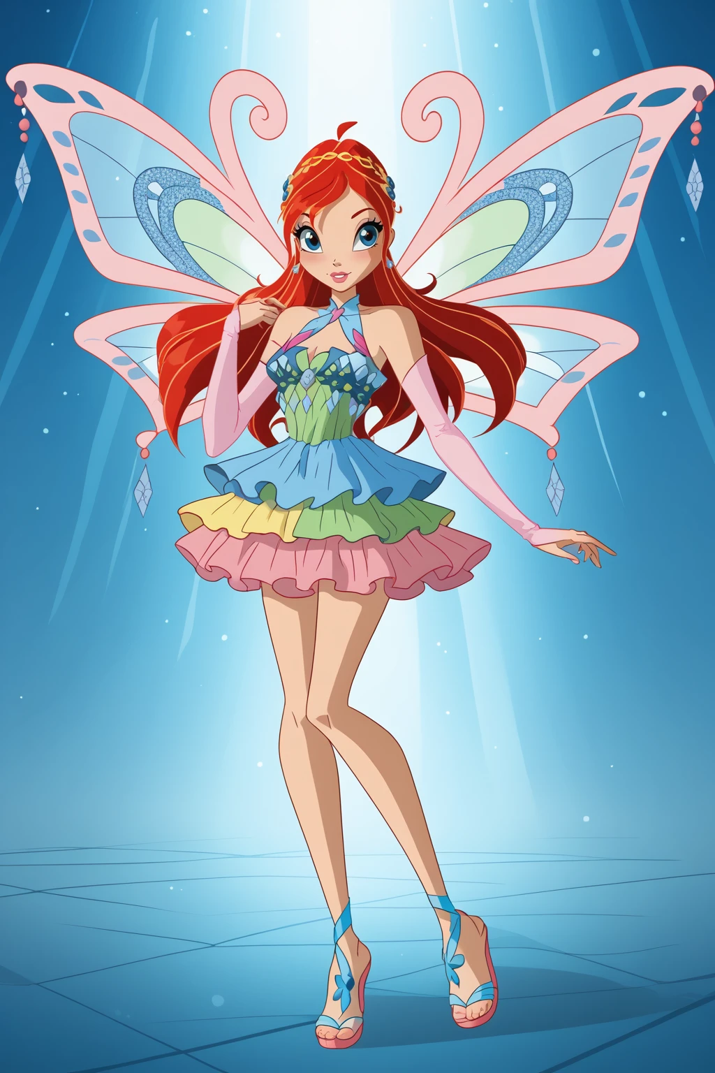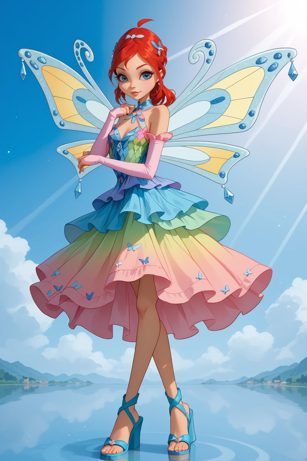 enchantix, colorful dress, blue eyes, hair ornament, blue sandals, pink sleeves, butterfly wings