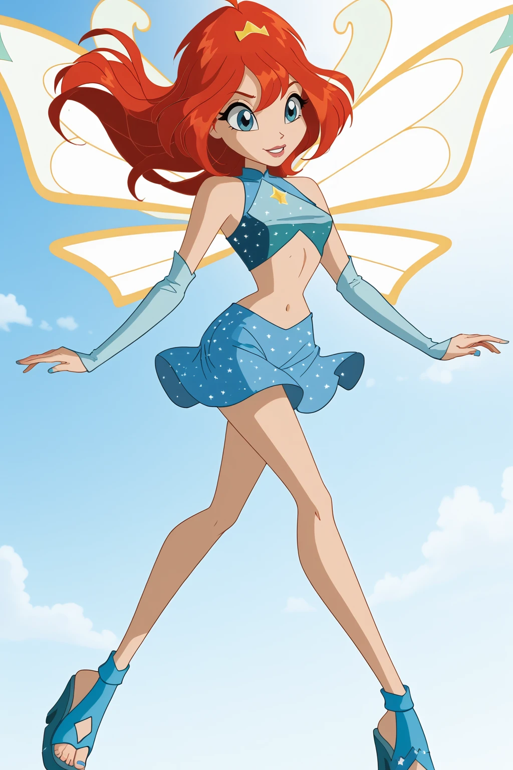 charmix, blue star pattern crop top, blue star pattern skirt, blue sleeves, blue boots, blue eyes, wings, hair ornament