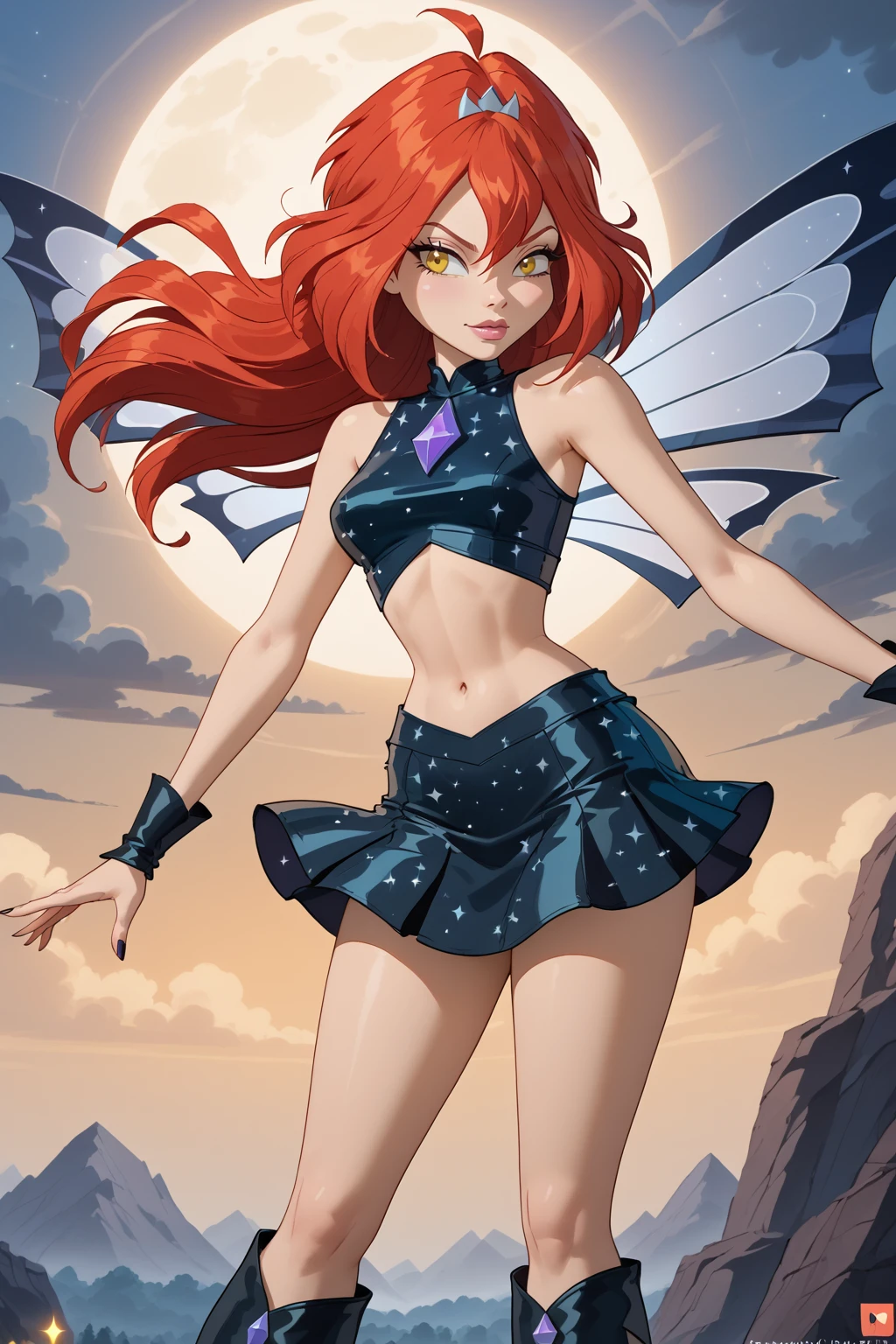 dark bloom, dark star pattern crop top, dark star pattern skirt, black boots, hair ornament, yellow eyes, wings