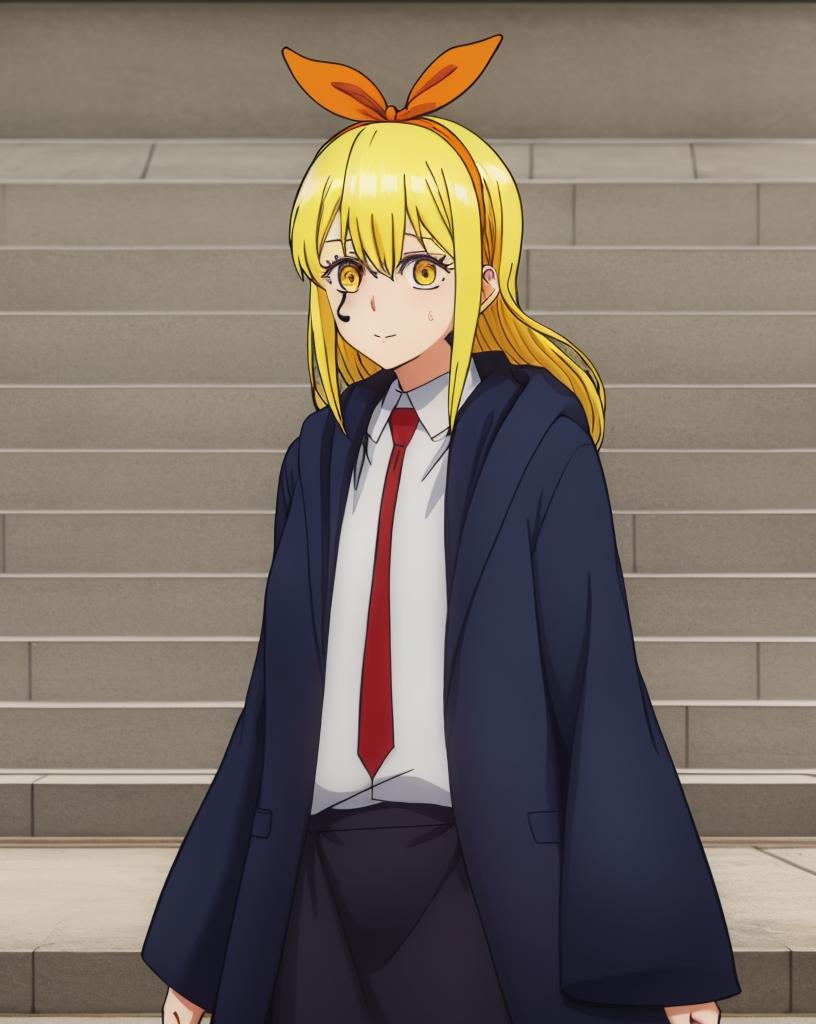 1girl, solo, blonde hair, red necktie, long hair , yellow eyes, hairband, hair ribbon, coat, robe, school uniform,