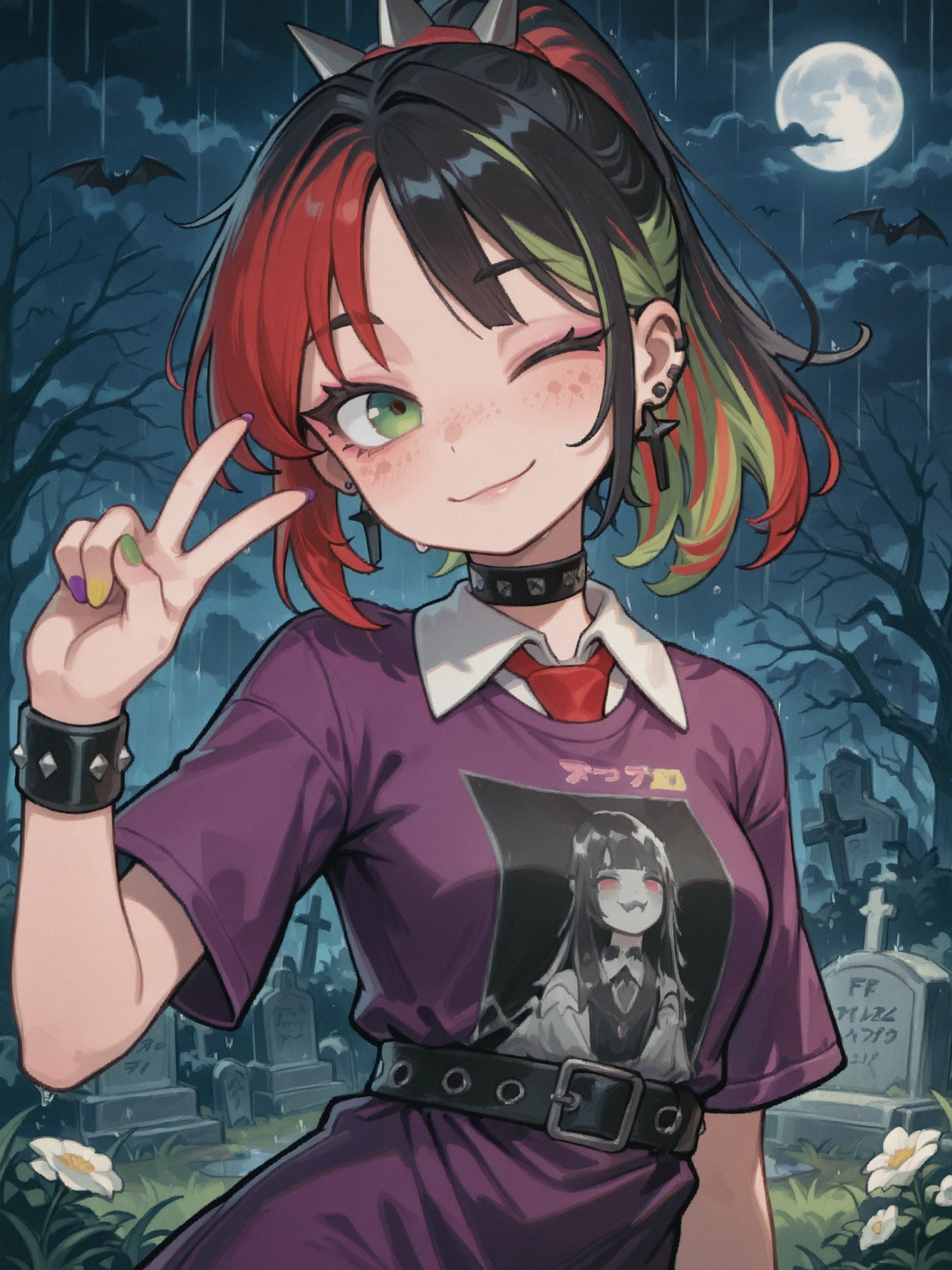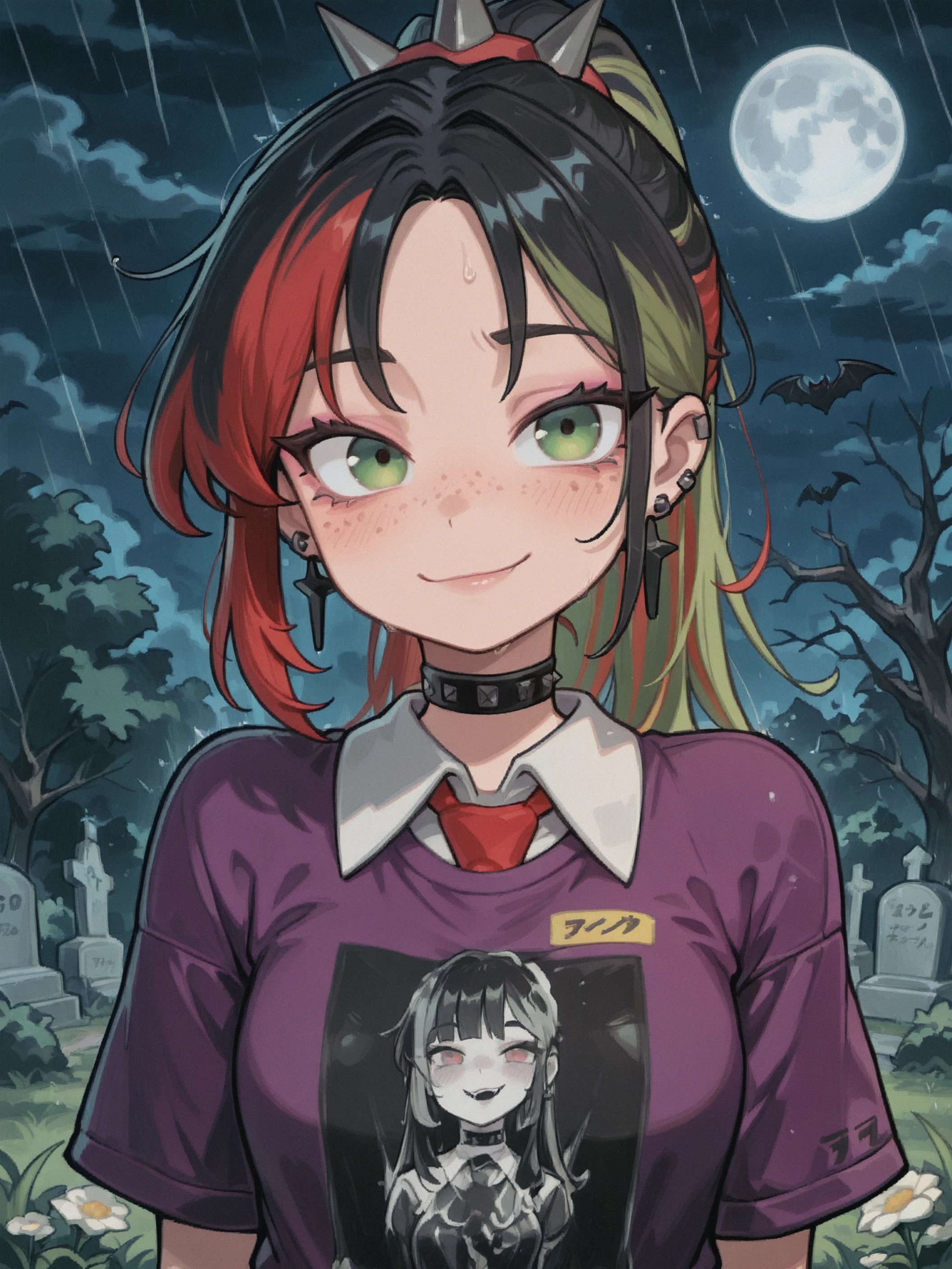 red spiked hairband, piercing, cross earrings, black studded choker, black necklace, chain necklace,