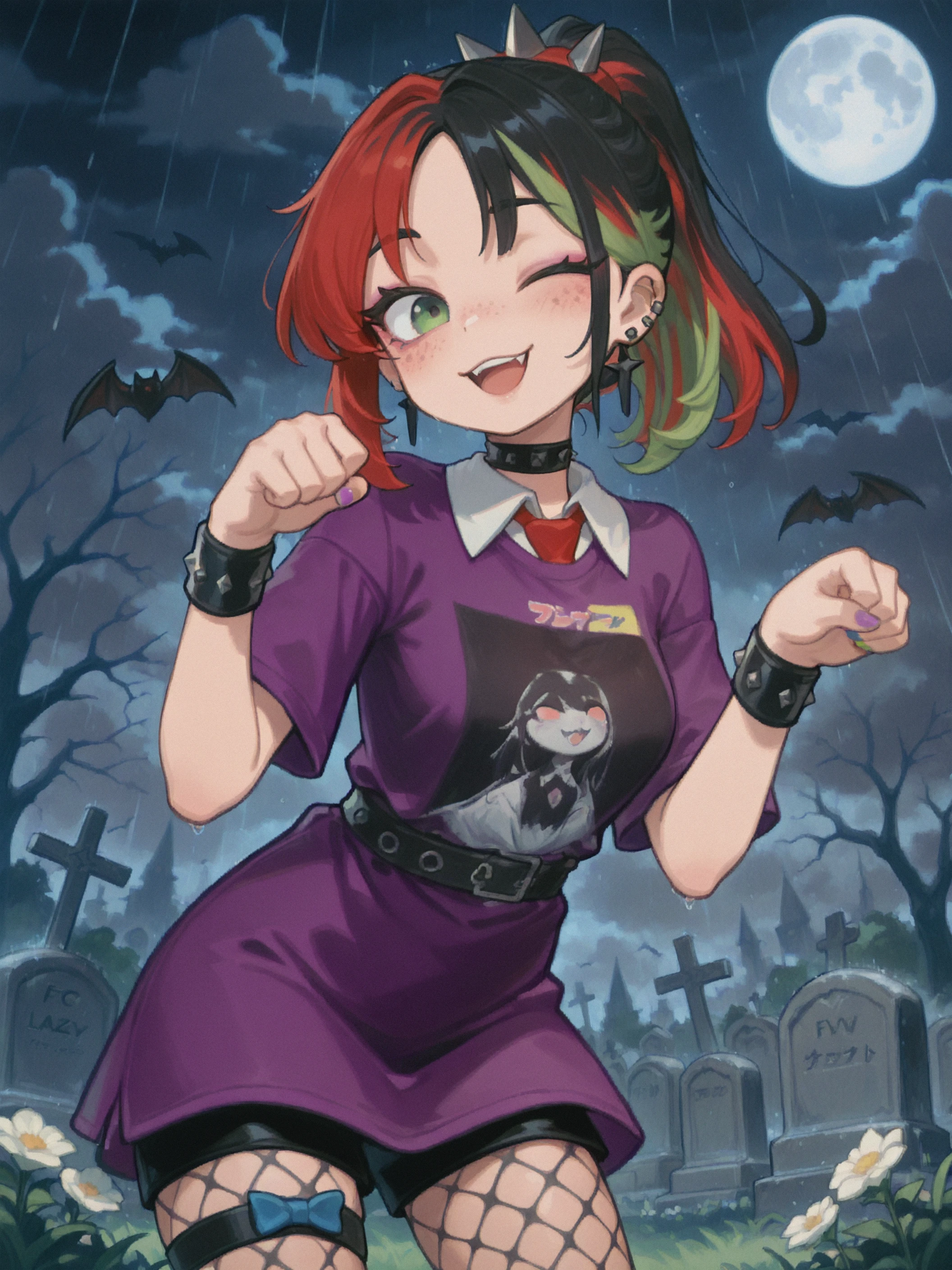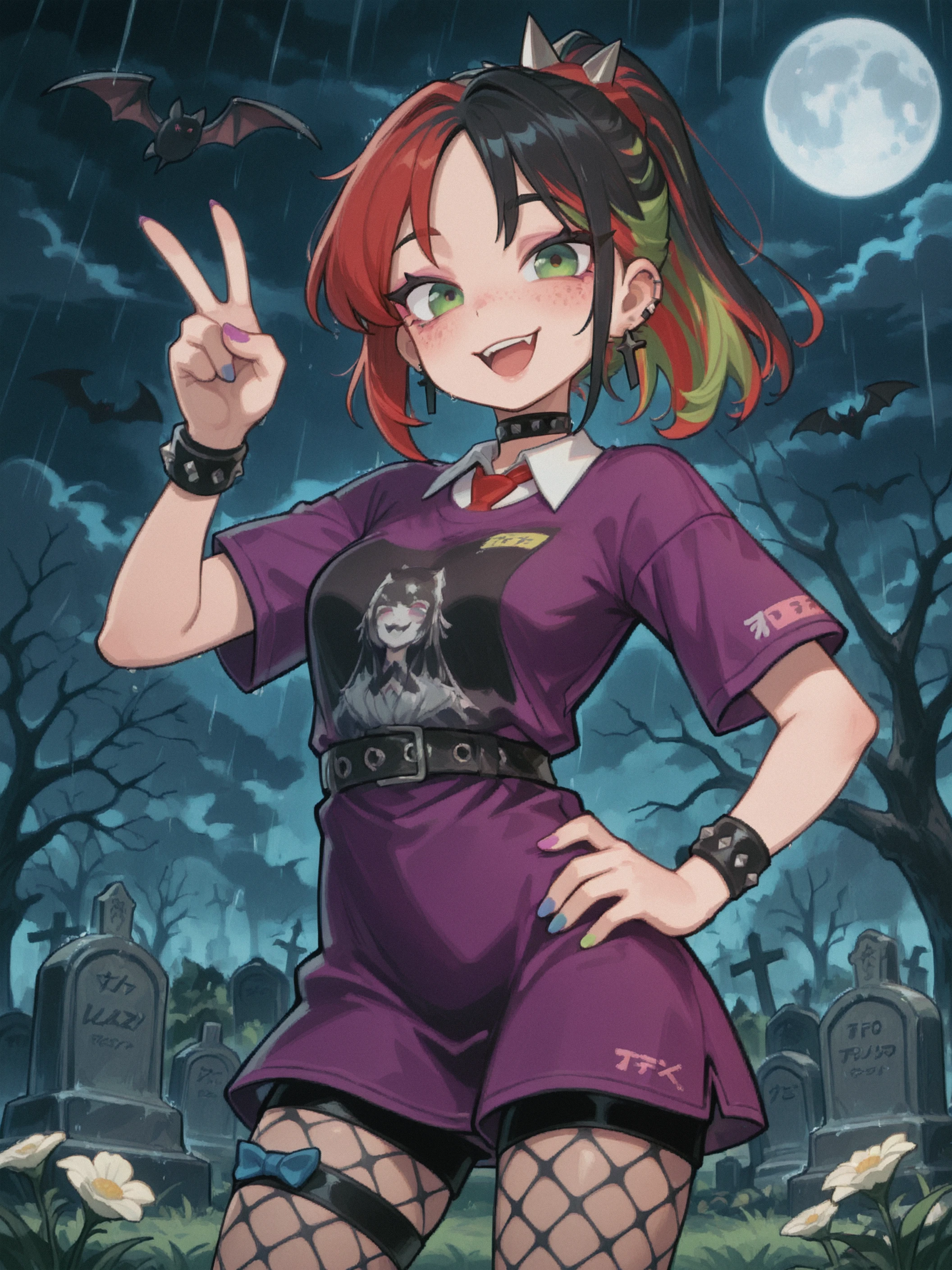 ponytail, fanged bangs, black hair | streaked hair | red hair | green hair,