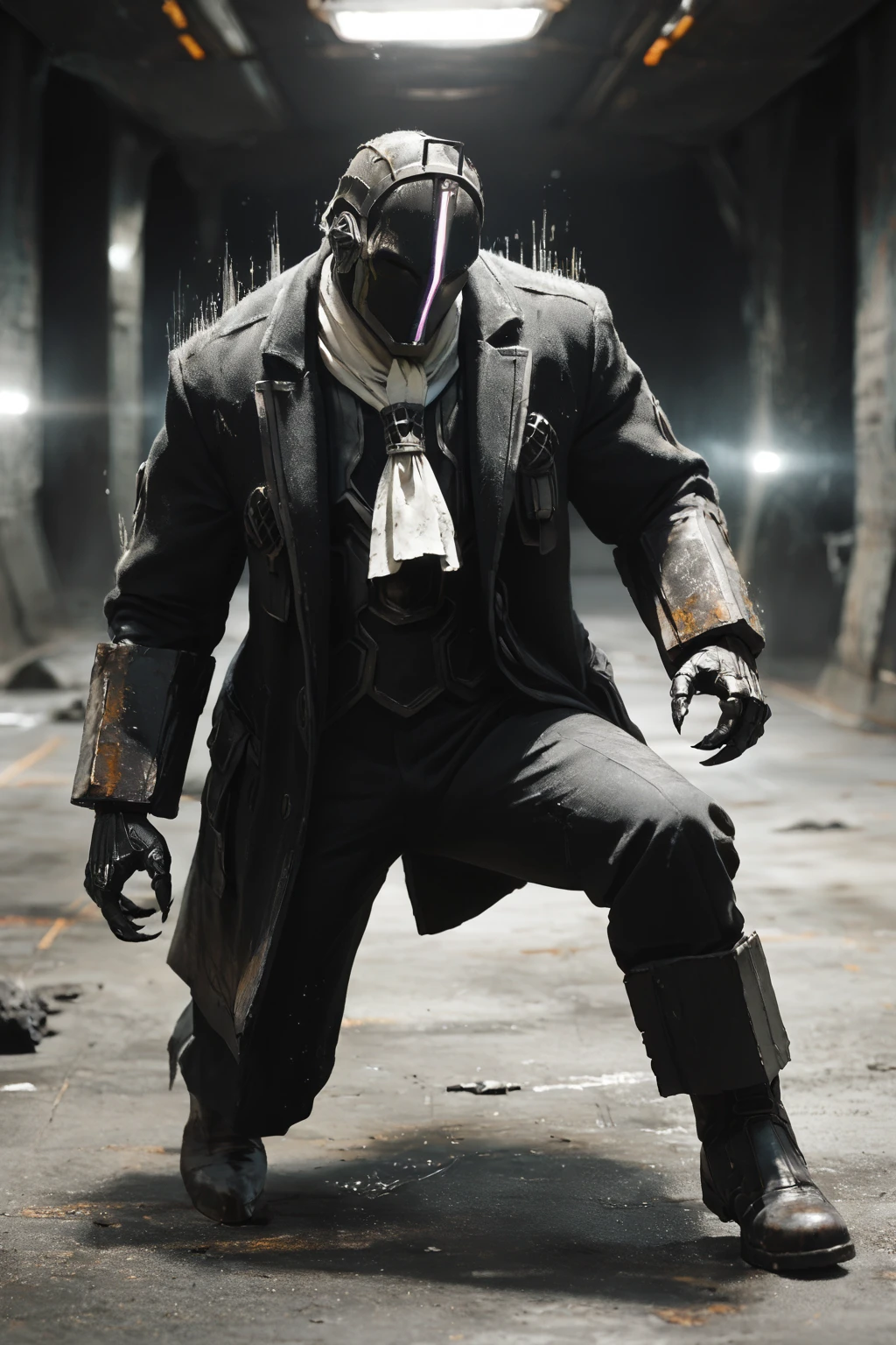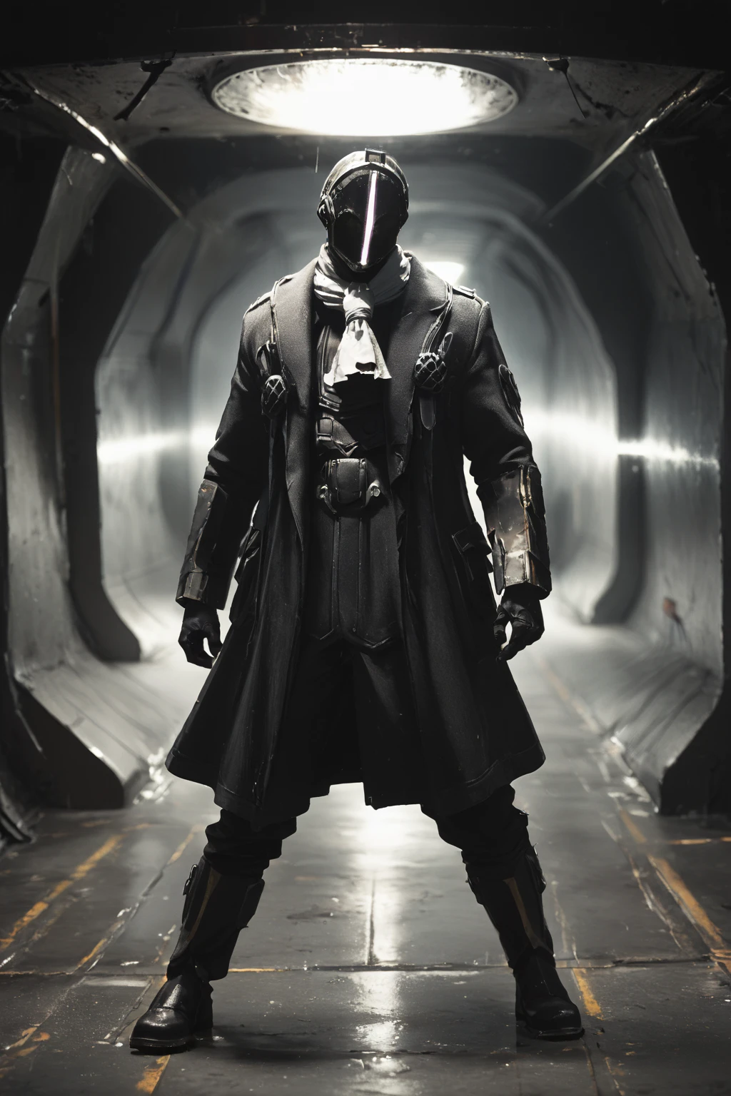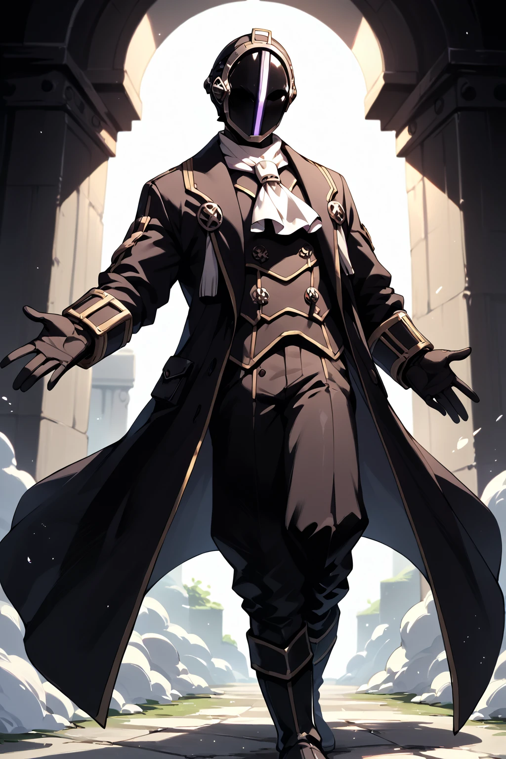 Triggers: Bondrewd, male, black coat, overcoat, ascot, black gloves, helmet, masked, long sleeves, black boots, black pants, outstretched arms