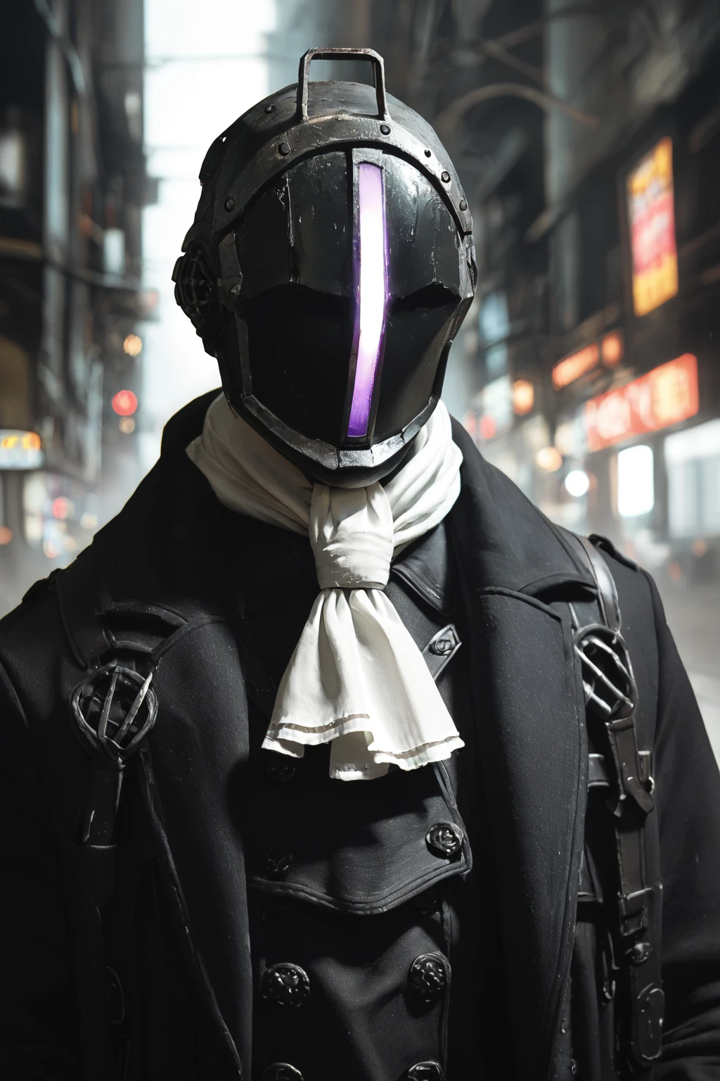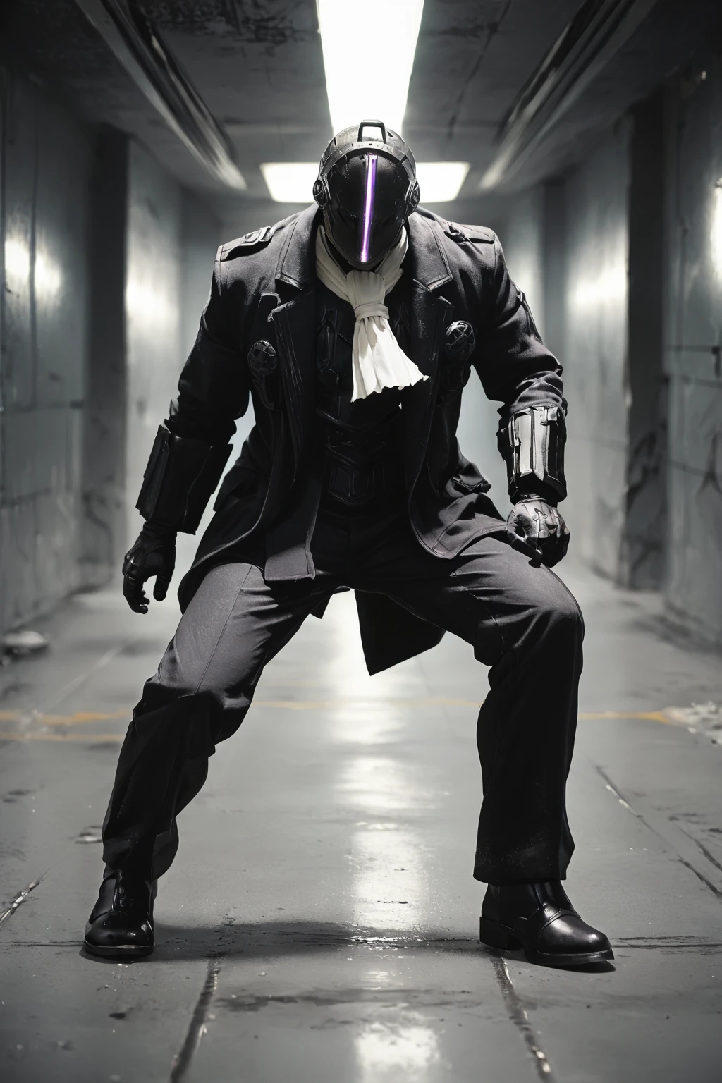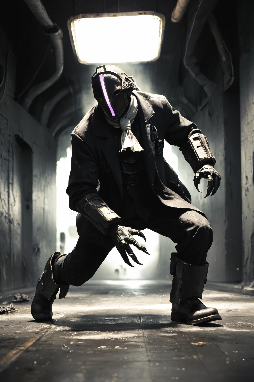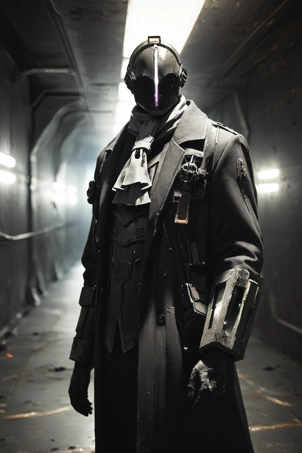 Triggers: Bondrewd, male, black coat, overcoat, ascot, black gloves, helmet, masked, long sleeves, black boots, black pants, outstretched arms